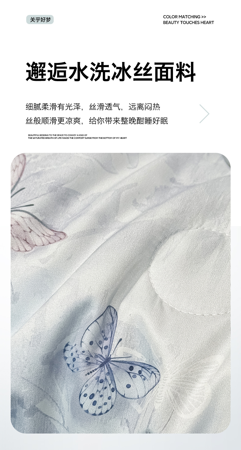 • 91家纺网 家纺一手货源 找家纺 笙意家纺 2025新款水洗冰丝数码印花拼角宽边夏被 古韵蝶音