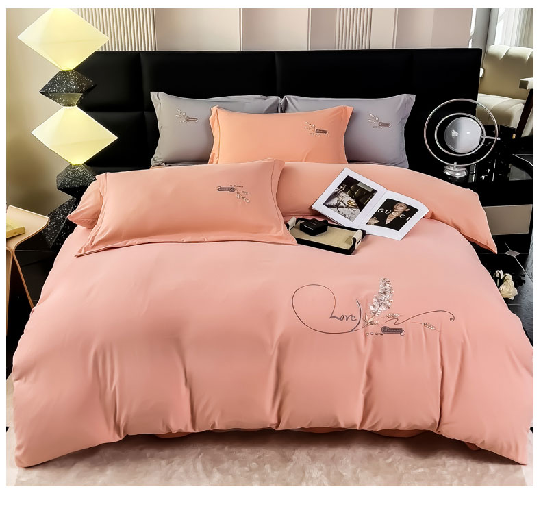 曲之慕 2025新品四季款高端刺绣四件套简约可水洗轻奢纯色刺绣四件套 大麦仙女粉