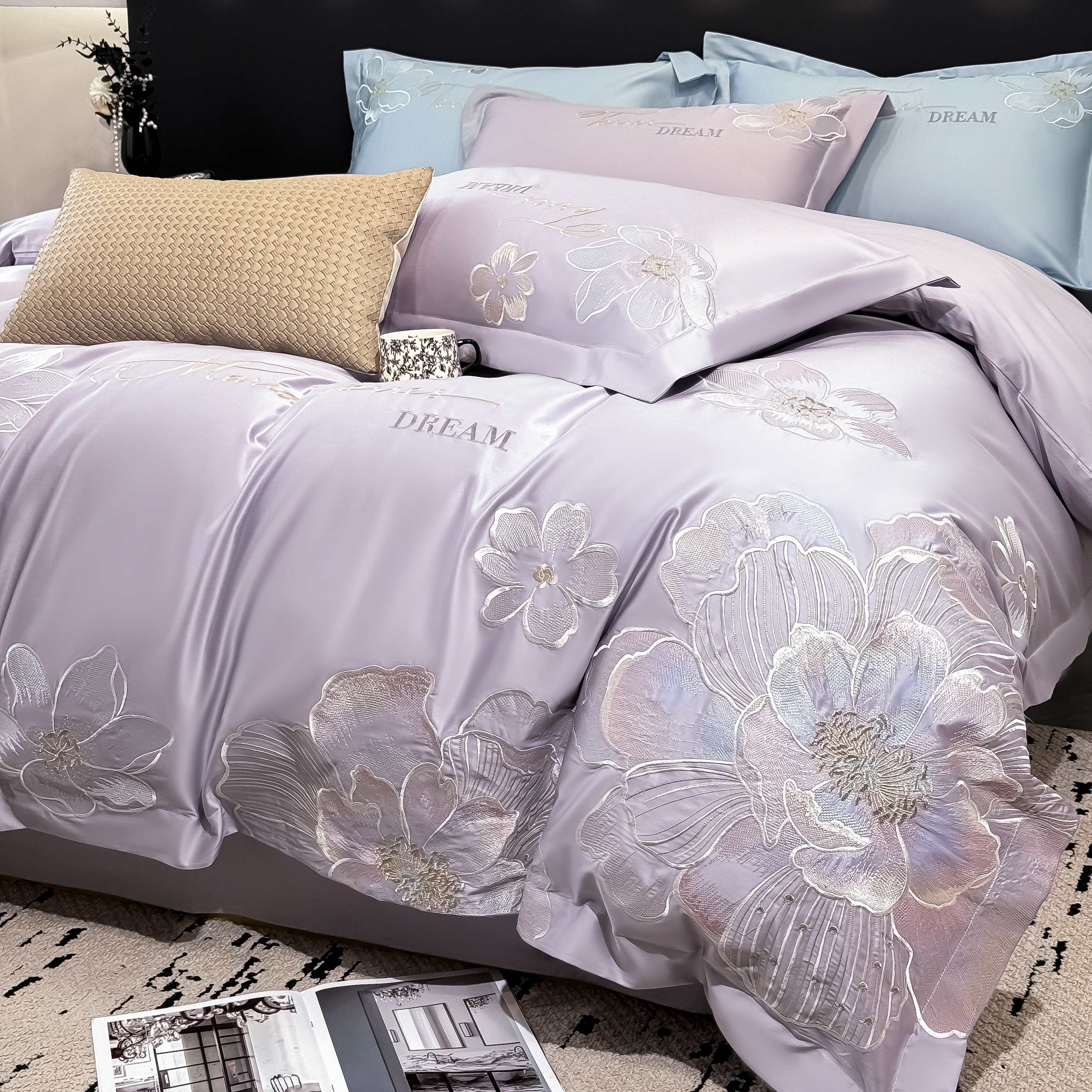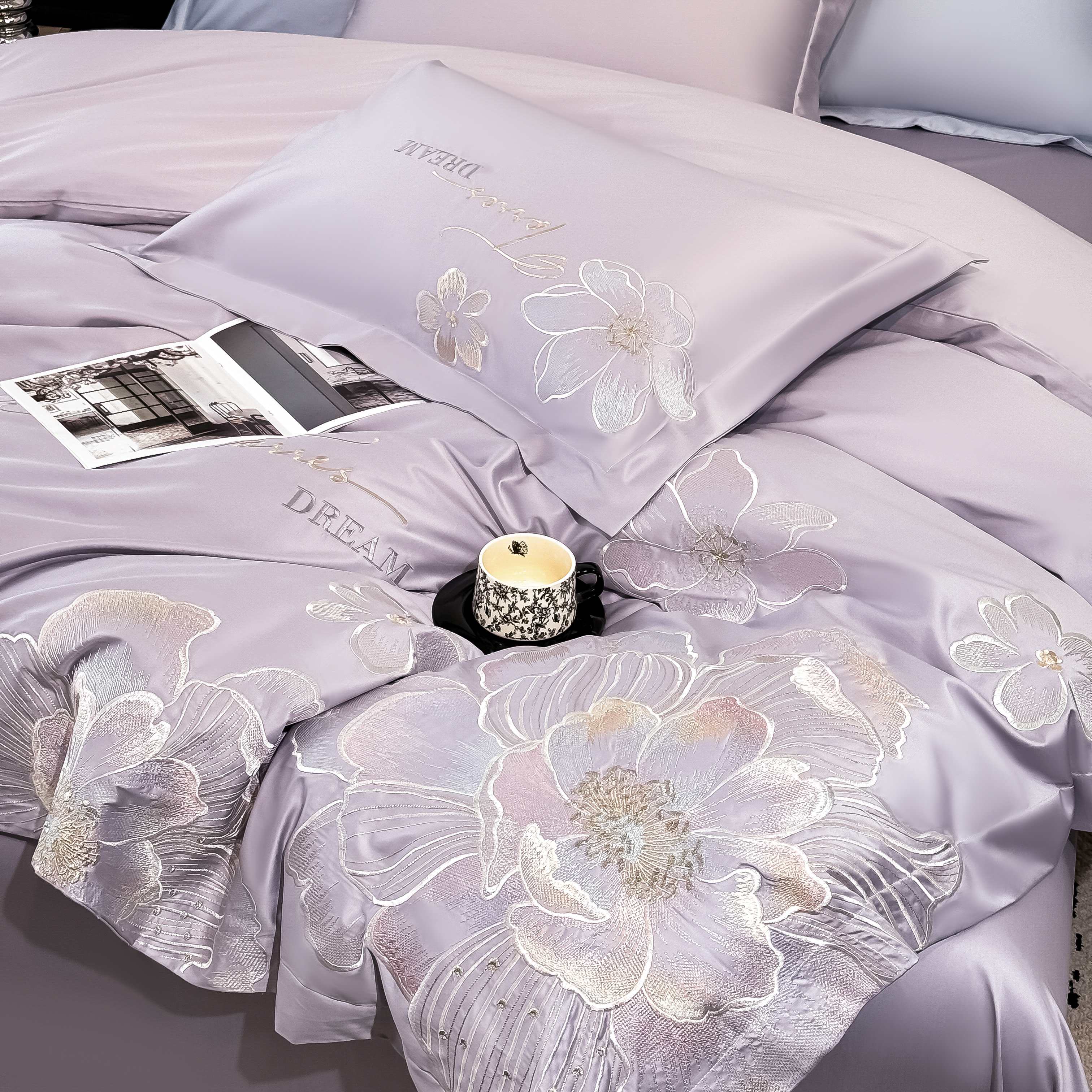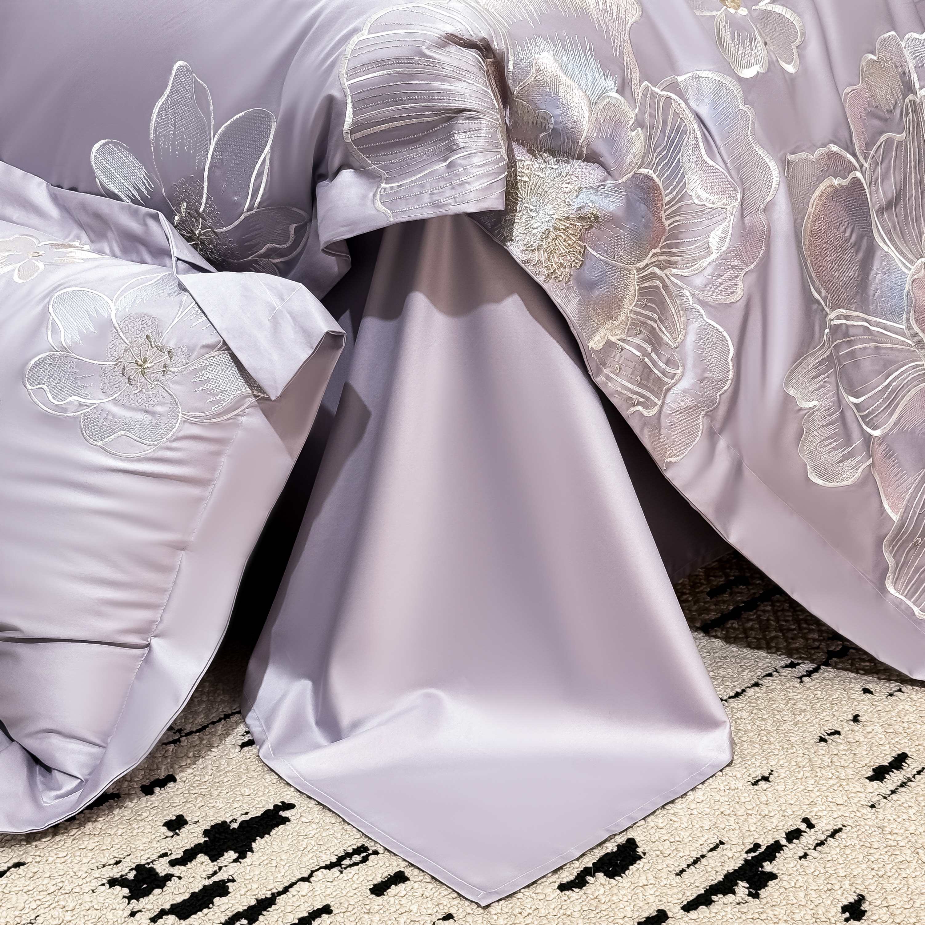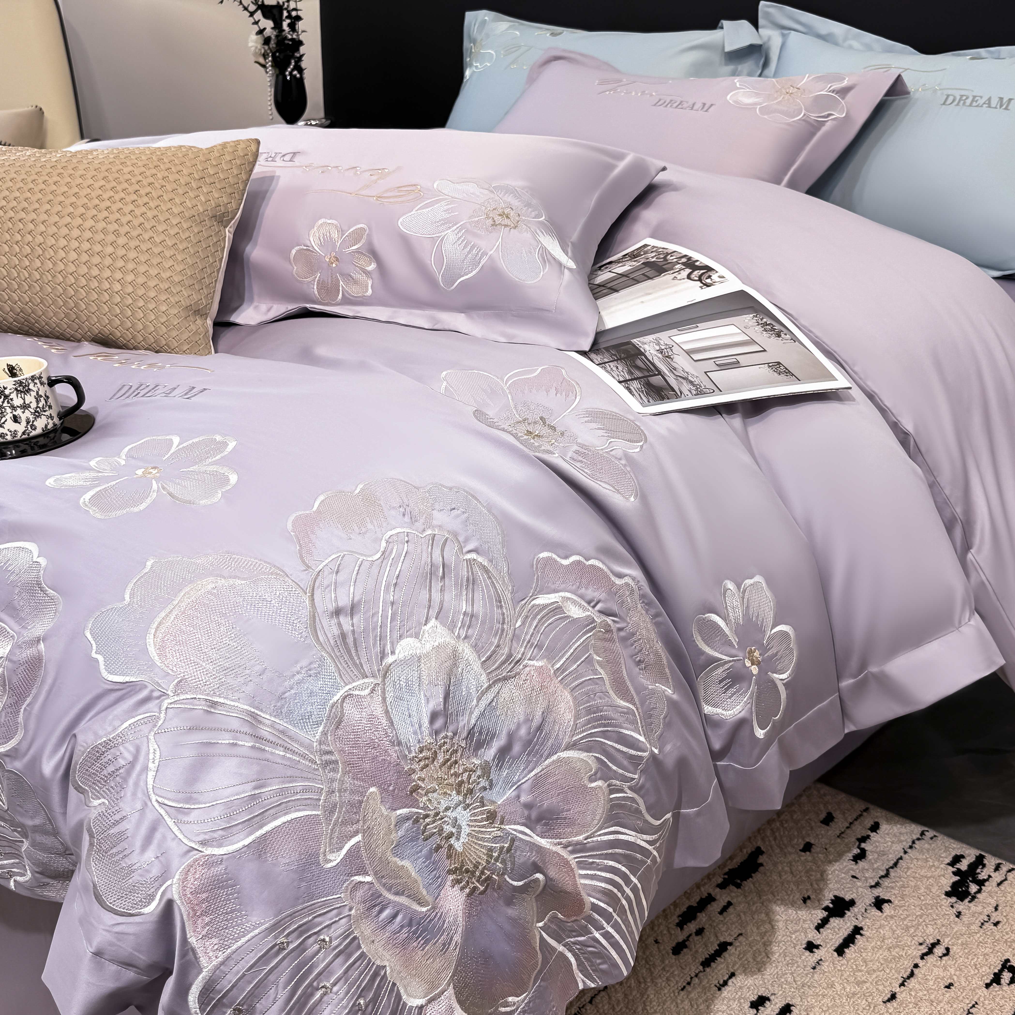 商品名称:水云缦 2025新款春夏新款全棉贡缎纯棉刺绣四件套 繁华系列 繁花-香芋紫