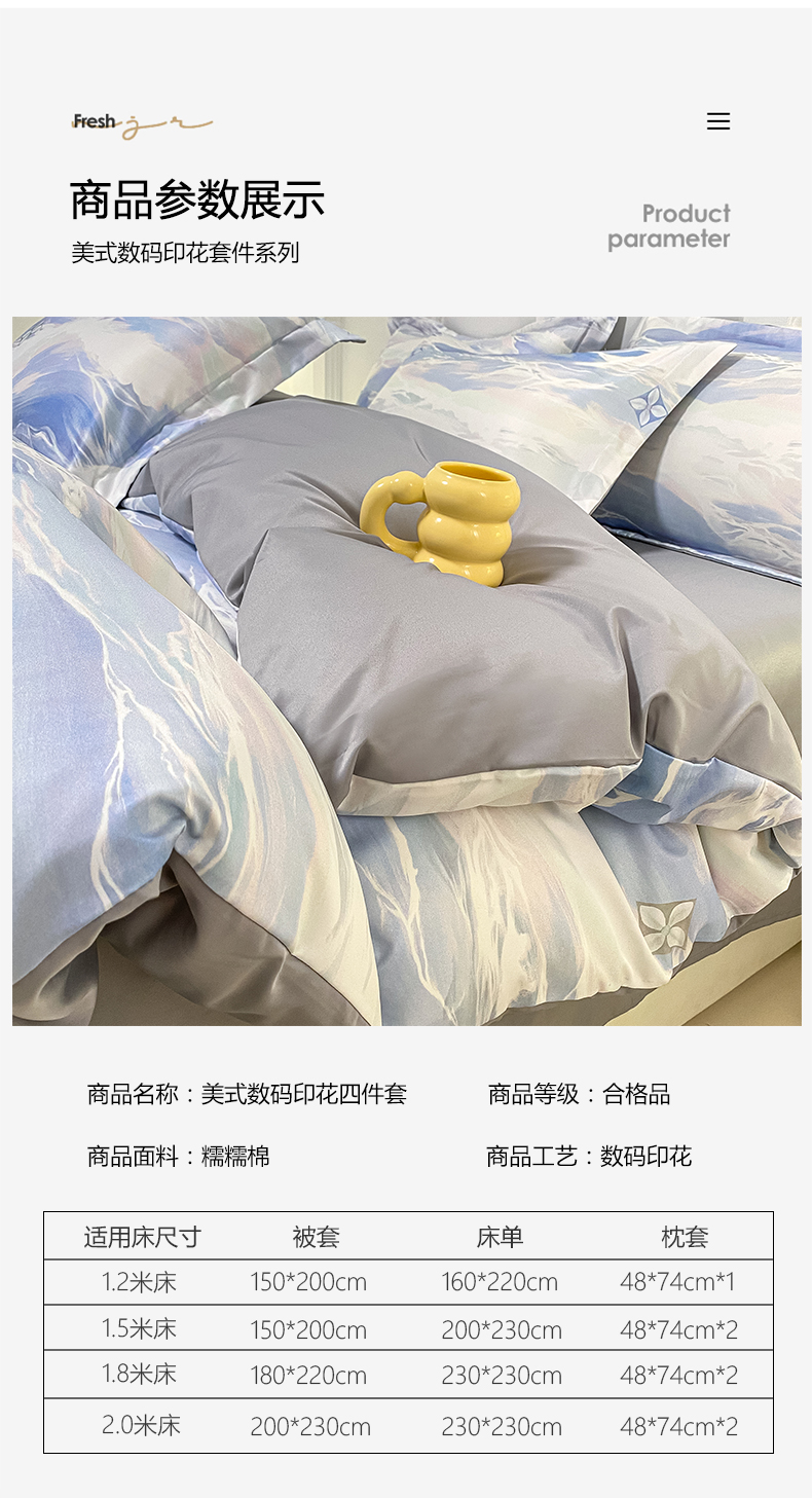 商品名称:2025新款水洗冰丝美式数码印花四件套轻奢时尚北欧风床上用品学生宿舍三四件套 紫云蓝