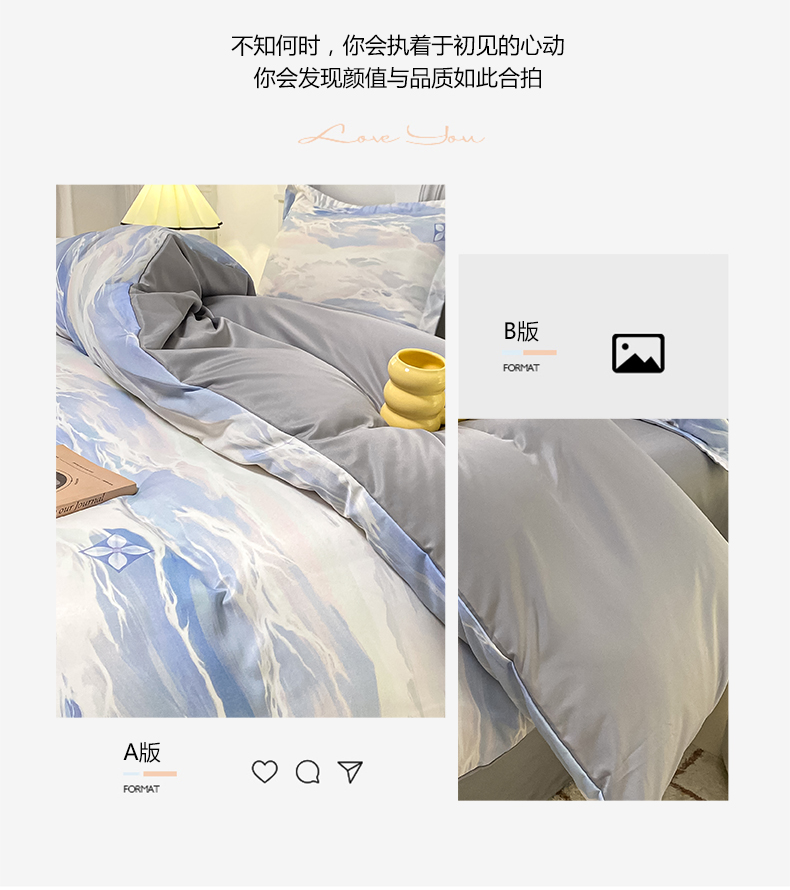 2025新款水洗冰丝美式数码印花四件套轻奢时尚北欧风床上用品学生宿舍三四件套 紫云蓝