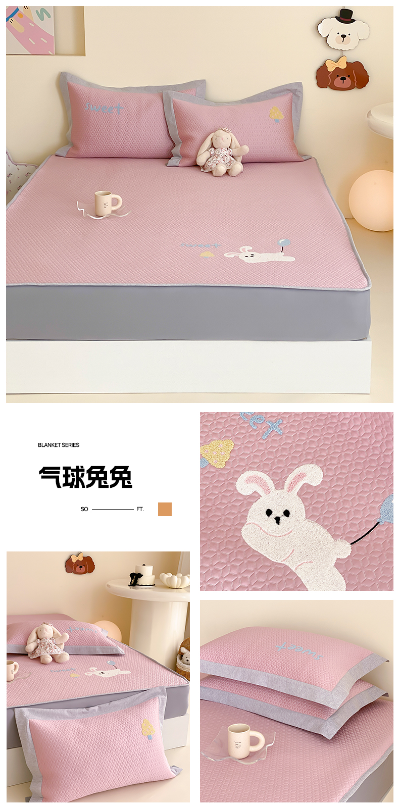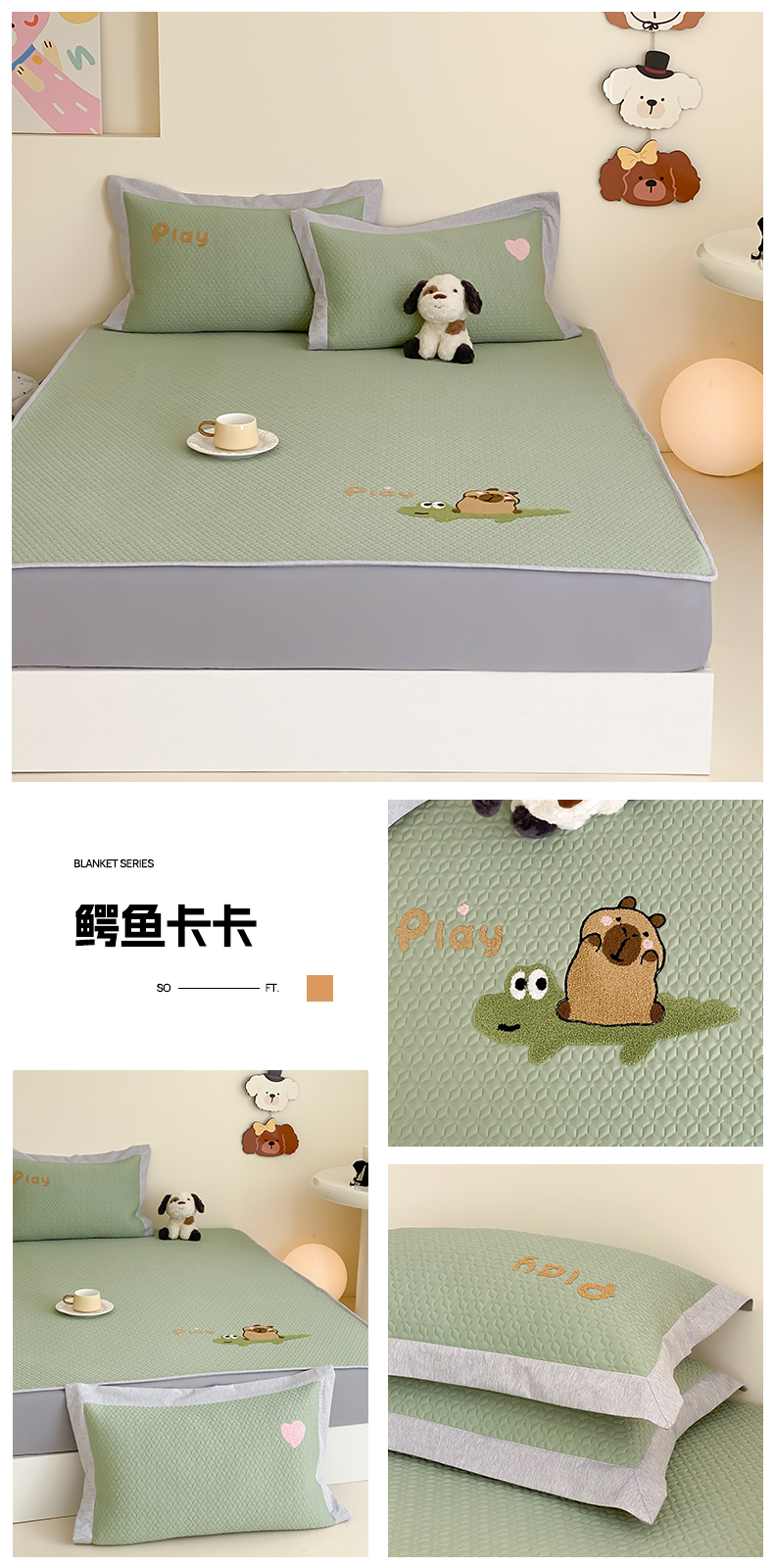 (总)由有家居 2025新款原创新品A类PE高凉感分子卡通毛巾绣豆豆凉席三件套,蛋糕熊,鳄鱼卡卡,咖啡猫,气球兔兔,三个伙伴