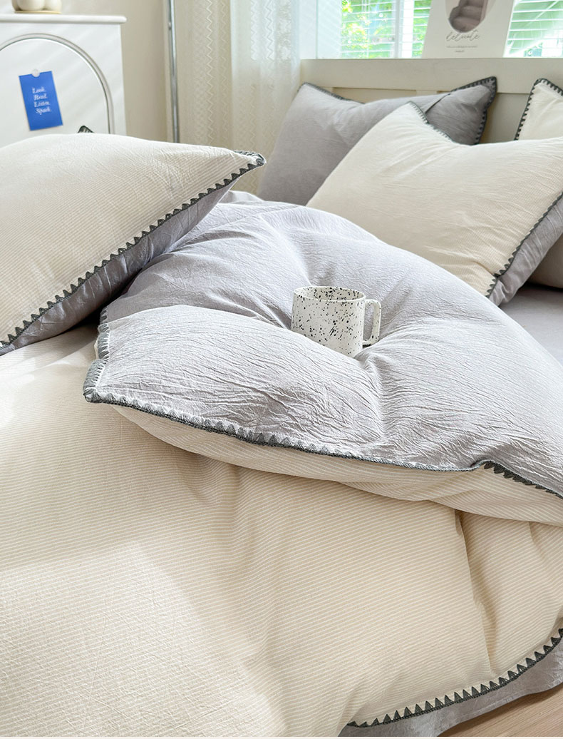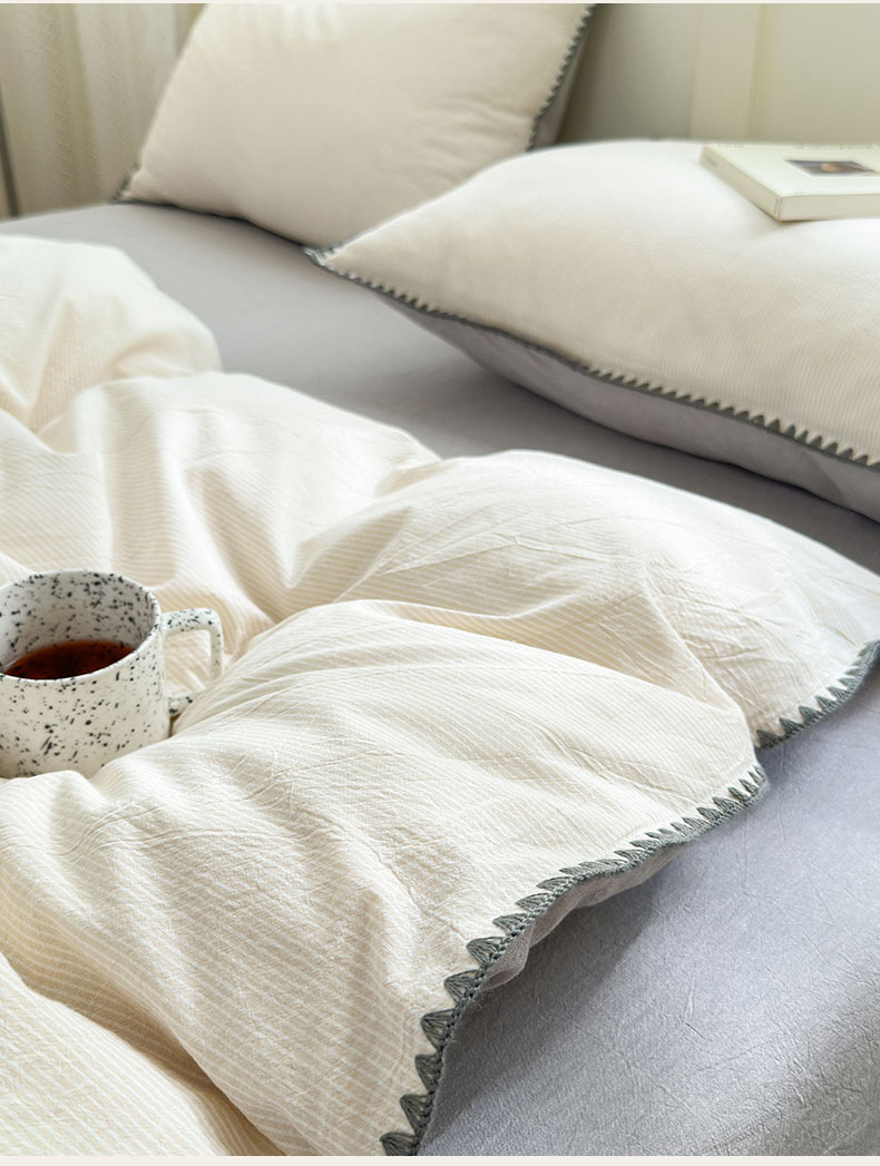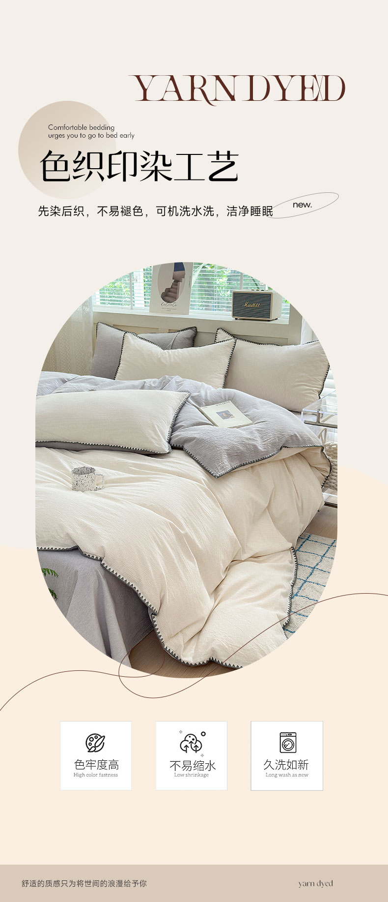 当前位置: 91家纺网 > 商品网购 > 床品套件 > 四件套 > 全棉普通四件套 > 晚依家纺 2025新款A类全棉色织水洗棉被套单件格子条纹四件套学生宿舍被罩三件套定制定做 时光-米灰