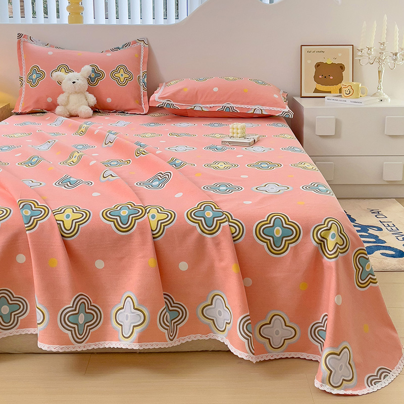 宜家坊 2025新款春夏原棉鱼骨棉老粗布花边印花床单软凉席三件套 四叶草-玉