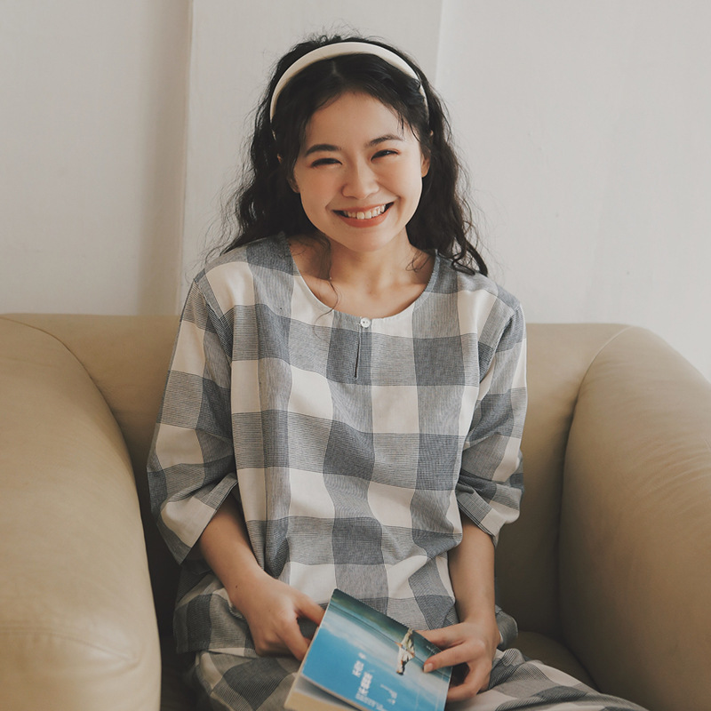 良品汇馆 2025新款日系无印双层纱家居服良品女士七分袖家居服套装全棉格纹套头睡衣 千鸟格-灰
