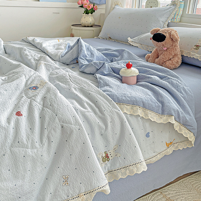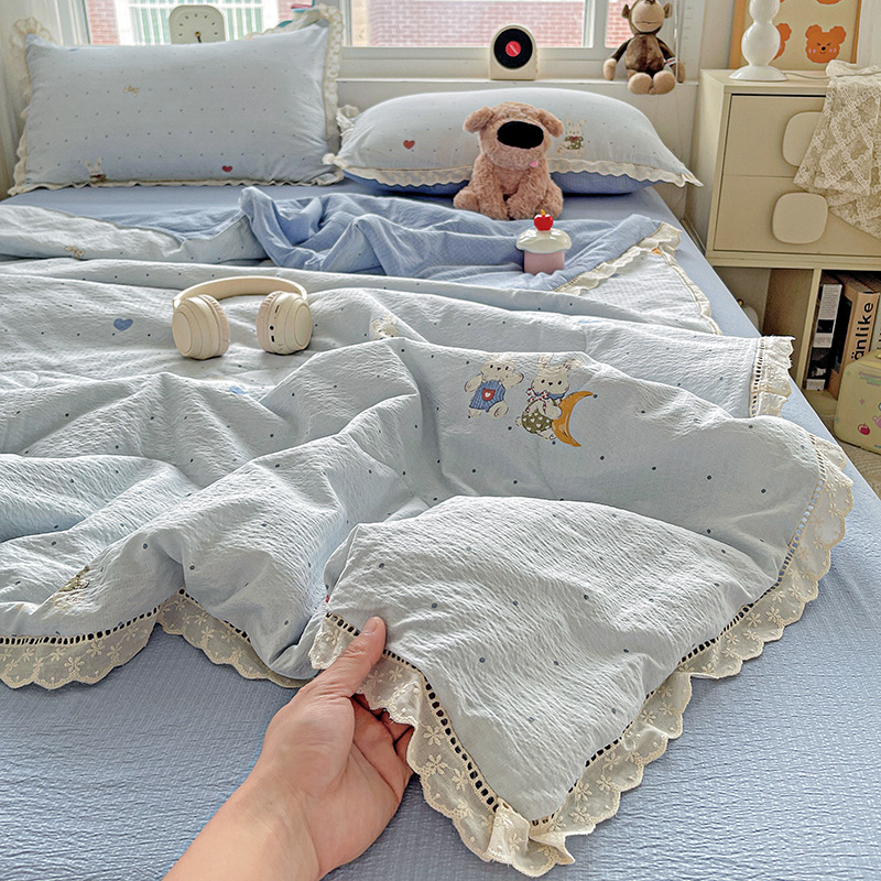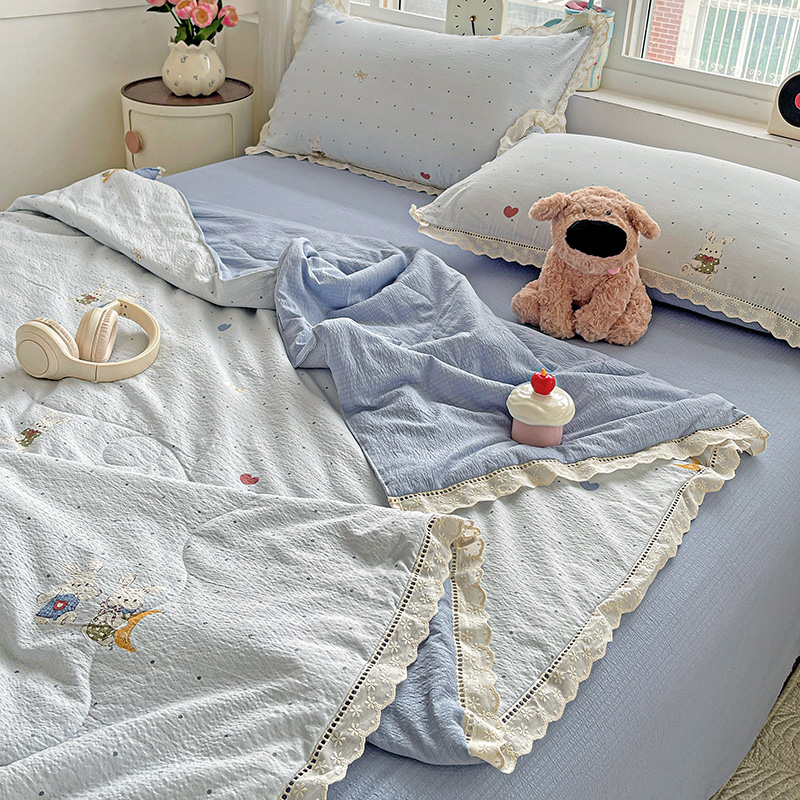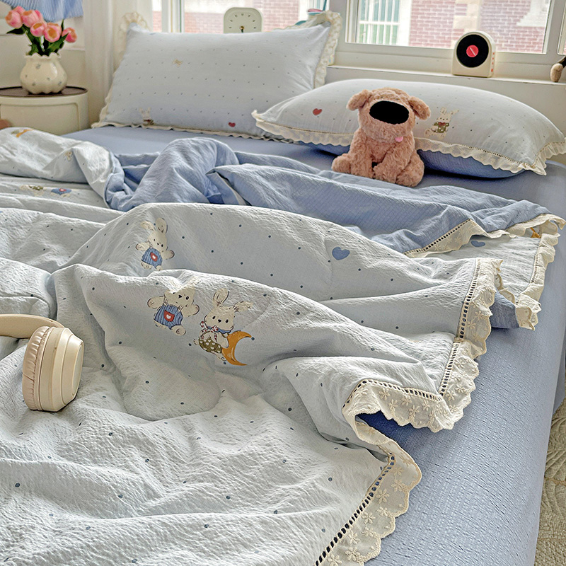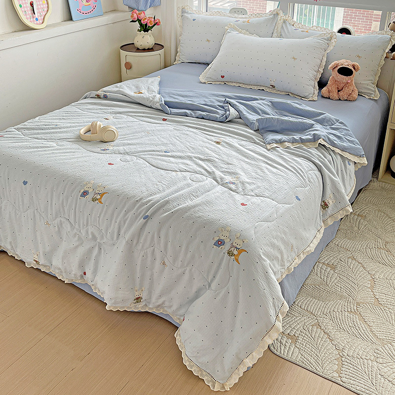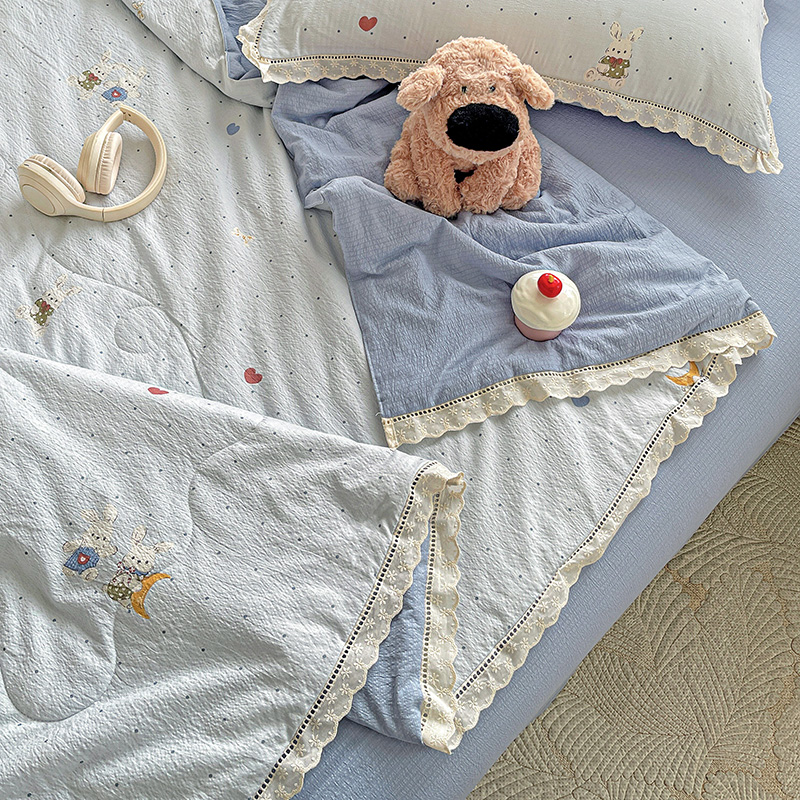 当前位置: 91家纺网 > 商品网购 > 床品套件 > 四件套 > 夏被四件套 > 一比一家纺 2025新款云感皱皱纱全棉花边款夏被四件套【控价109元】波点小兔兰