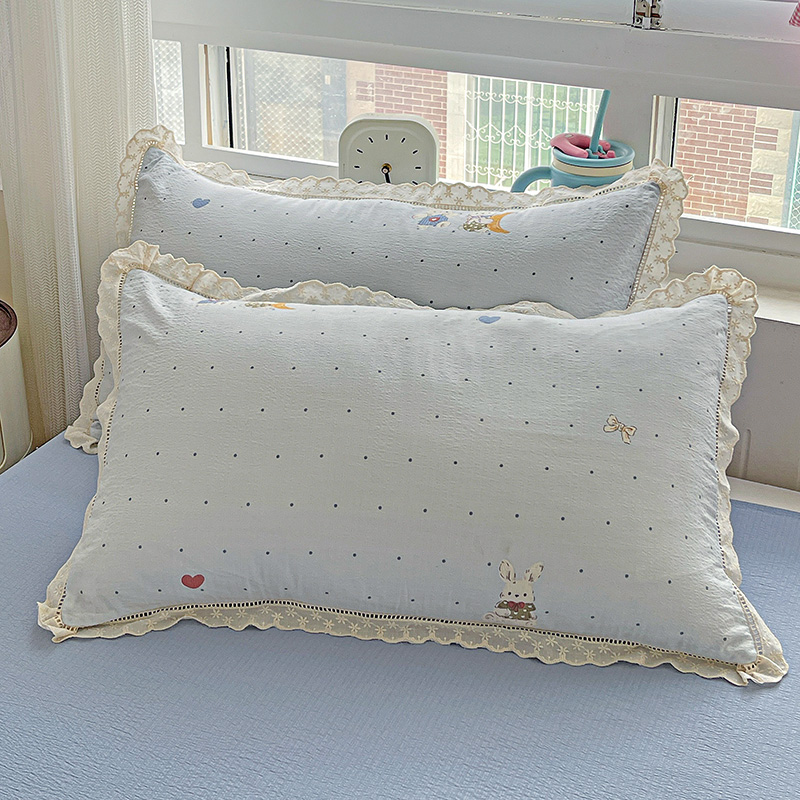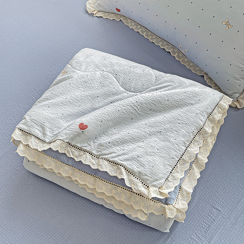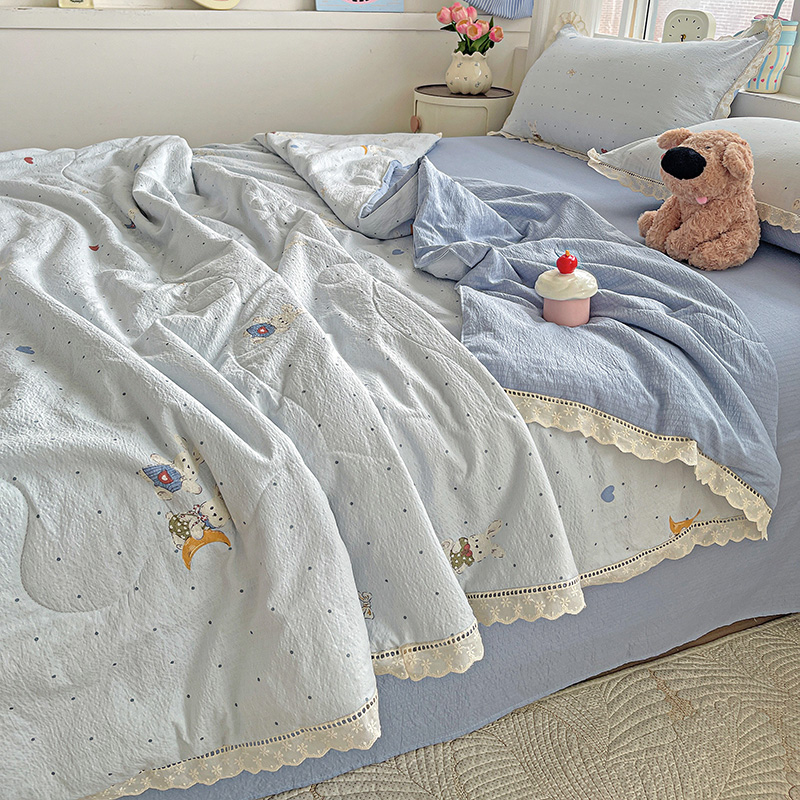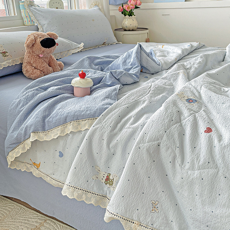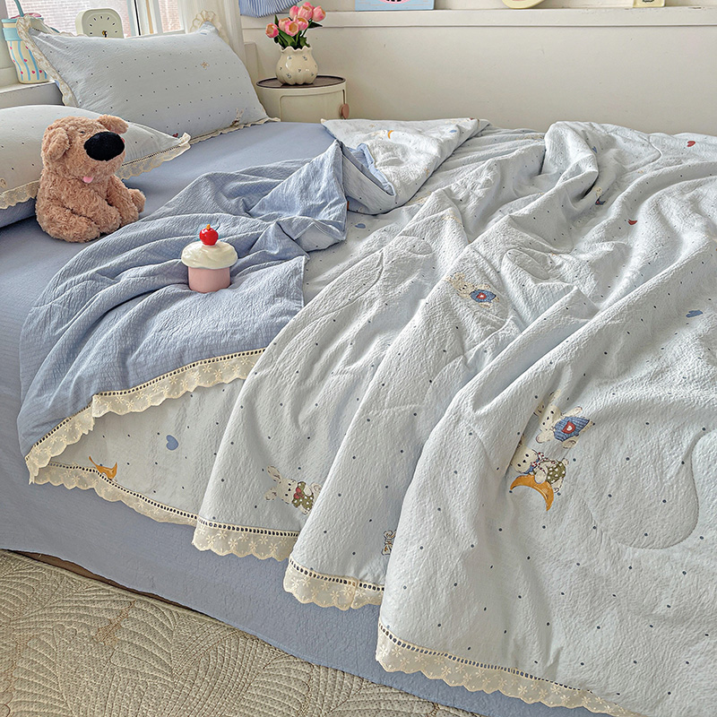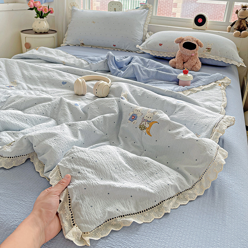 当前位置: 91家纺网 > 商品网购 > 床品套件 > 四件套 > 夏被四件套 > 一比一家纺 2025新款云感皱皱纱全棉花边款夏被四件套【控价109元】波点小兔兰
