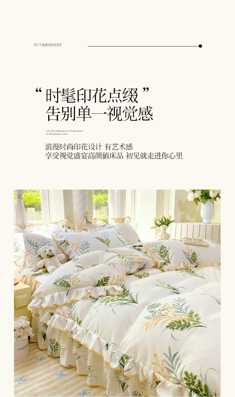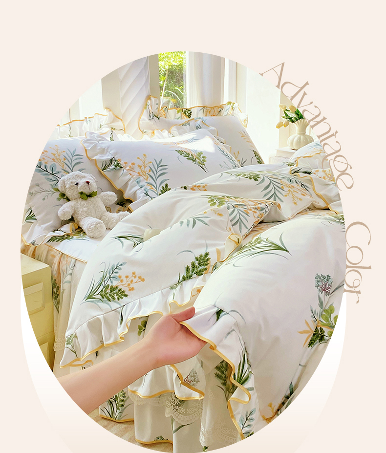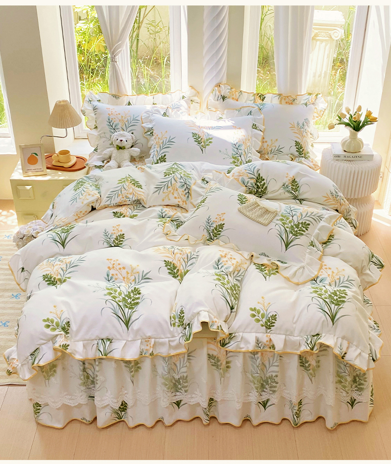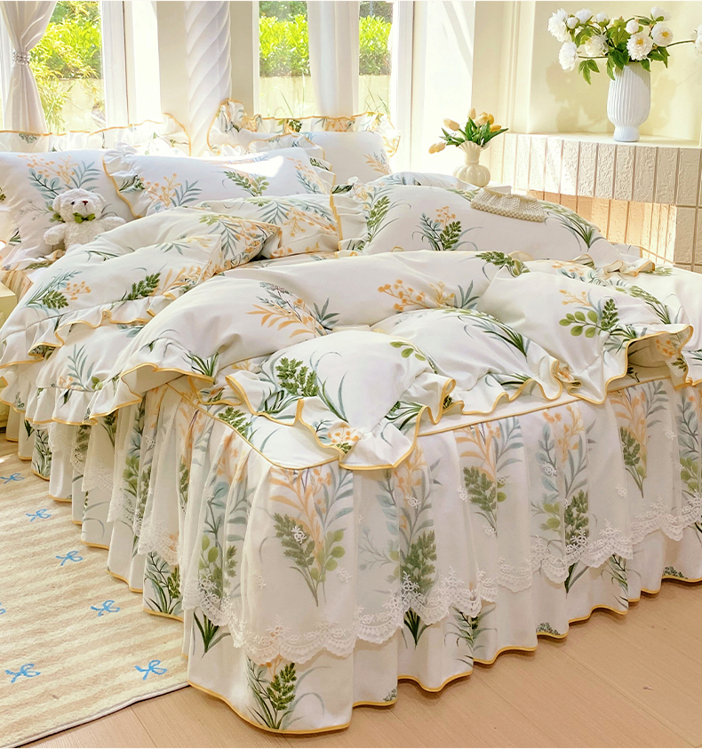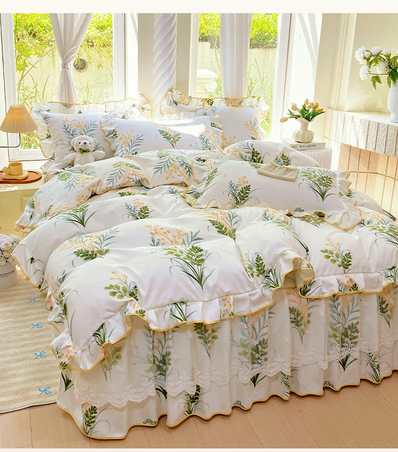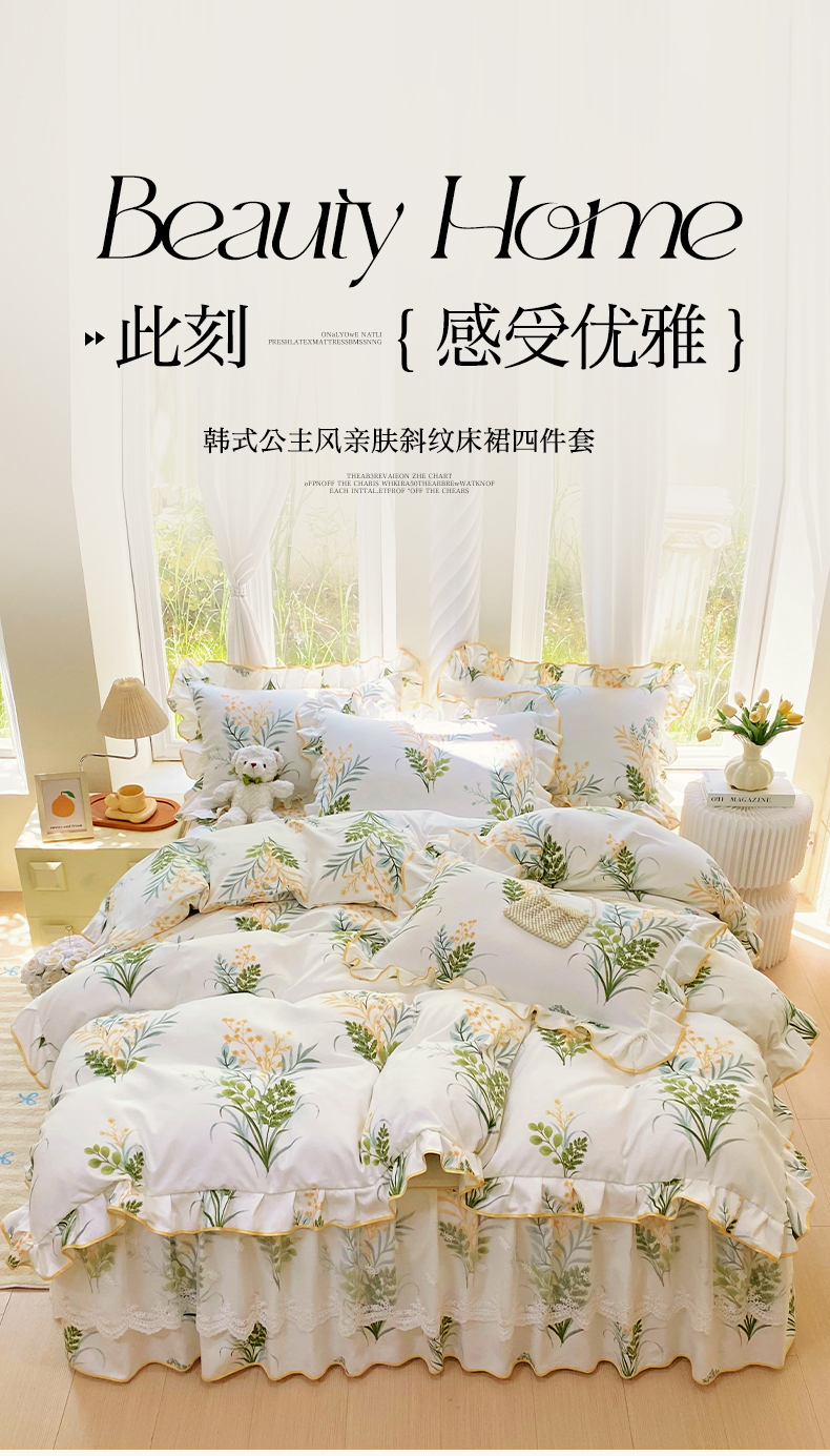 • 91家纺网 家纺一手货源 找家纺 雨彤家纺 2025新款高克重韩式公主风亲肤斜纹床裙四件套 斐叶花影-公主风