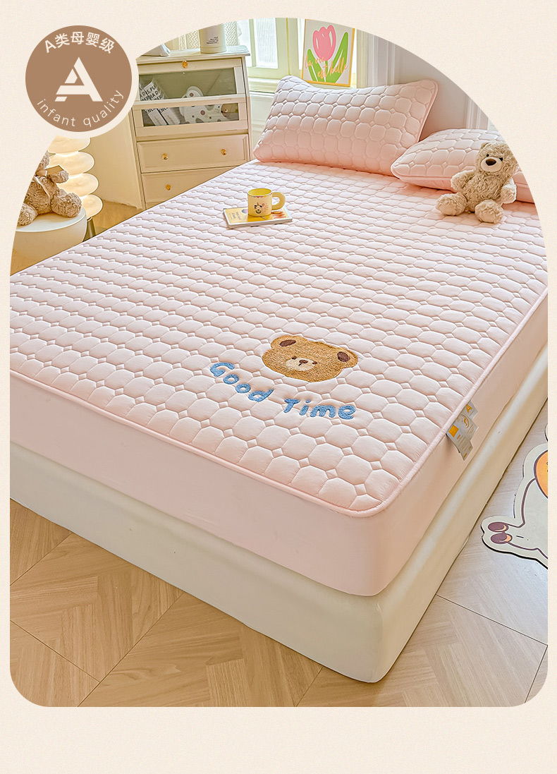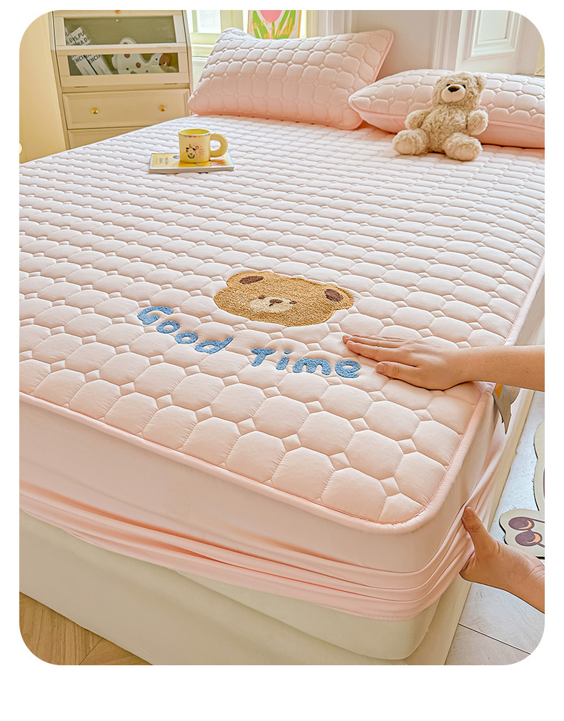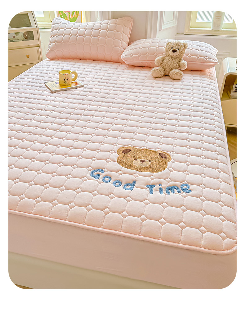 雯豆家纺 2025新品刺绣款毛巾绣夹棉床笠三件套纯色素色床护垫保护套 笨笨熊-密合粉