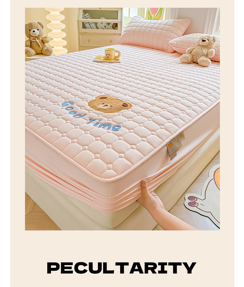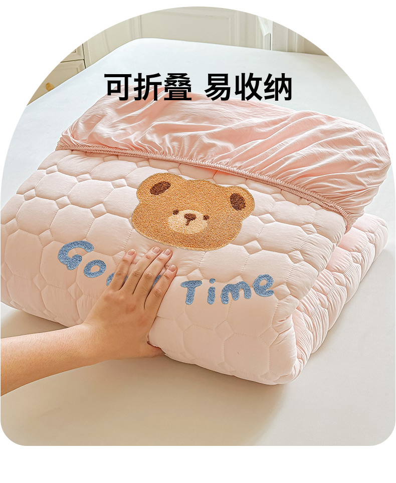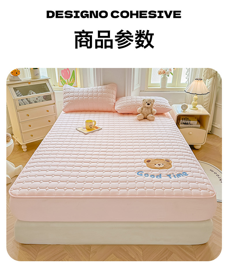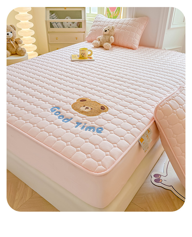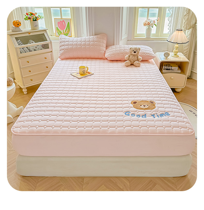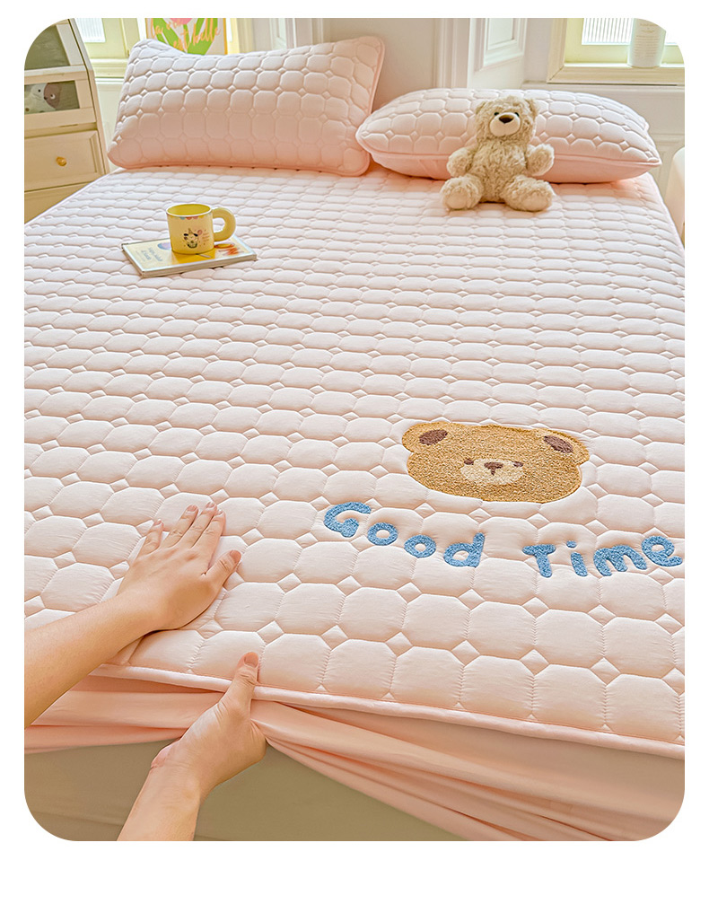 • 91家纺网 家纺一手货源 找家纺 雯豆家纺 2025新品刺绣款毛巾绣夹棉床笠三件套纯色素色床护垫保护套 笨笨熊-密合粉