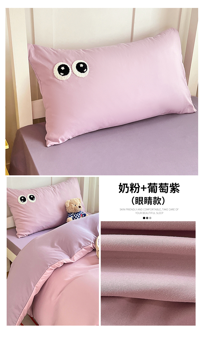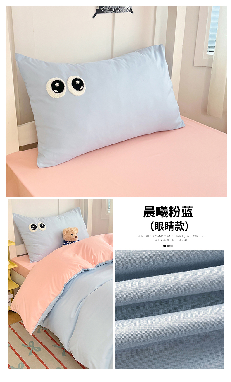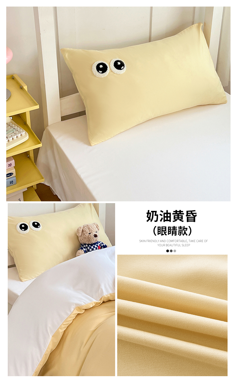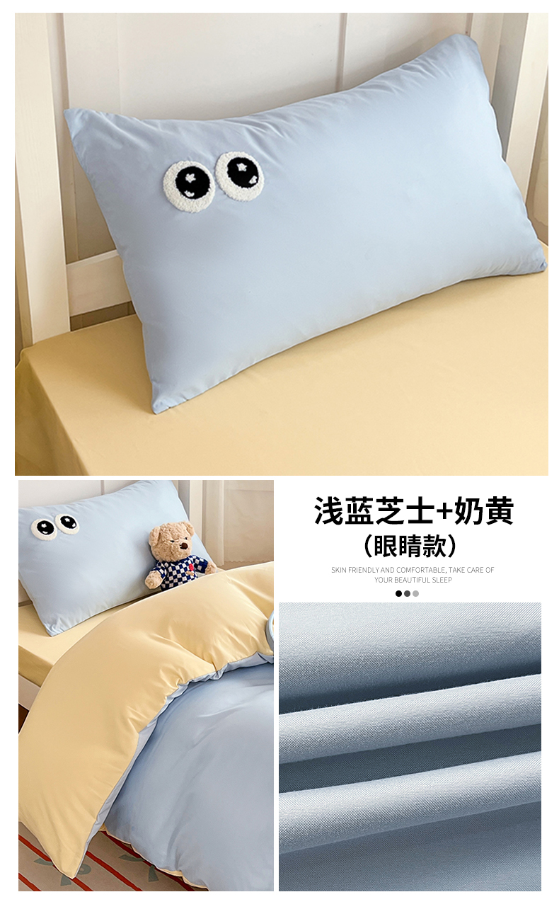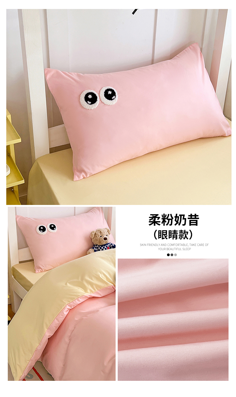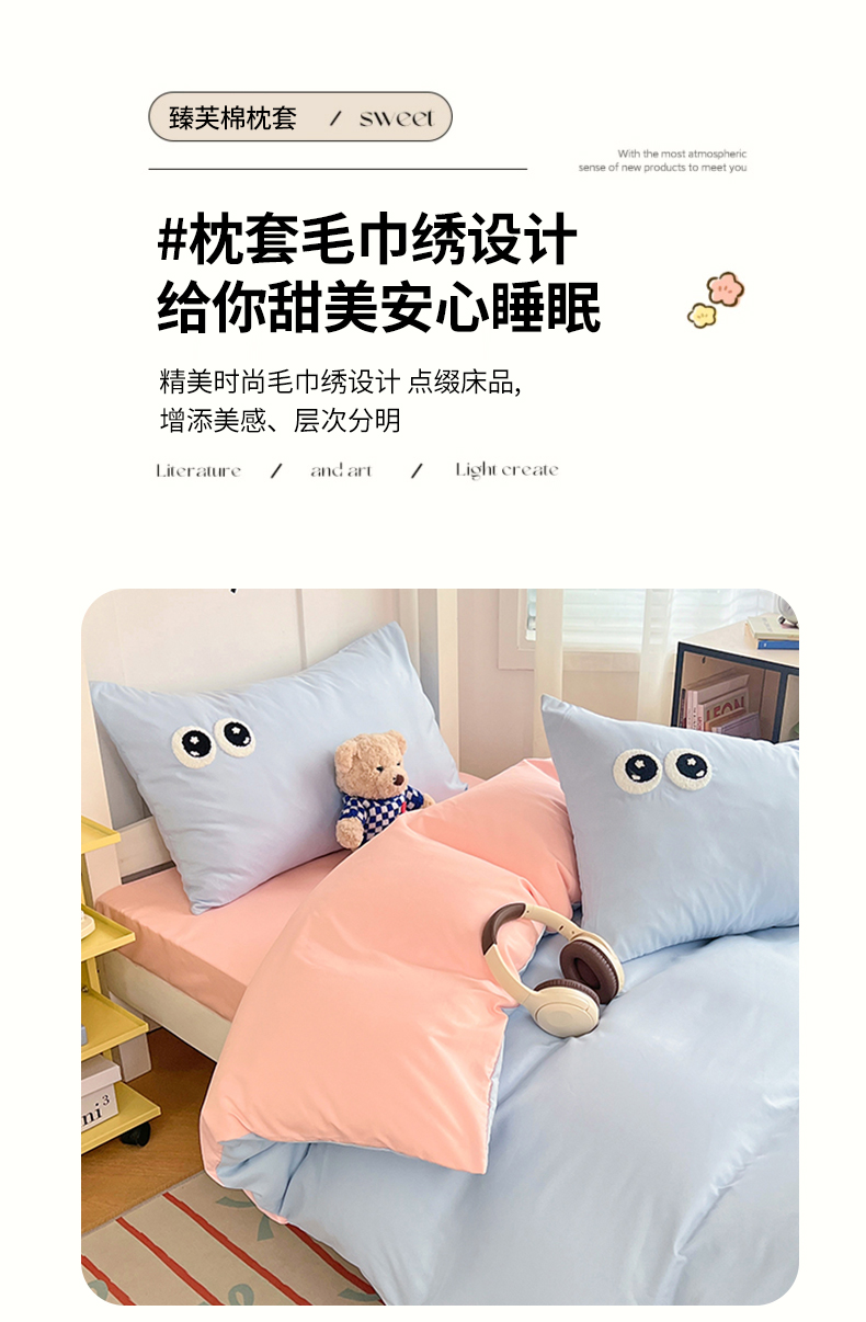 商品名称:(总)2025新款多巴胺大眼睛毛巾绣纯色水洗棉双拼学生宿舍单枕套三件套寝室四件套四季款