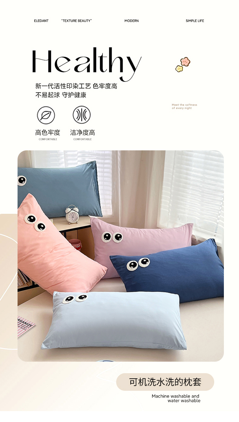 (总)2025新款多巴胺大眼睛毛巾绣纯色水洗棉双拼学生宿舍单枕套三件套寝室四件套四季款