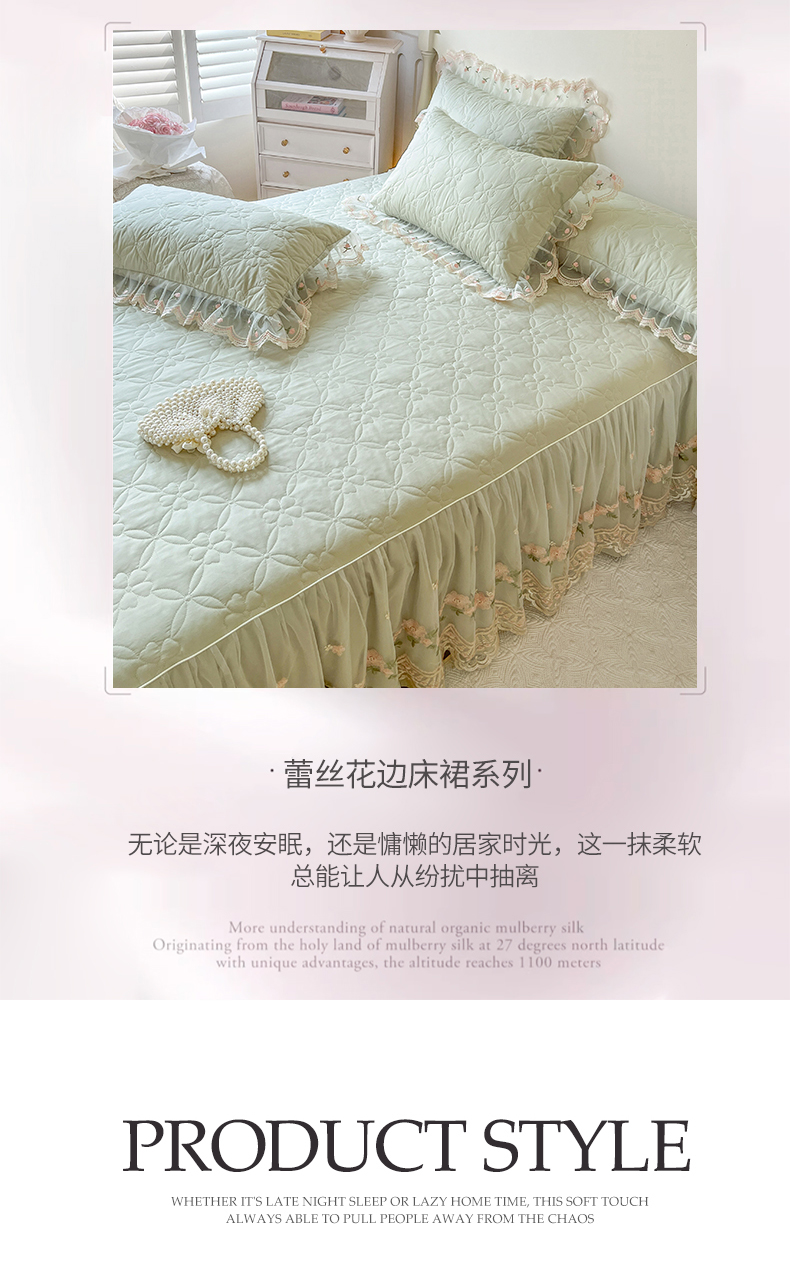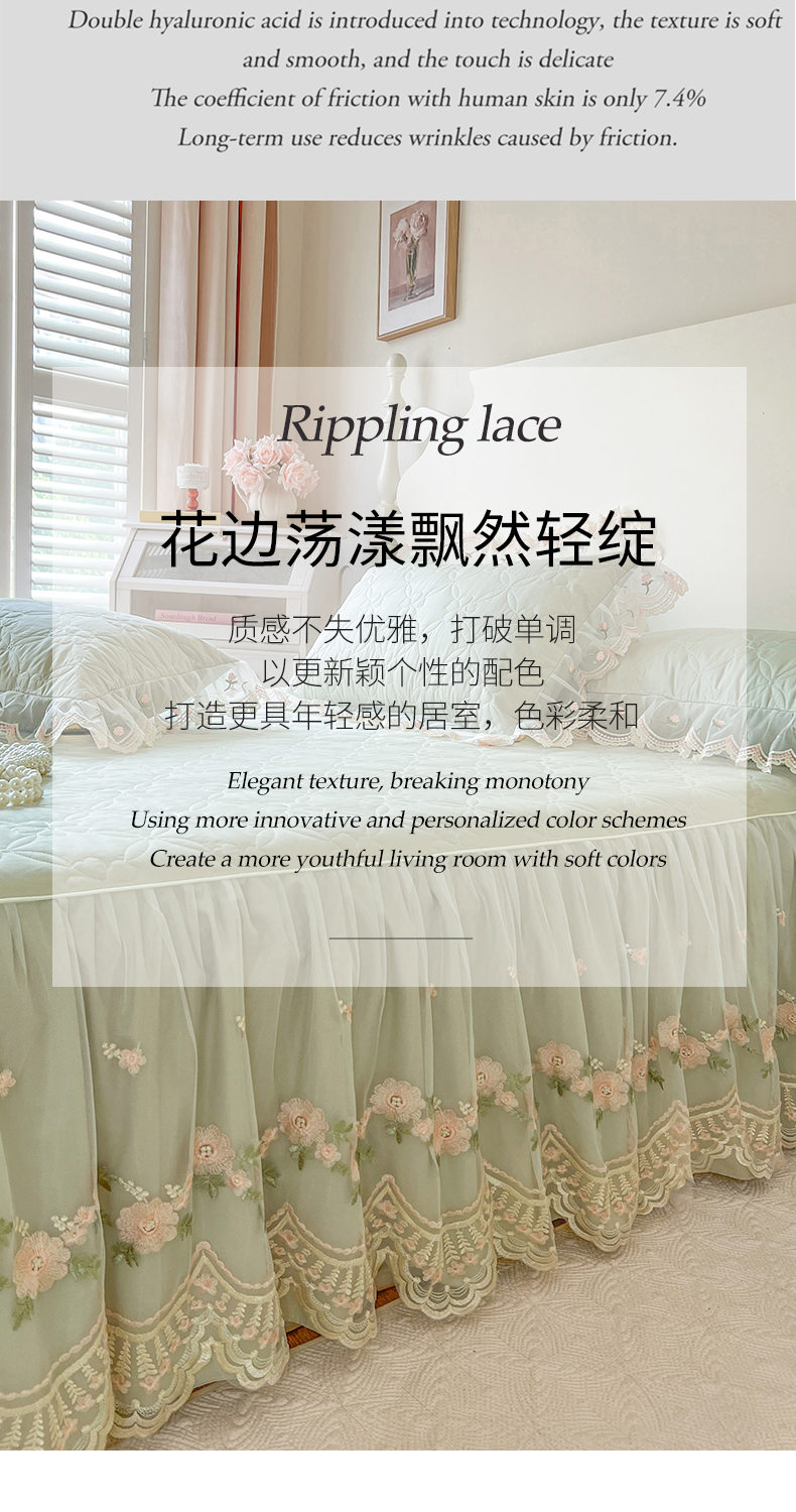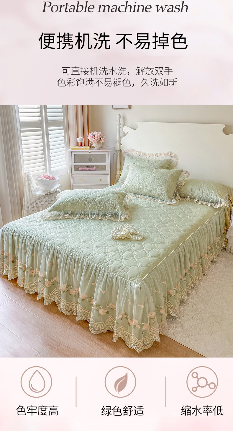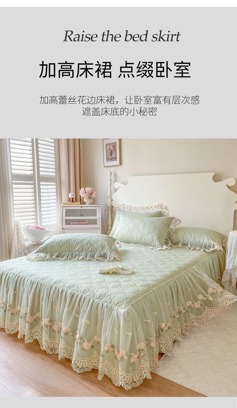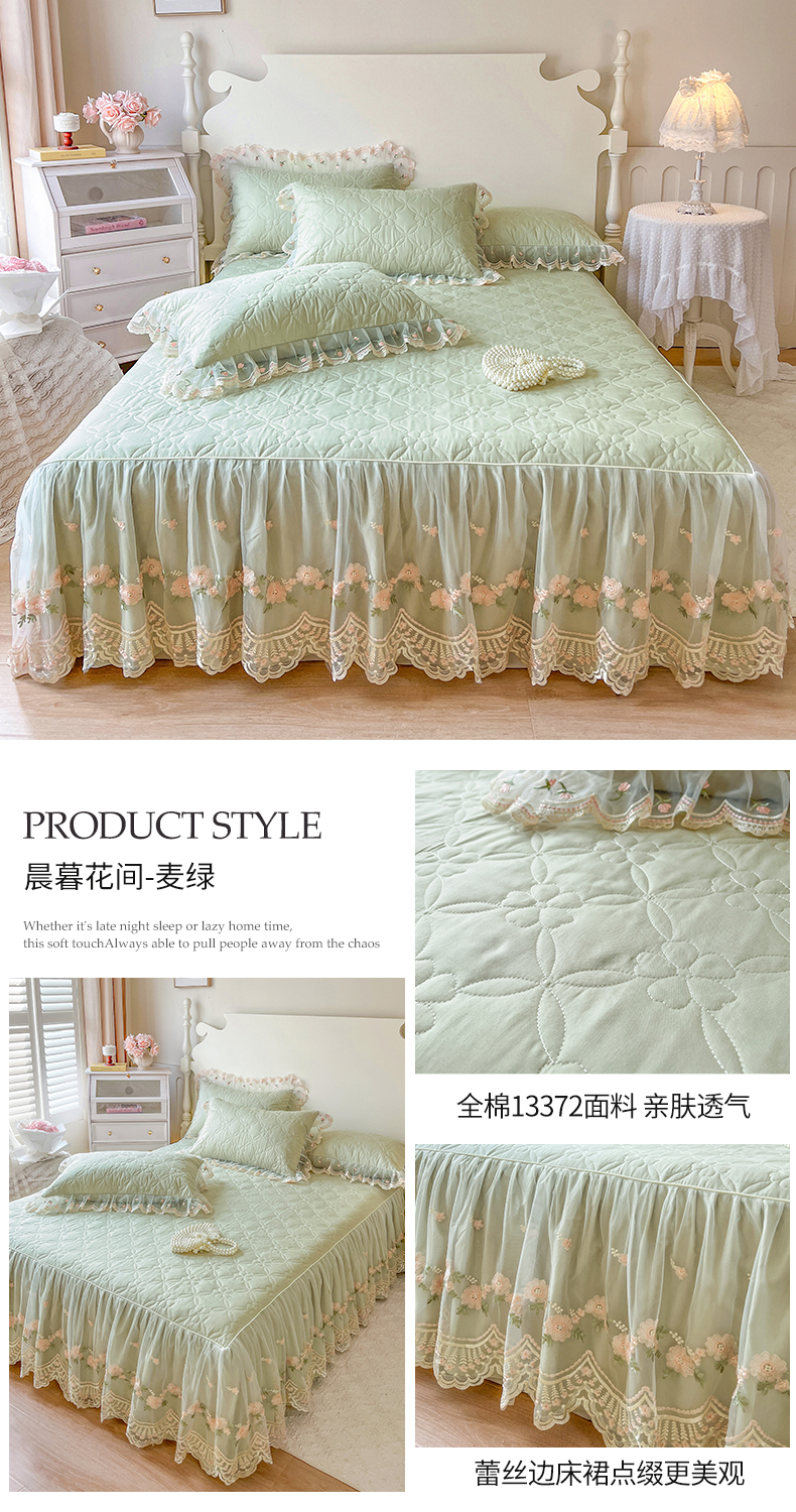 • 91家纺网 家纺一手货源 找家纺 网红馆 2025新款蕾丝花边全棉床裙晨暮花间系列 麦绿