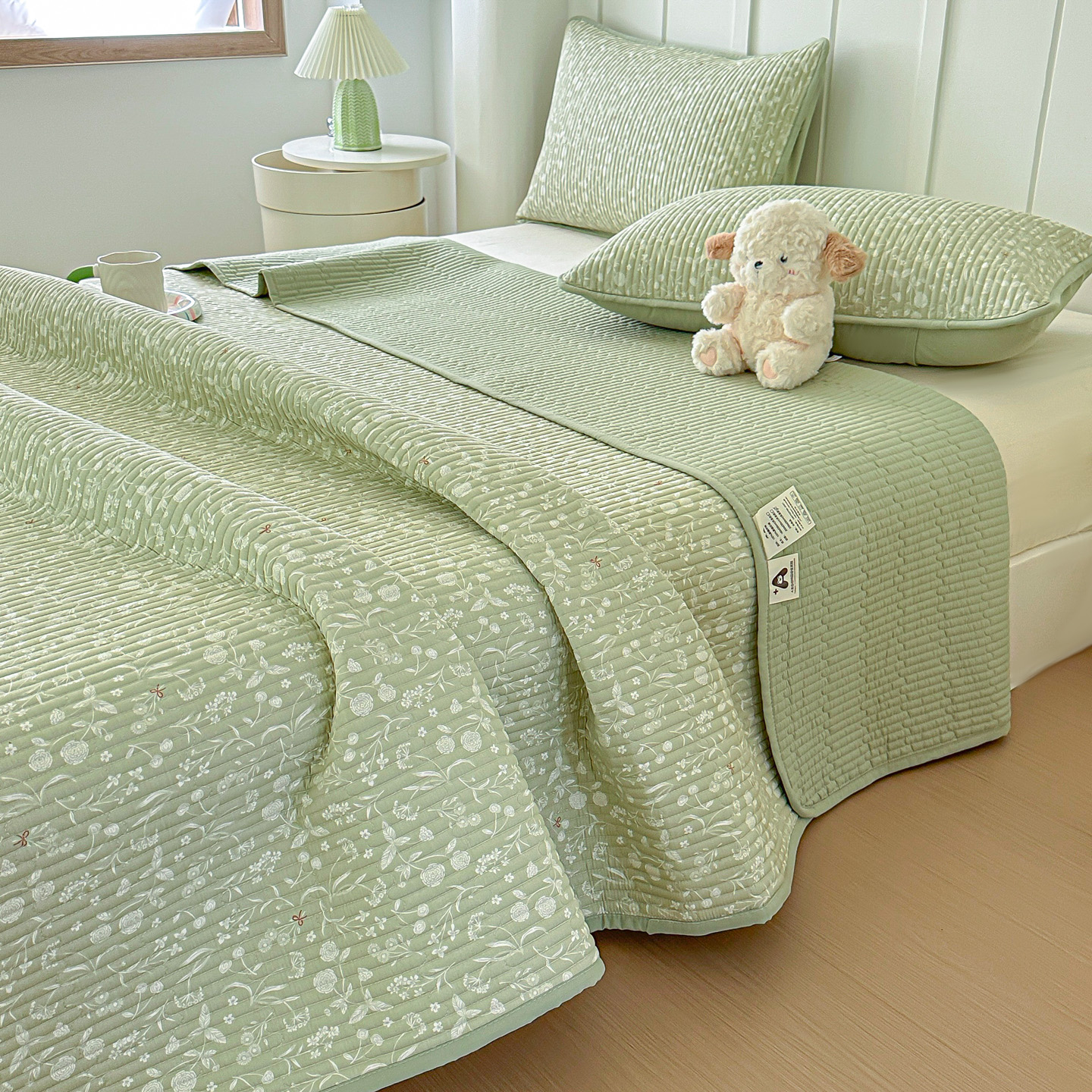 • 91家纺网 家纺一手货源 找家纺 橘夏家纺 2025新款全棉床盖三件套 悠然绿