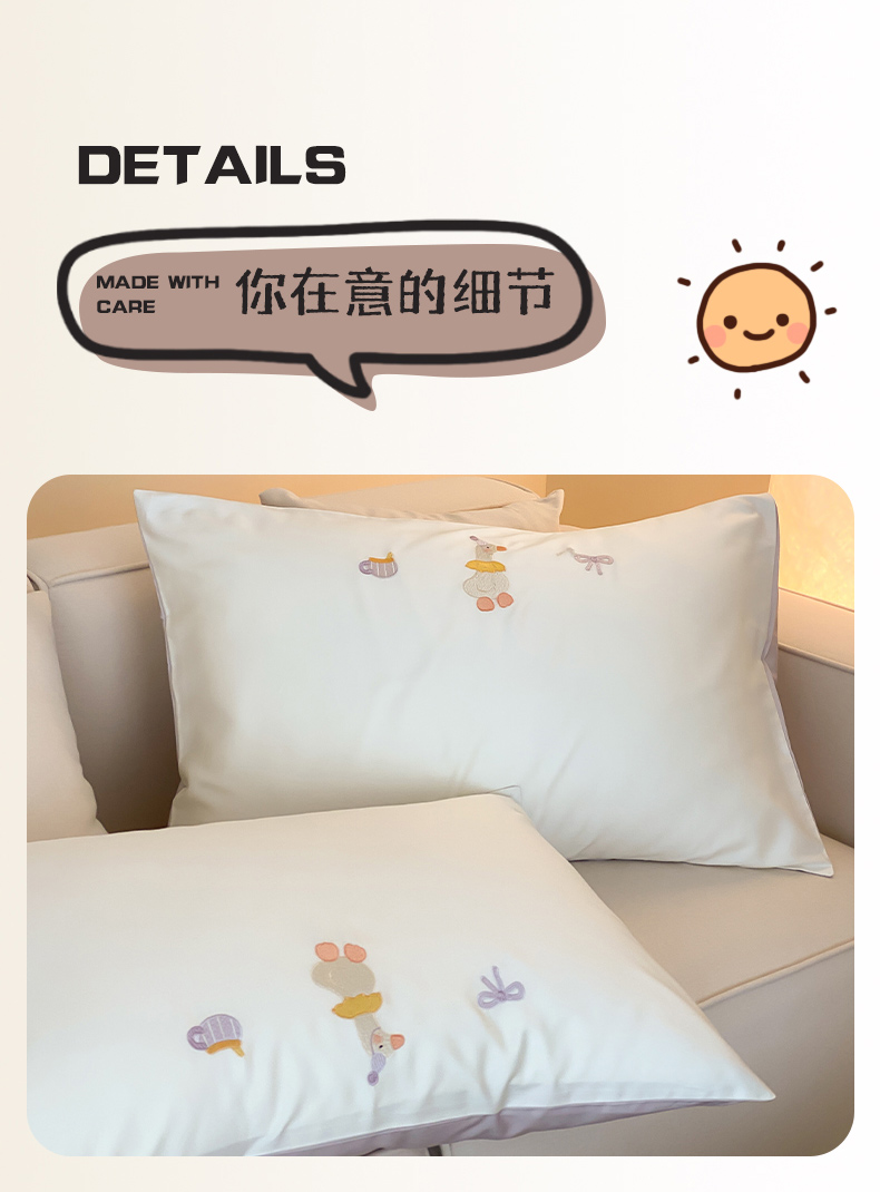 商品名称:云栖2025全棉刺绣纯色纯棉长绒棉四件套-乐萌系列 喜欢吖