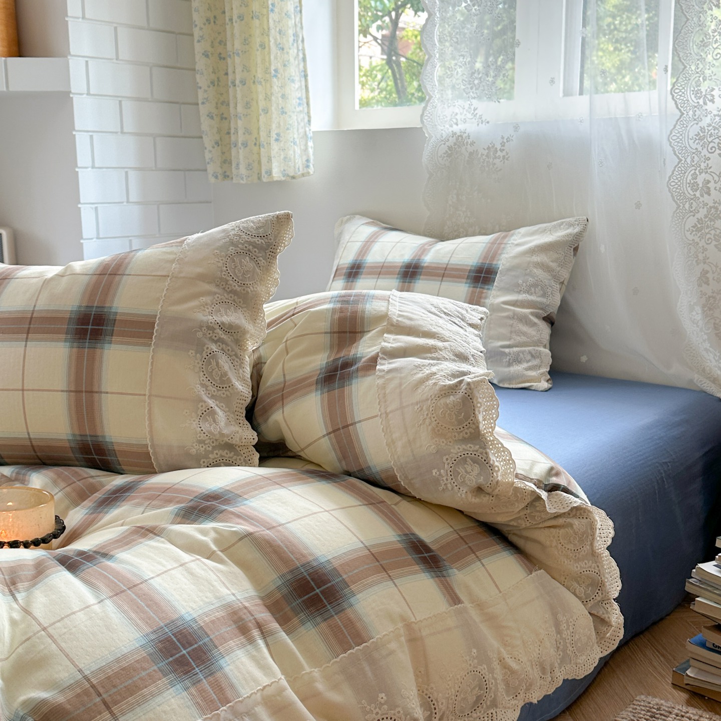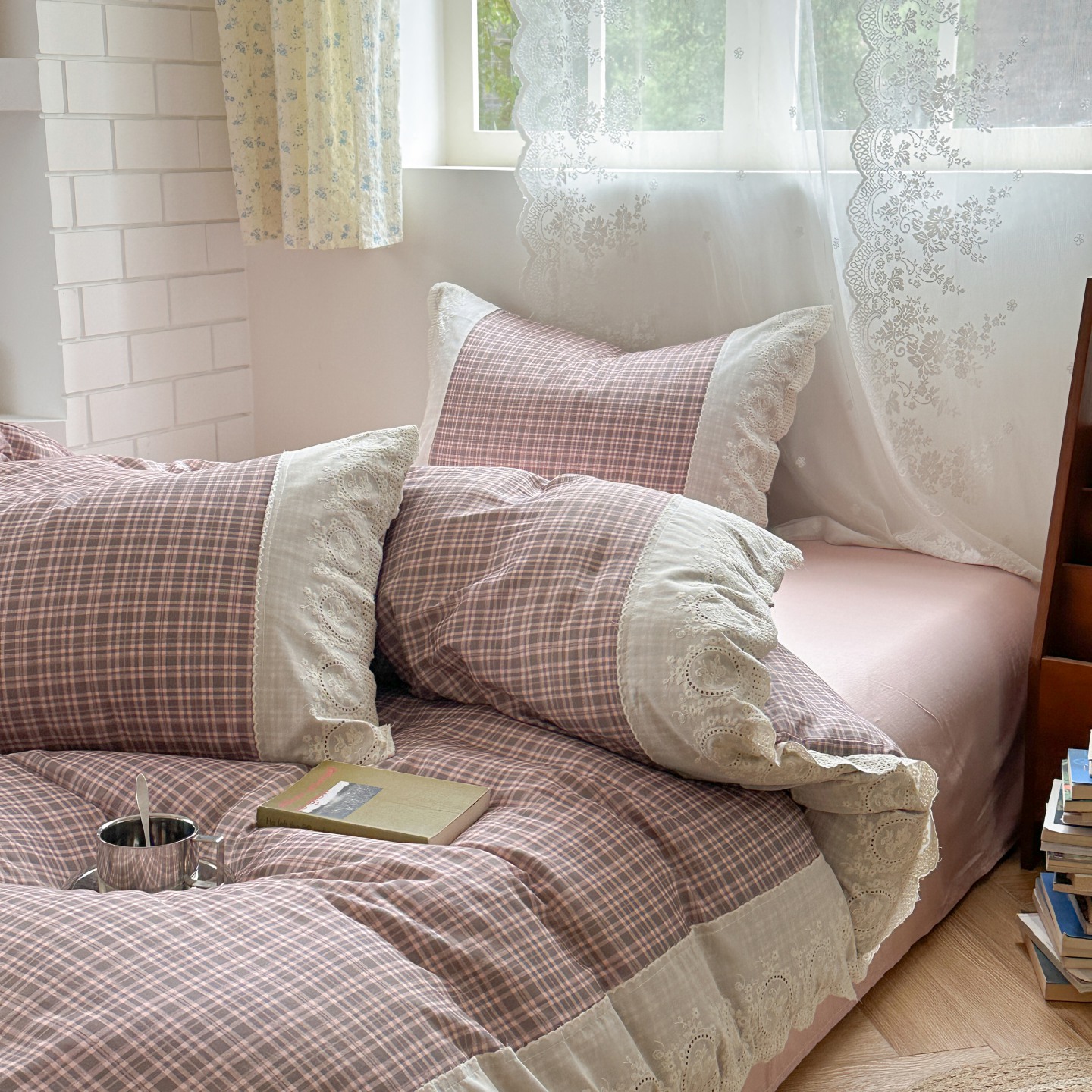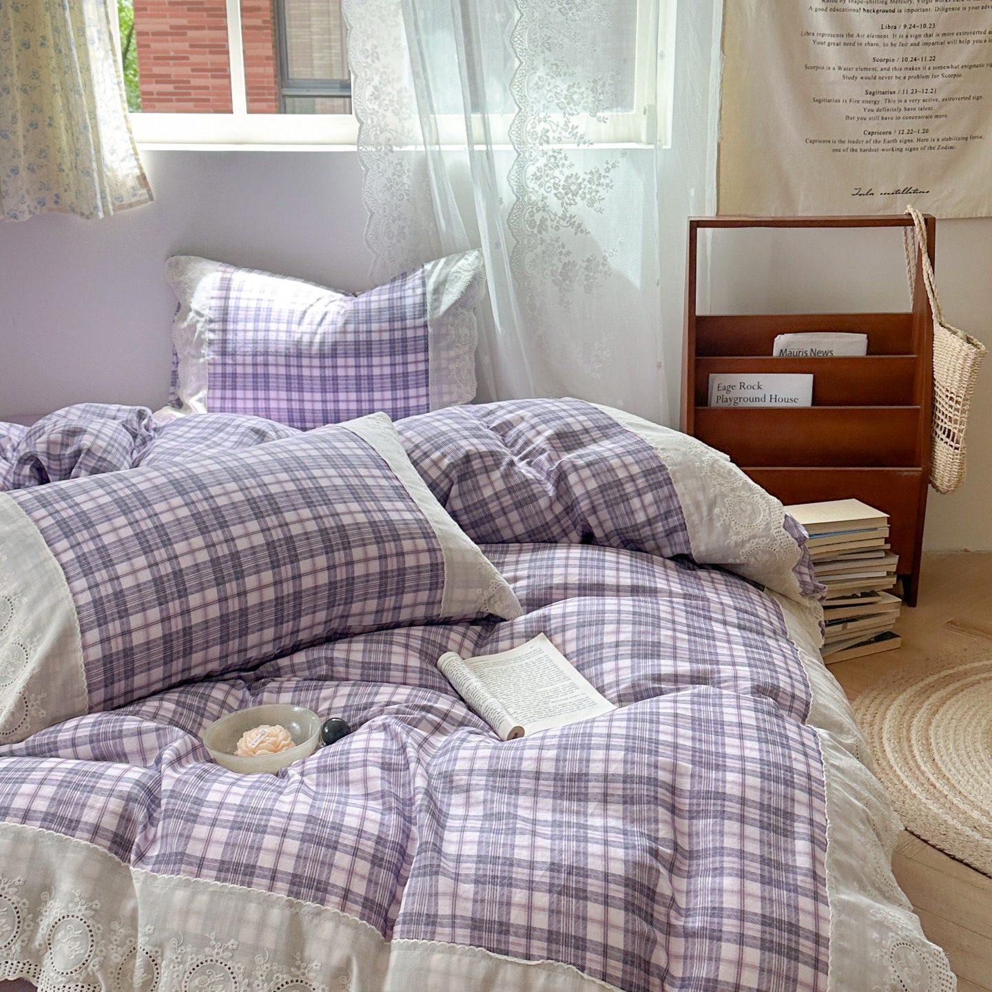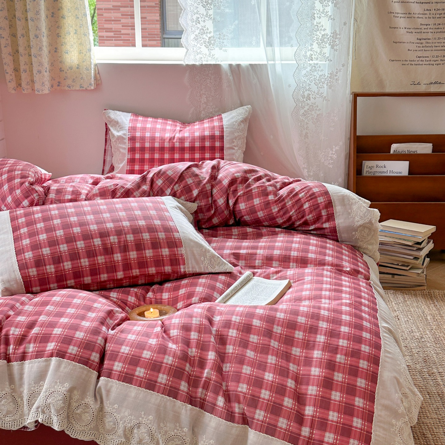 觅糖家纺 2025新款A类全棉云感双层纱蕾丝花边四件套 海韵格