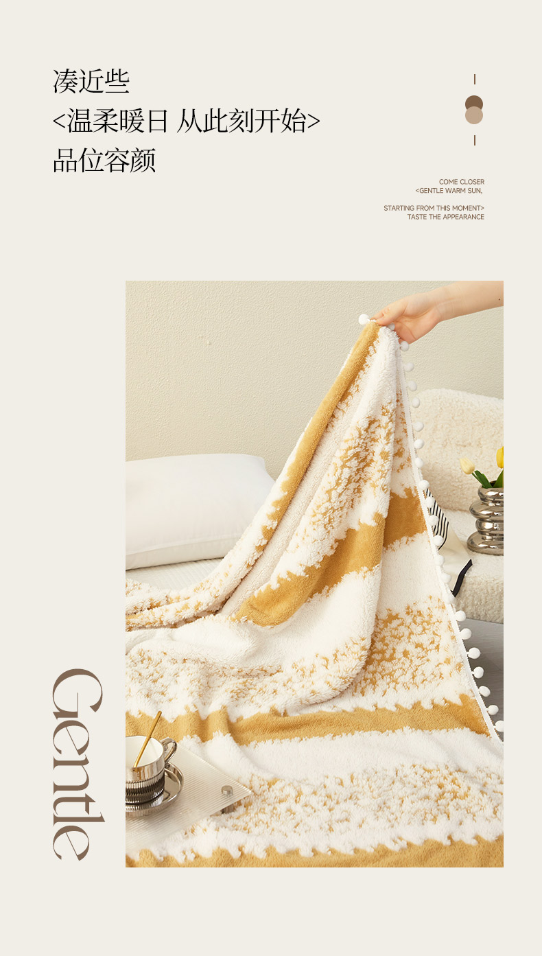 商品名称:莱家富 2026新款跨境专供外贸出口300克重双面条纹阳离子提花毛球毛毯盖毯休闲小毯子冬季床单 雪球梦语灿黄