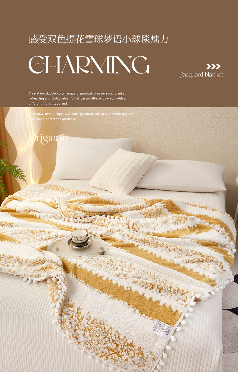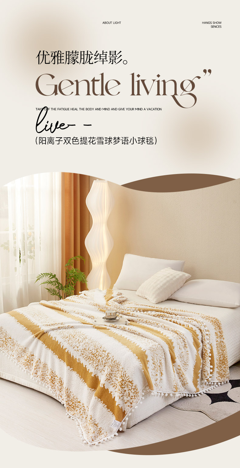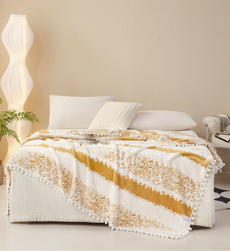 莱家富 2026新款跨境专供外贸出口300克重双面条纹阳离子提花毛球毛毯盖毯休闲小毯子冬季床单 雪球梦语灿黄