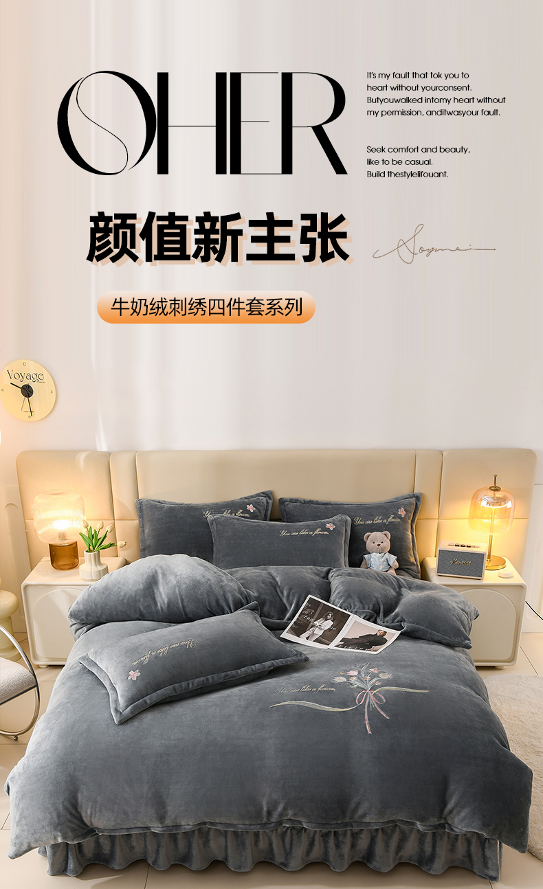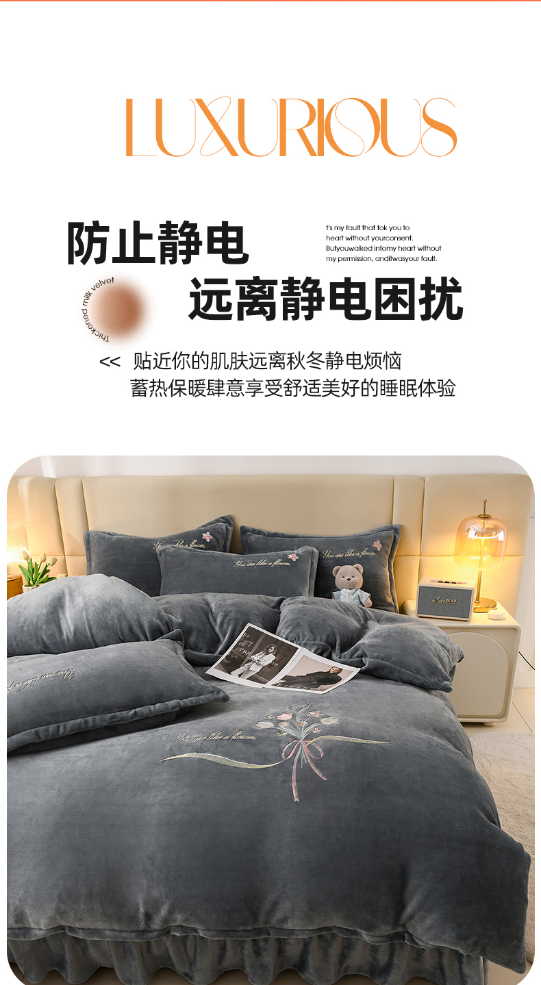 (总)绣女坊2023新款韩版花边床裙款牛奶绒宝宝绒四件套,宾利蓝,豆沙,灰色,酒红色,松花绿,紫色