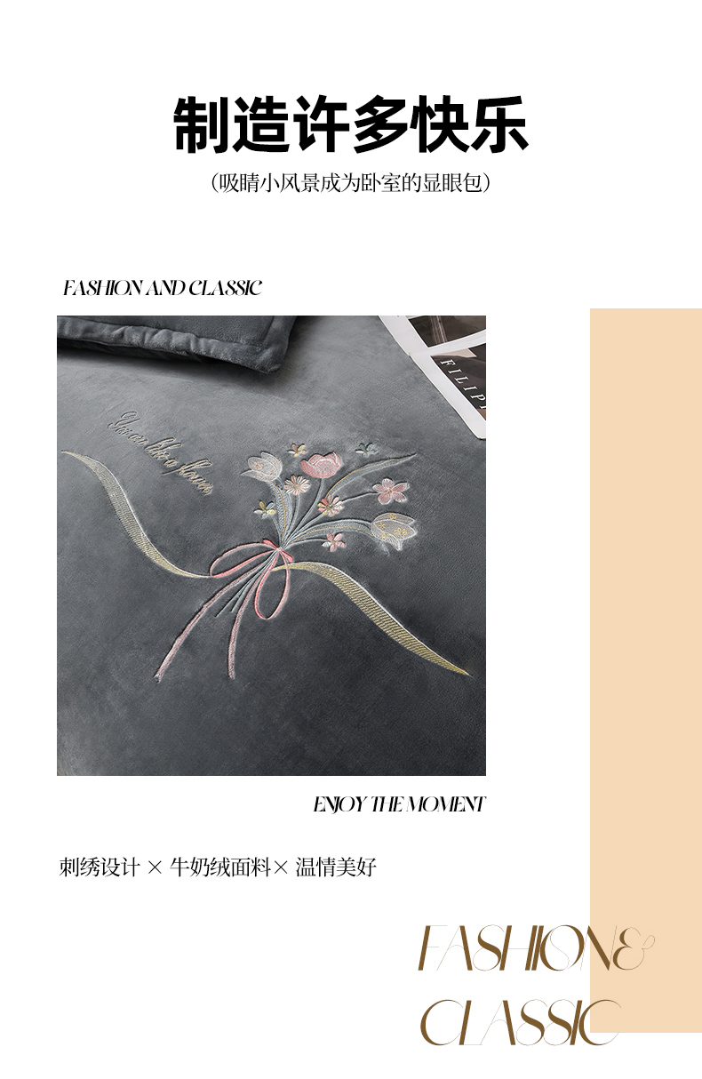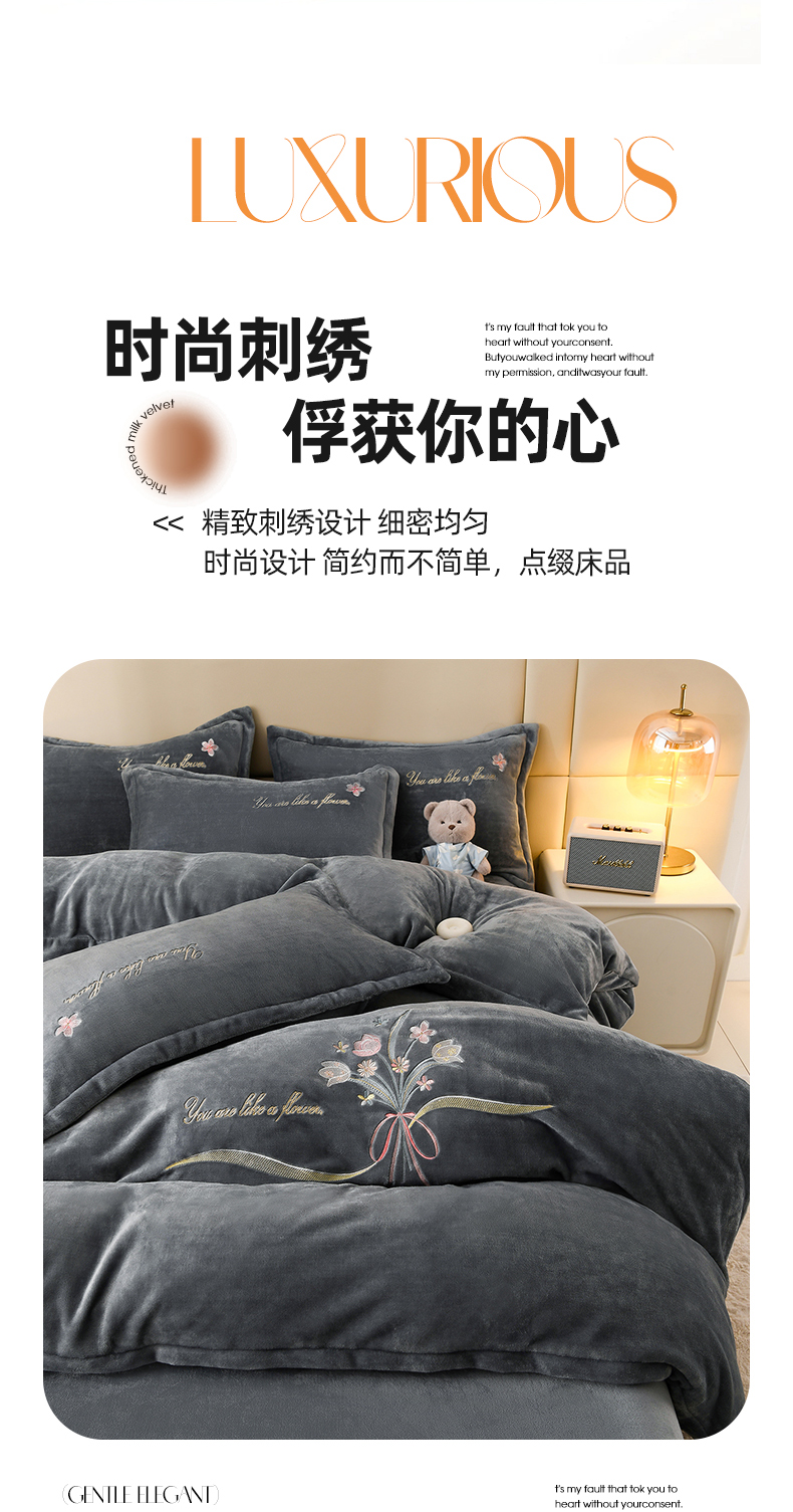 绣女坊 2025新款高克重牛奶绒刺绣四件套 郁金香-灰
