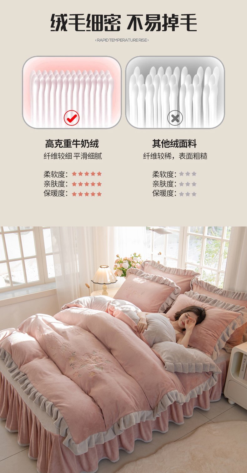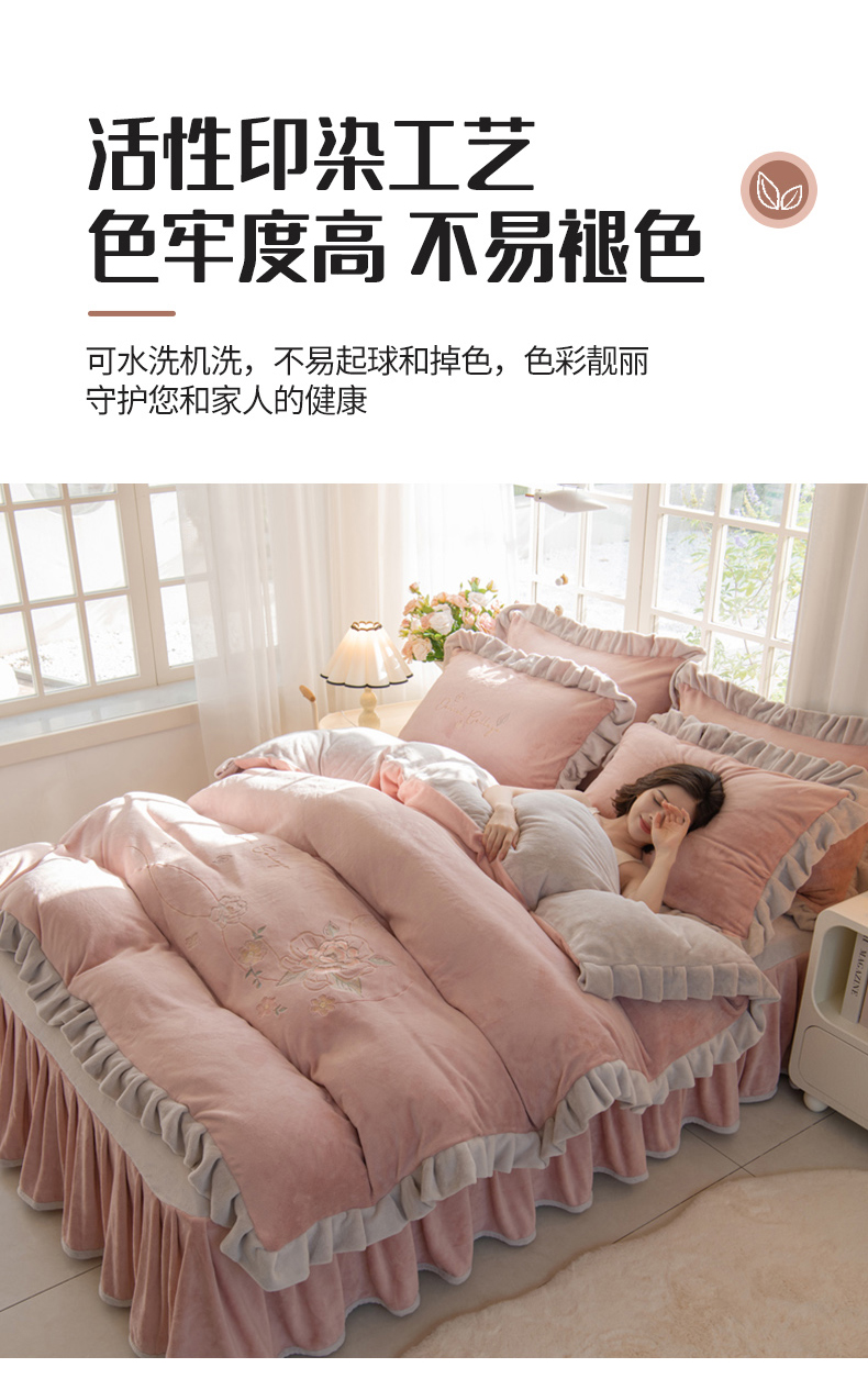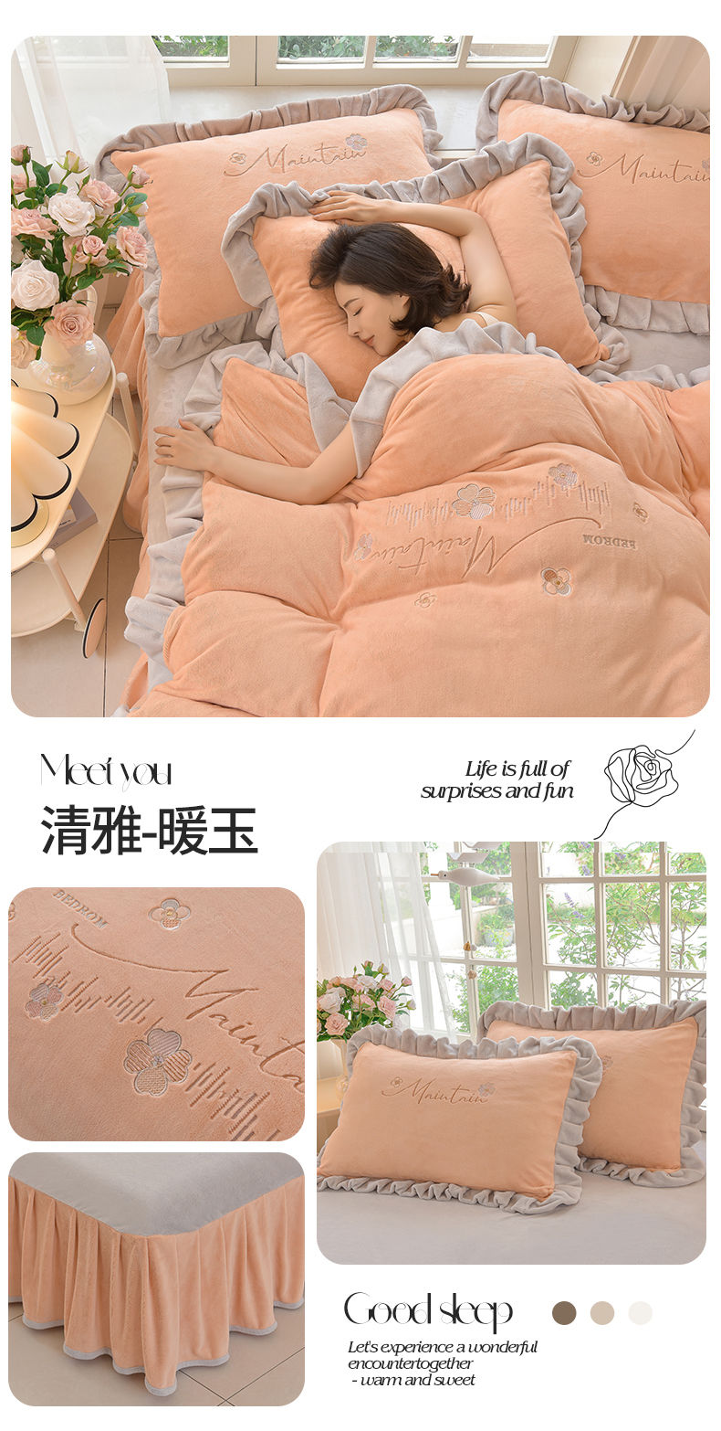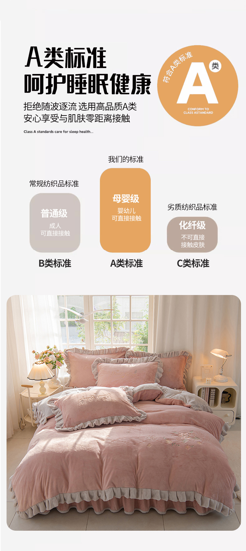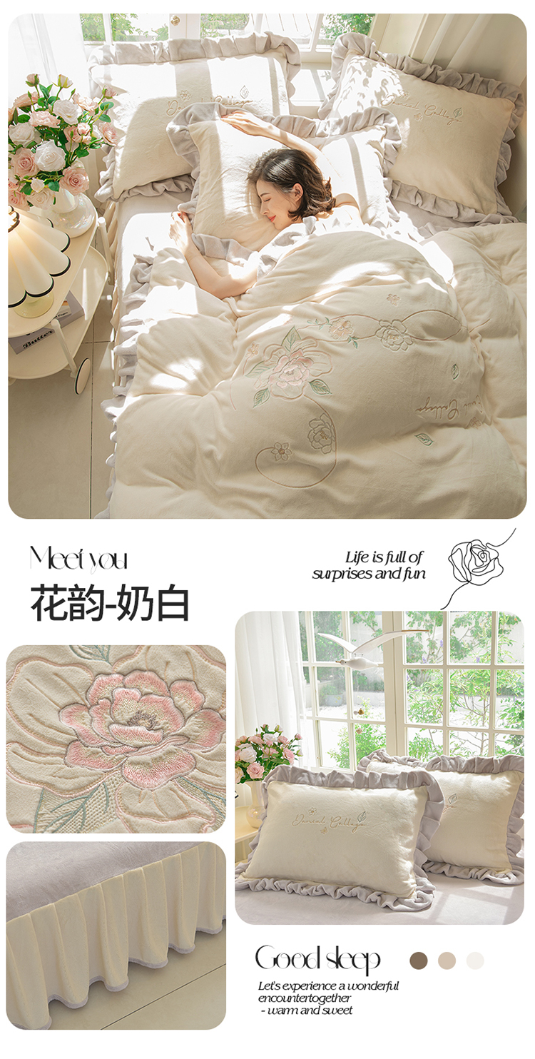 鑫喜莱家纺 2025新款刺绣双层花边牛奶绒四件套(注意控价 标准尺寸156元,实际售价不得低于控价的价格) 花韵-藕粉