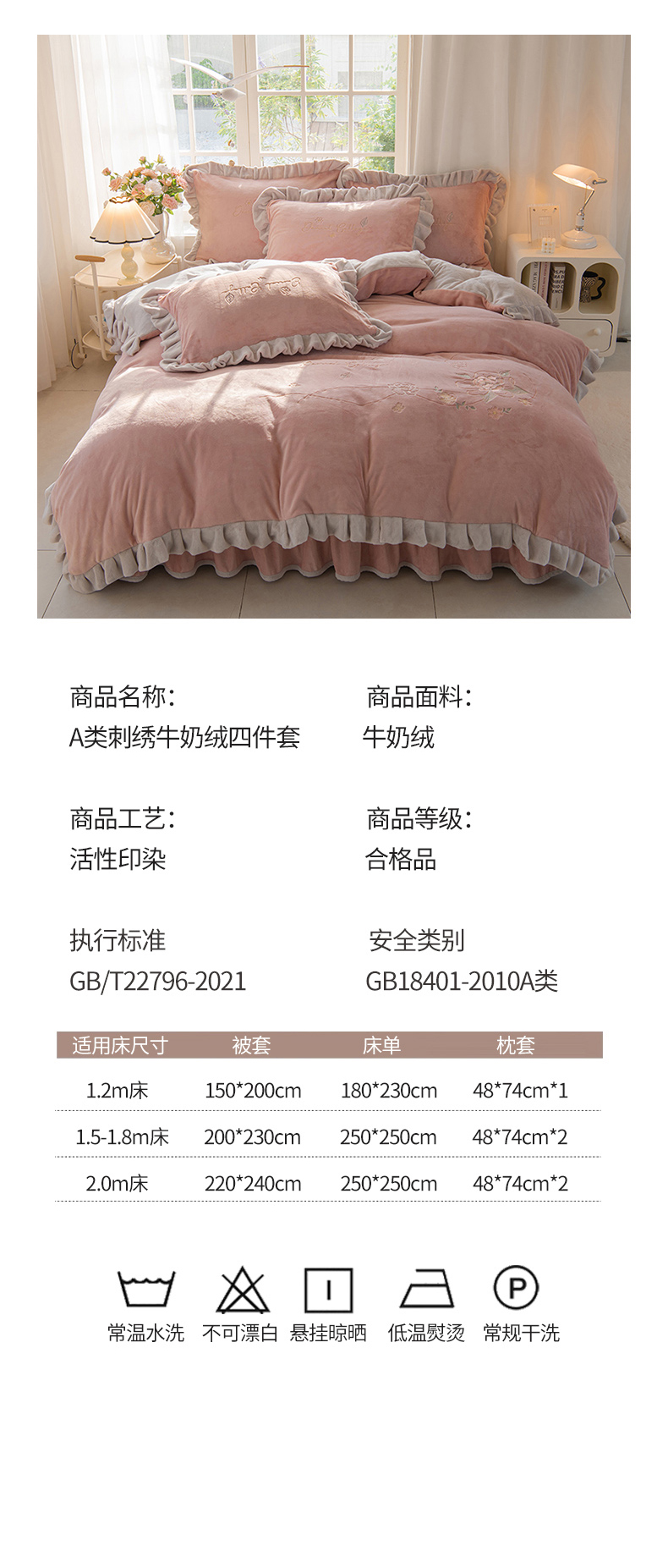 商品名称:鑫喜莱家纺 2025新款刺绣双层花边牛奶绒四件套(注意控价 标准尺寸156元,实际售价不得低于控价的价格) 花韵-藕粉