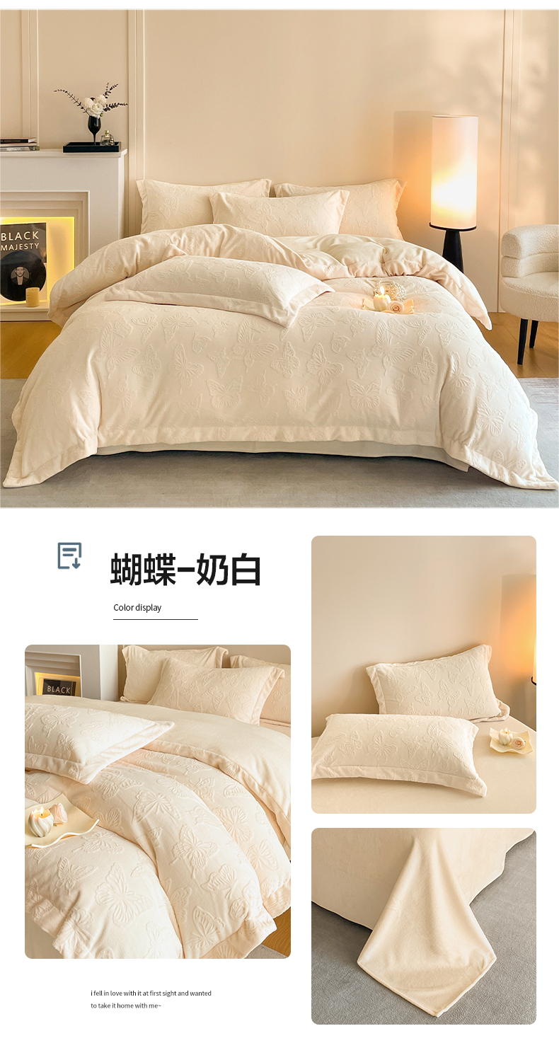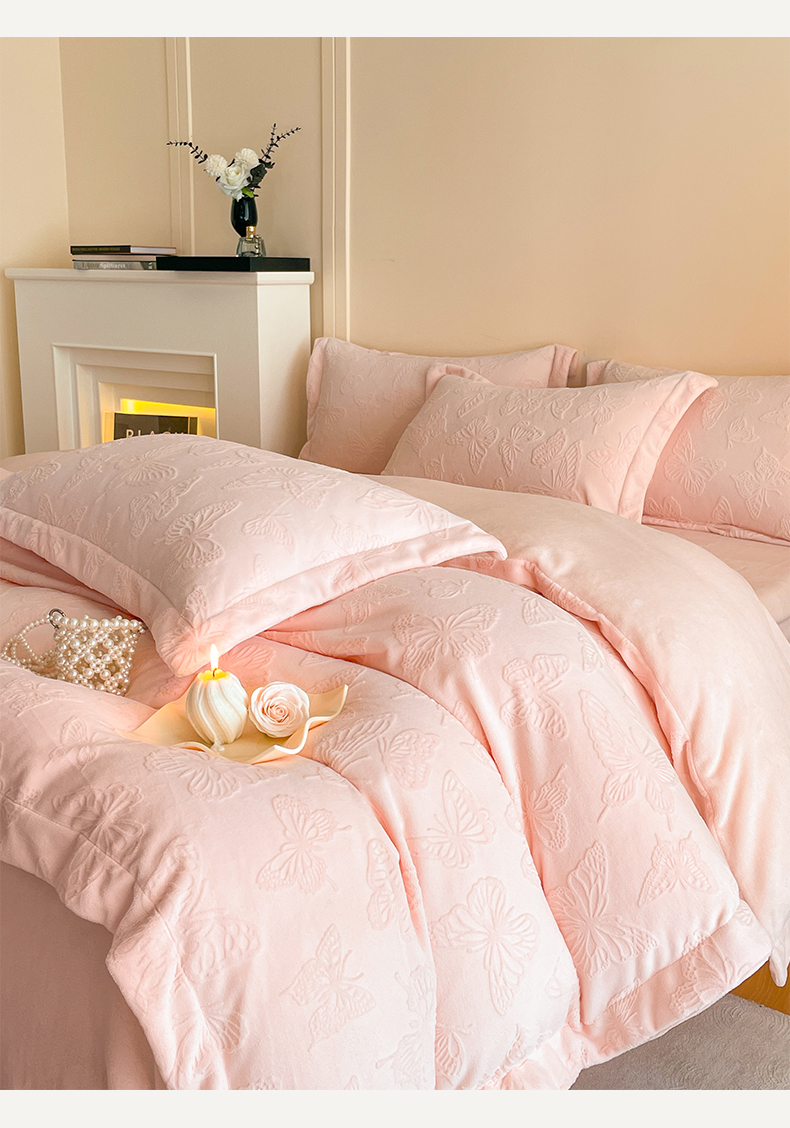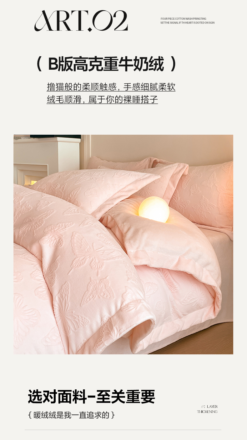 当前位置: 91家纺网 > 商品网购 > 床品套件 > 四件套 > 牛奶绒四件套 > 米彩家纺 2025新款A类牛奶绒立体雕花烂花宽边四件套 蝴蝶粉玉