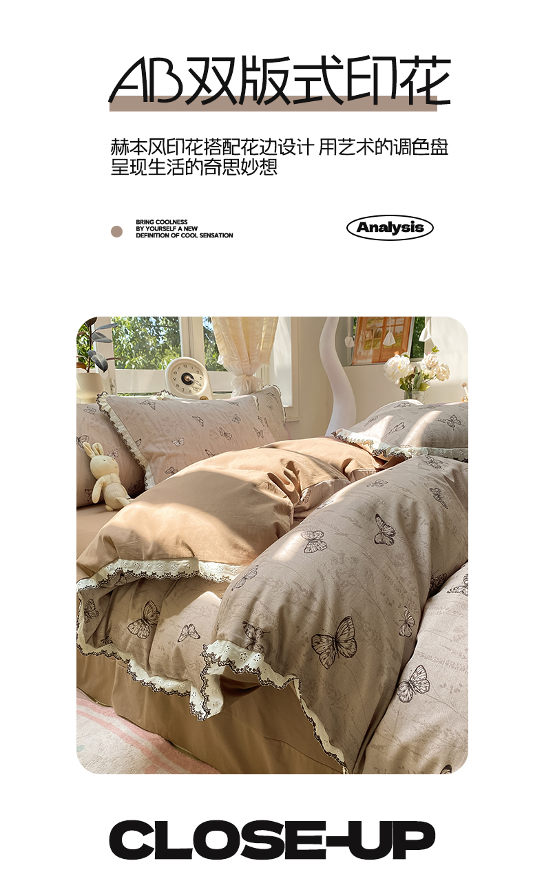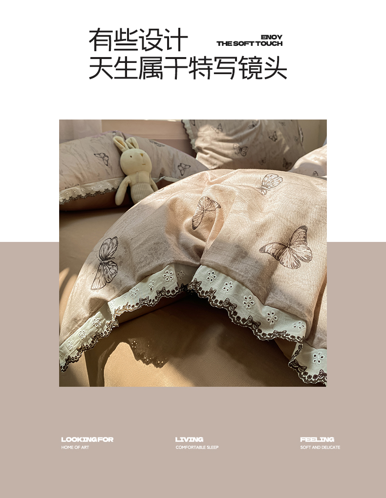 商品名称:宜家坊 2025新款全棉加厚赫本风花边磨毛四件套 梦蝶-咖