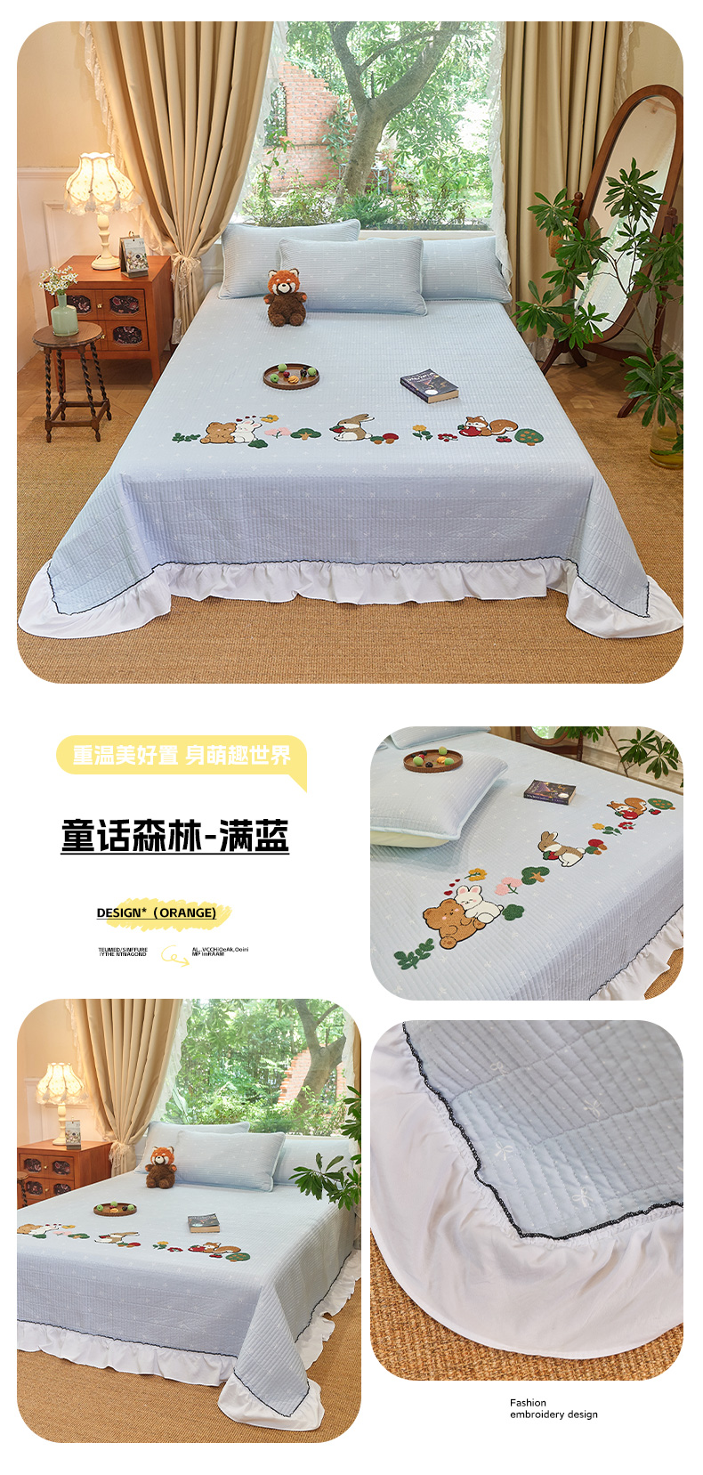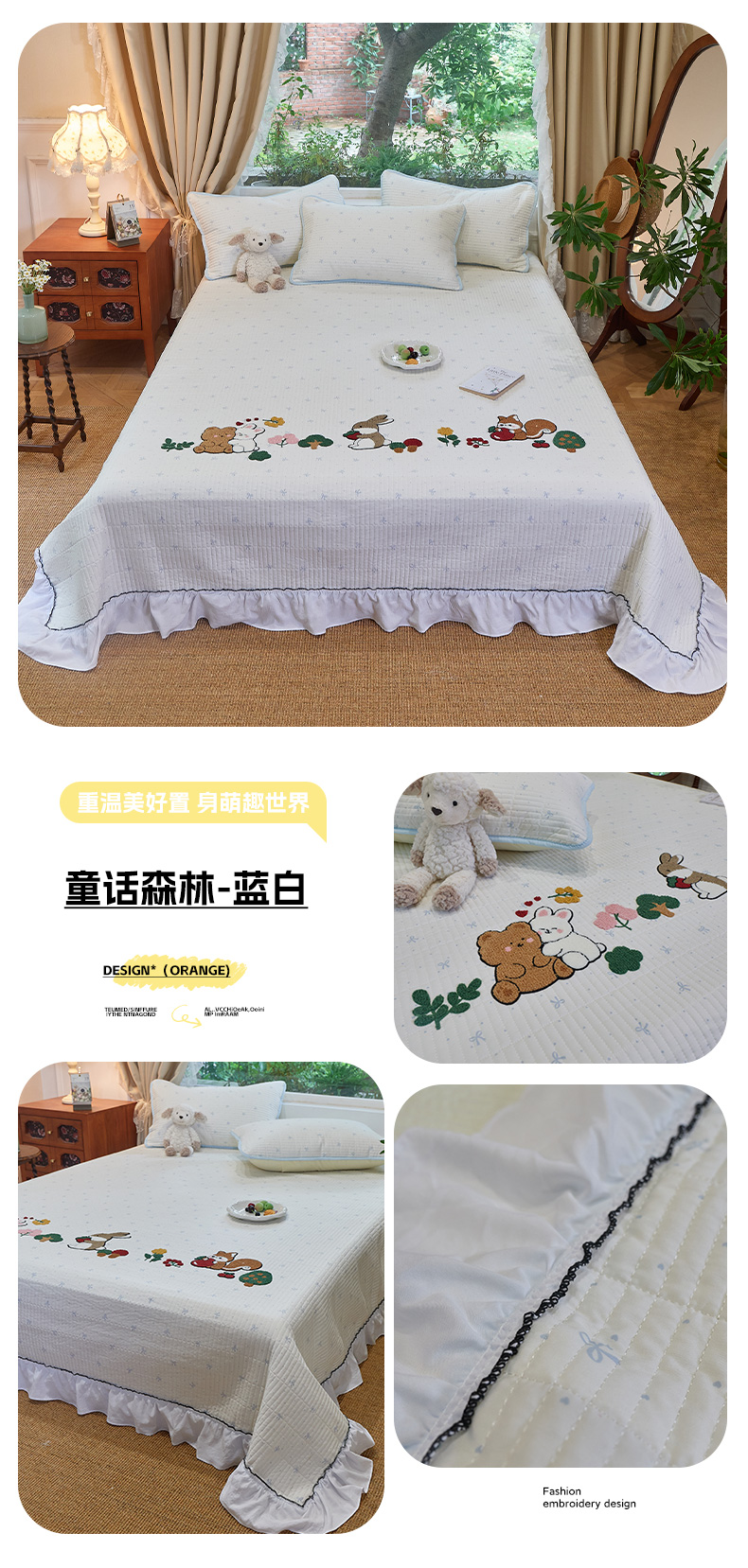 (总)鑫喜莱家纺 2025新款云朵棉毛巾绣花边款床盖三件套系列,童话森林-粉白,童话森林-黑白,童话森林-蓝白,童话森林-满粉,童话森林-满蓝,组合图,包装展示