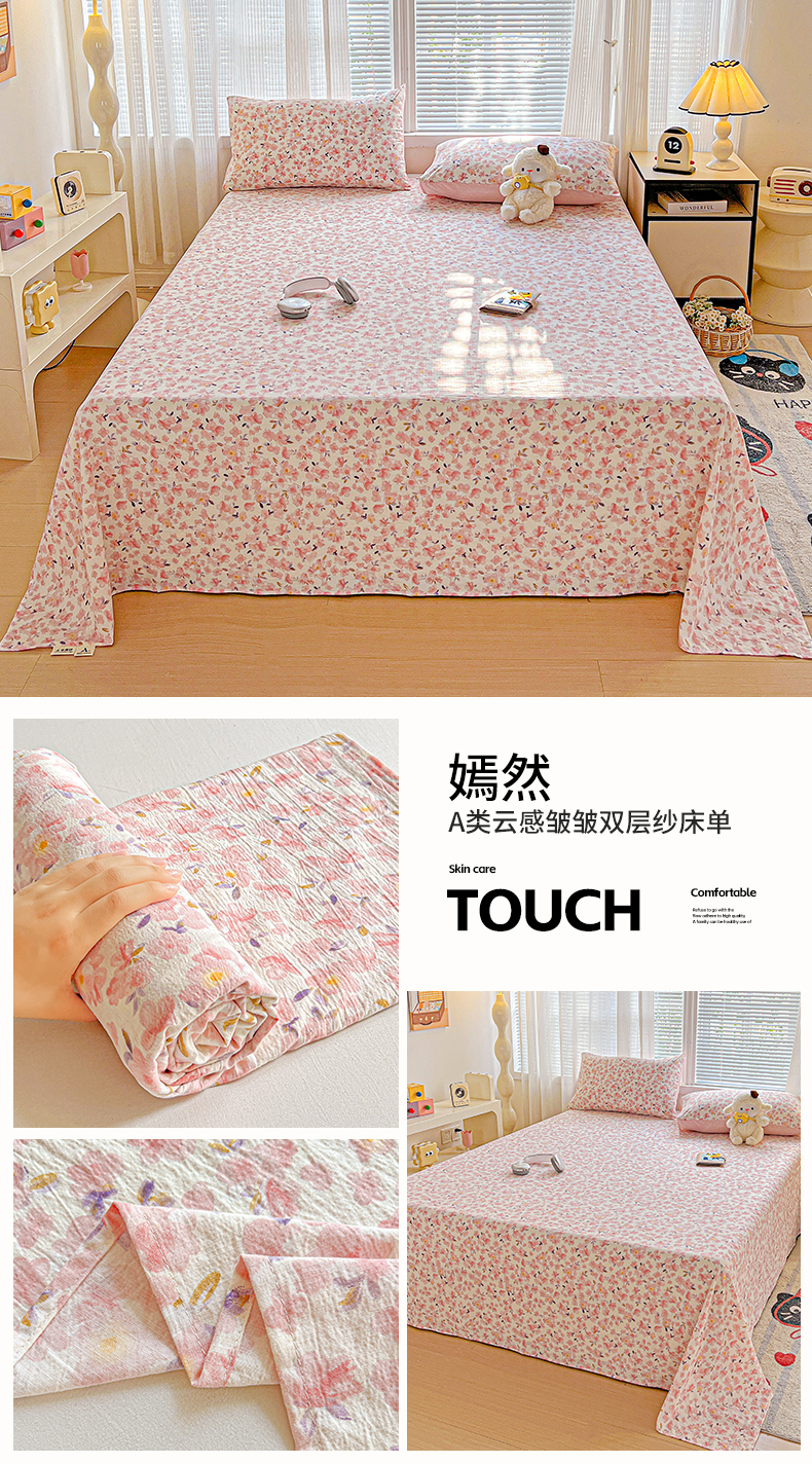 • 91家纺网 家纺一手货源 找家纺 格真 2025新款A类云感木棉皱皱双层纱床单单床单床单单品床单三件套 蝴蝶印记