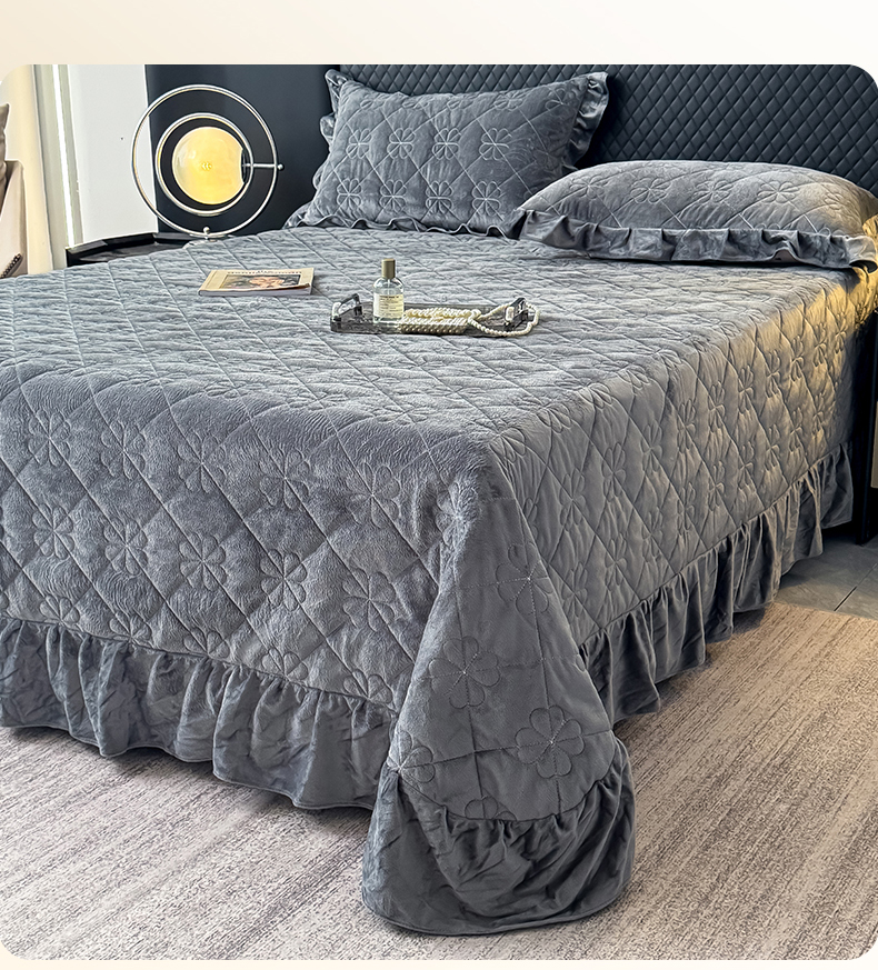 逸林家纺《原希尔顿逸林》 2025新款床盖水晶绒床盖床裙三件套夹棉床盖 四叶草-高级灰