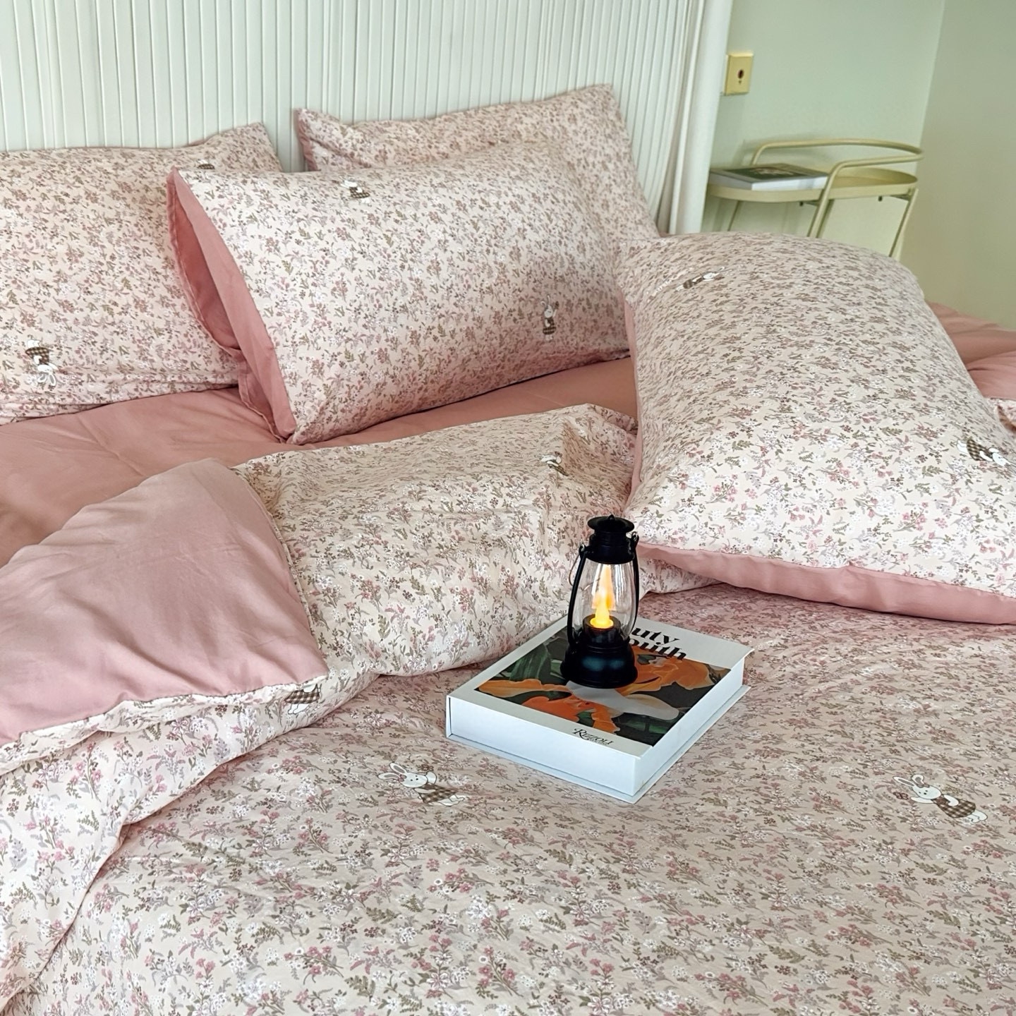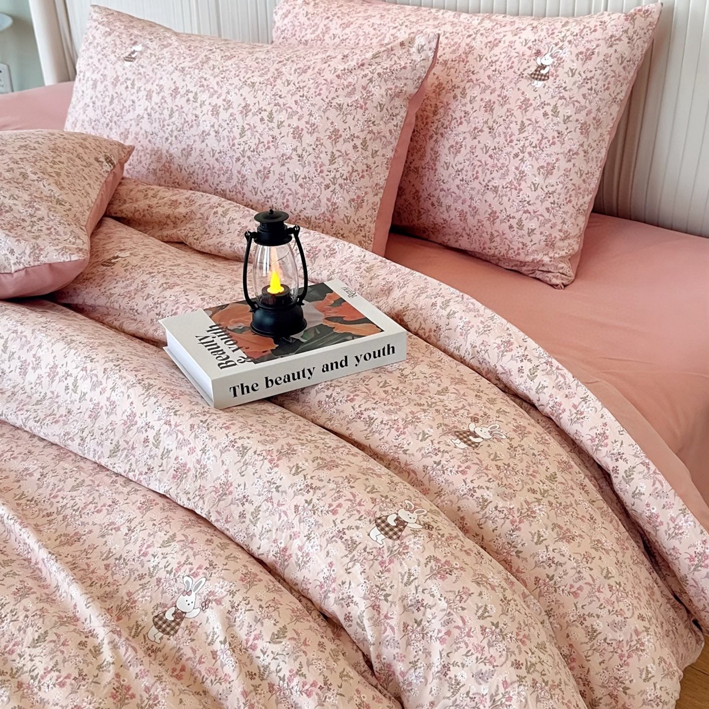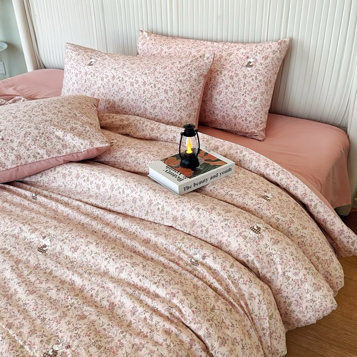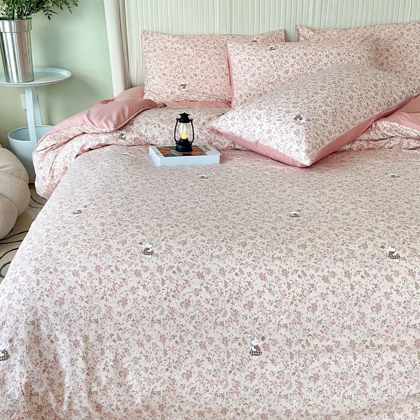 兜米家居 2025新款古法水洗棉印花小清新四件套 花枝兔粉