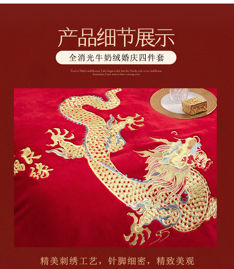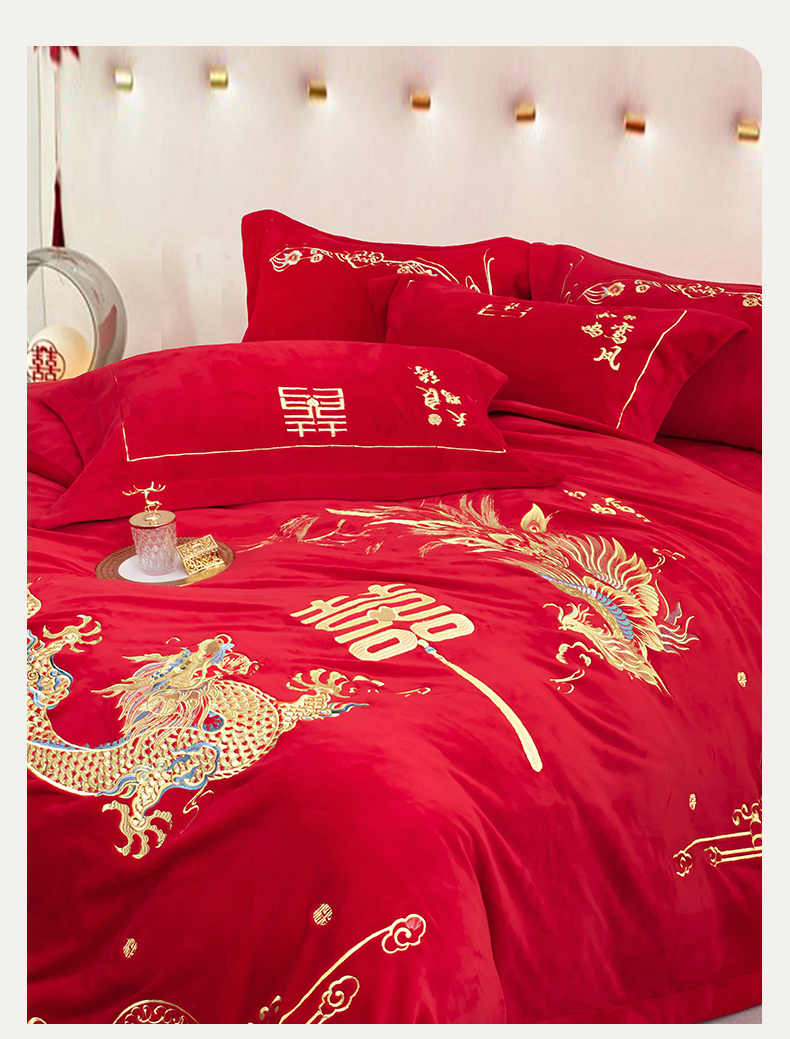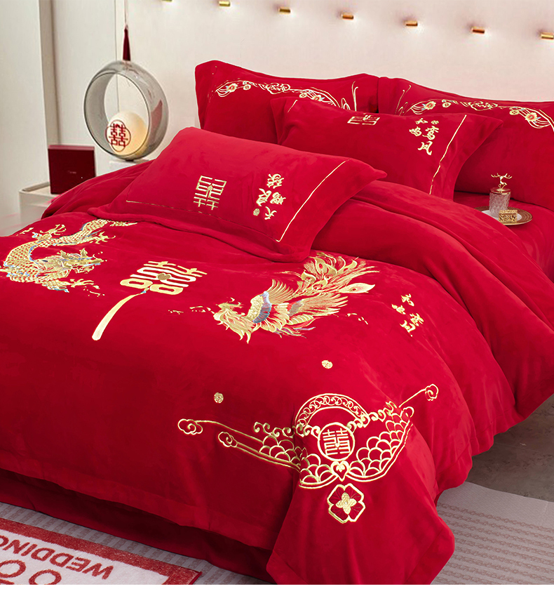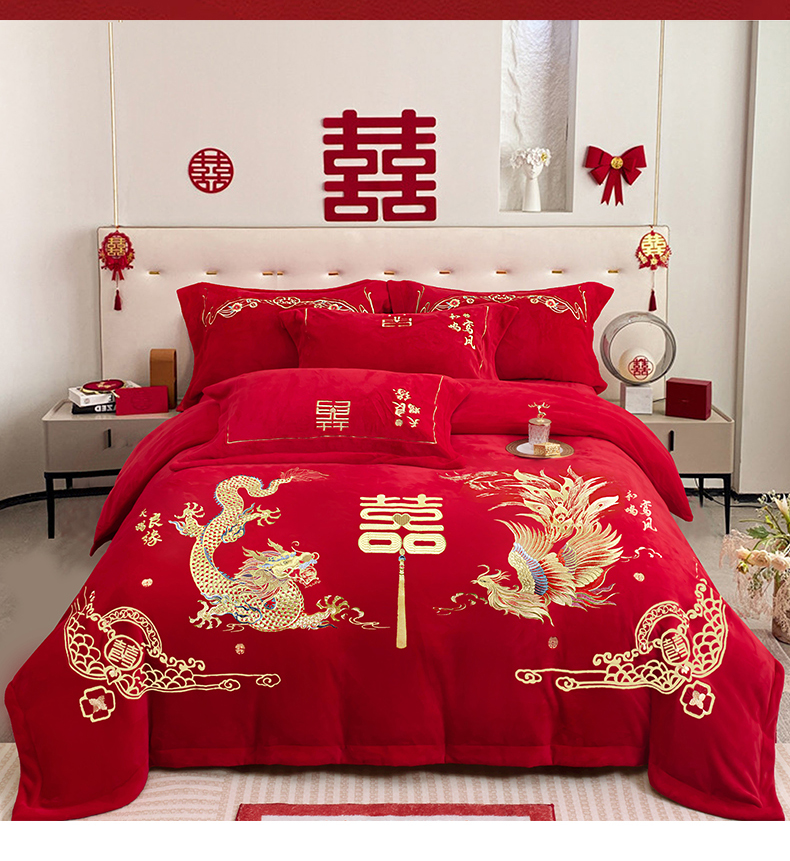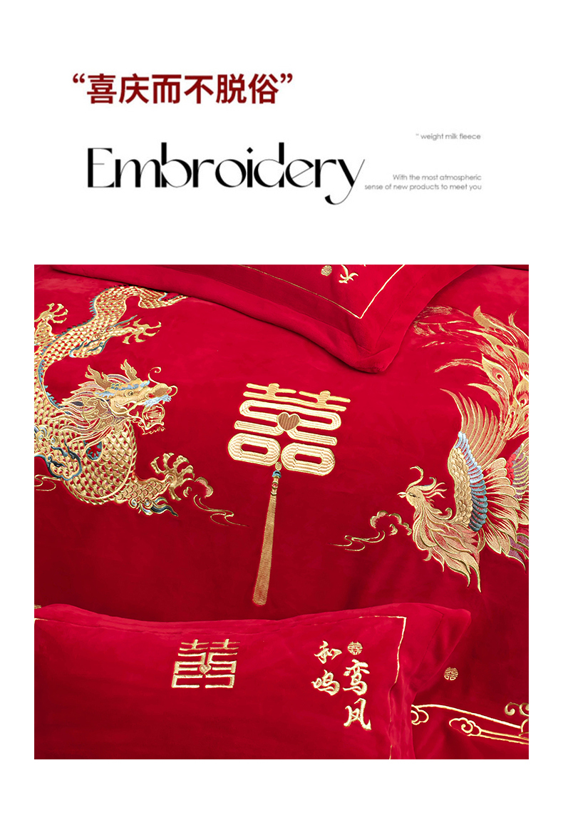 商品名称:千禧家纺 2025新款加厚高克重全消光牛奶绒刺绣婚庆四件套 龙凤喜事(绒)