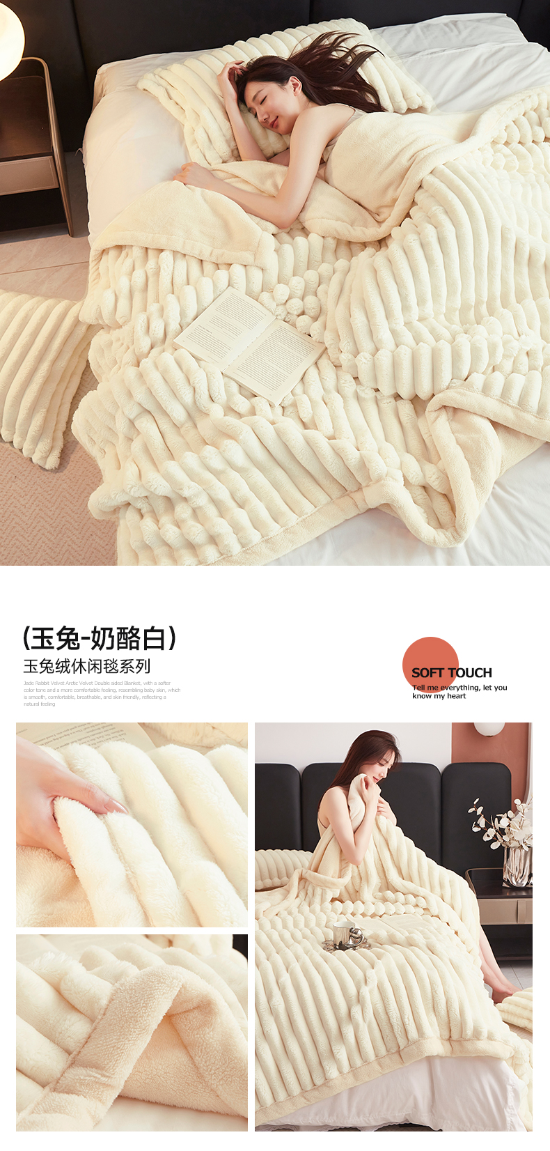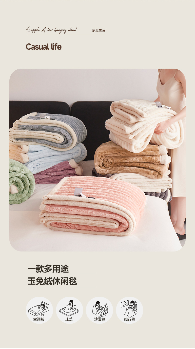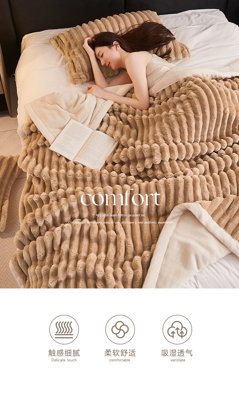 商品名称:悦织湾家纺 2025新款A面兔毛绒B面北极绒抽条毛毯610每平方克重玉兔绒双层加厚保暖休闲盖毯 外贸跨境电商 玉兔-青灰色