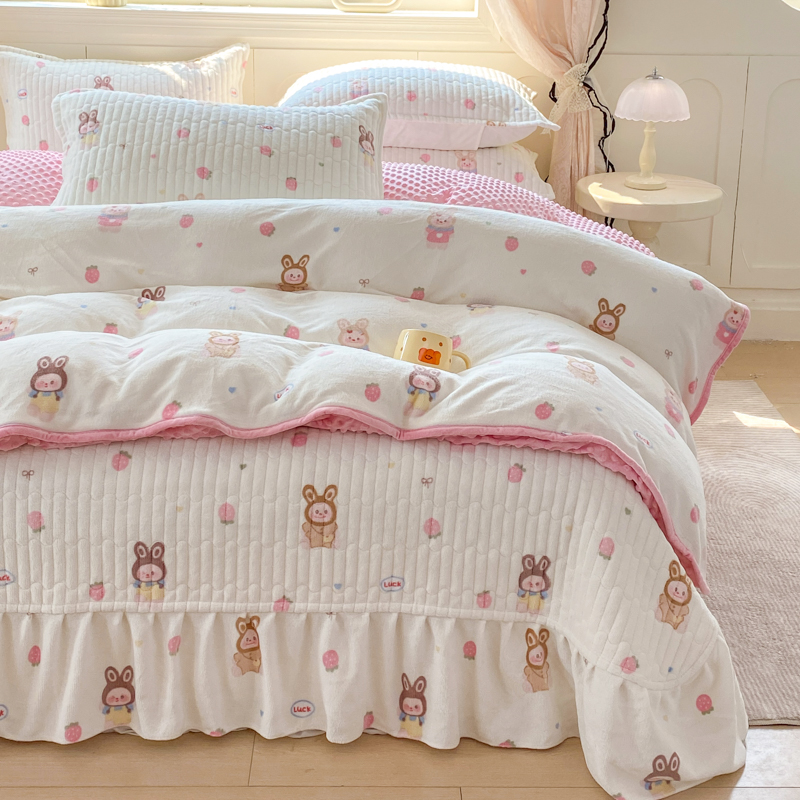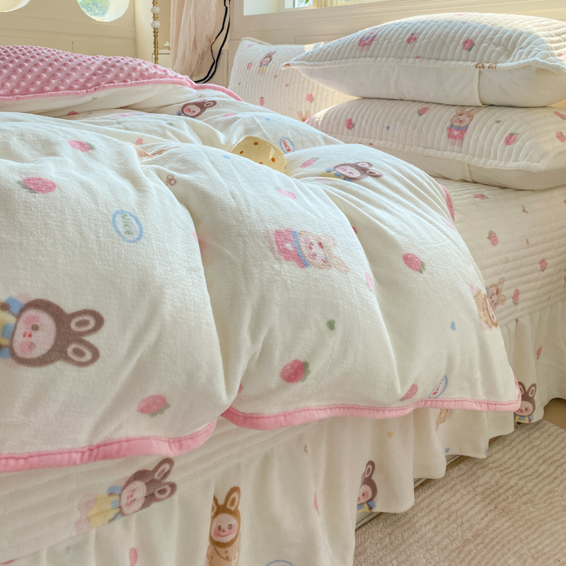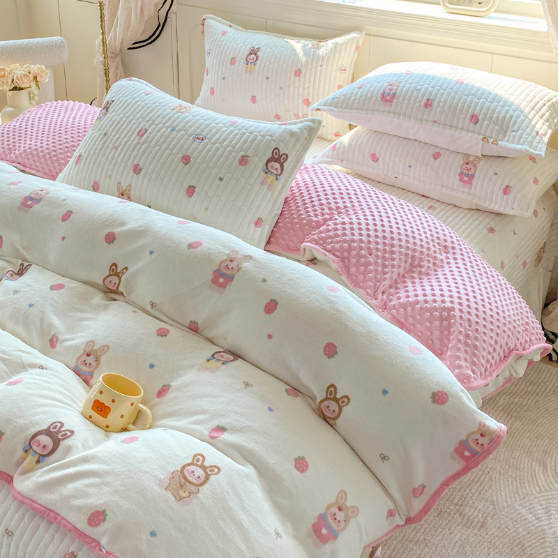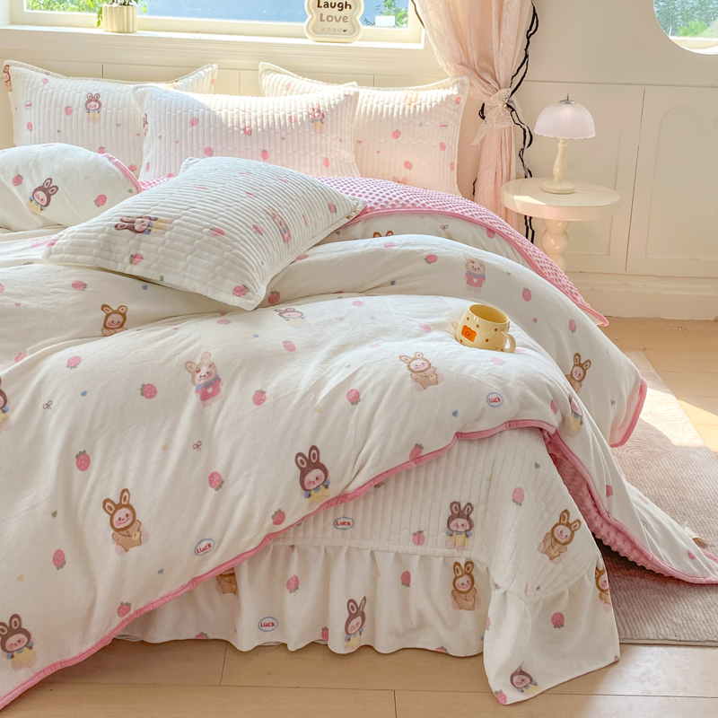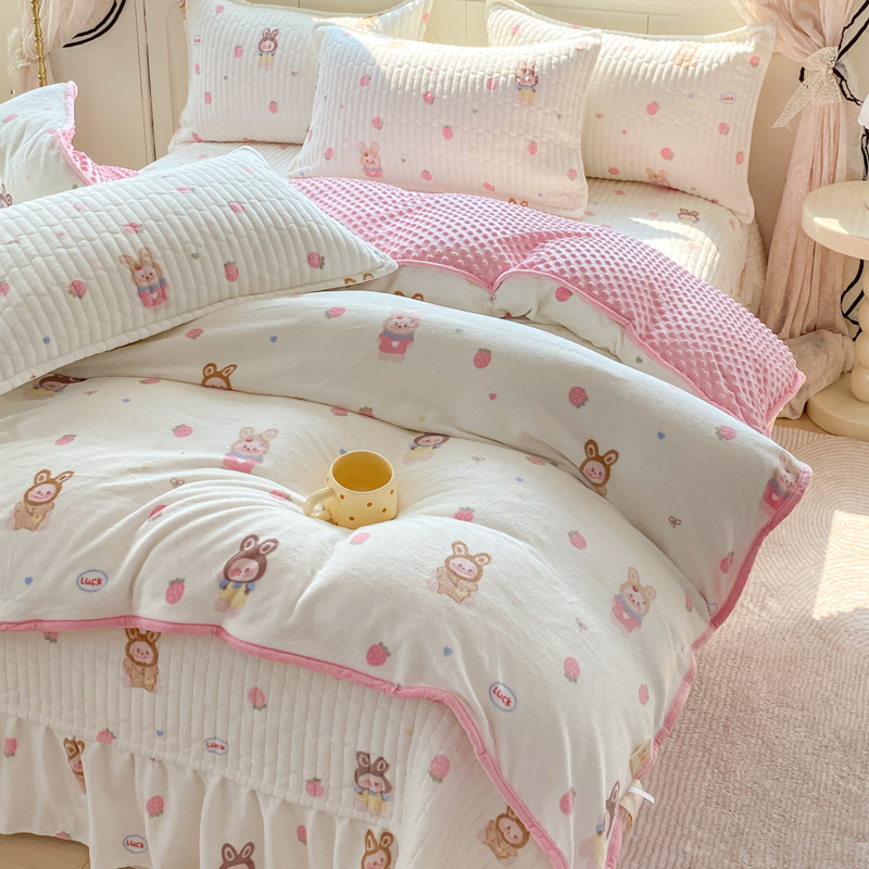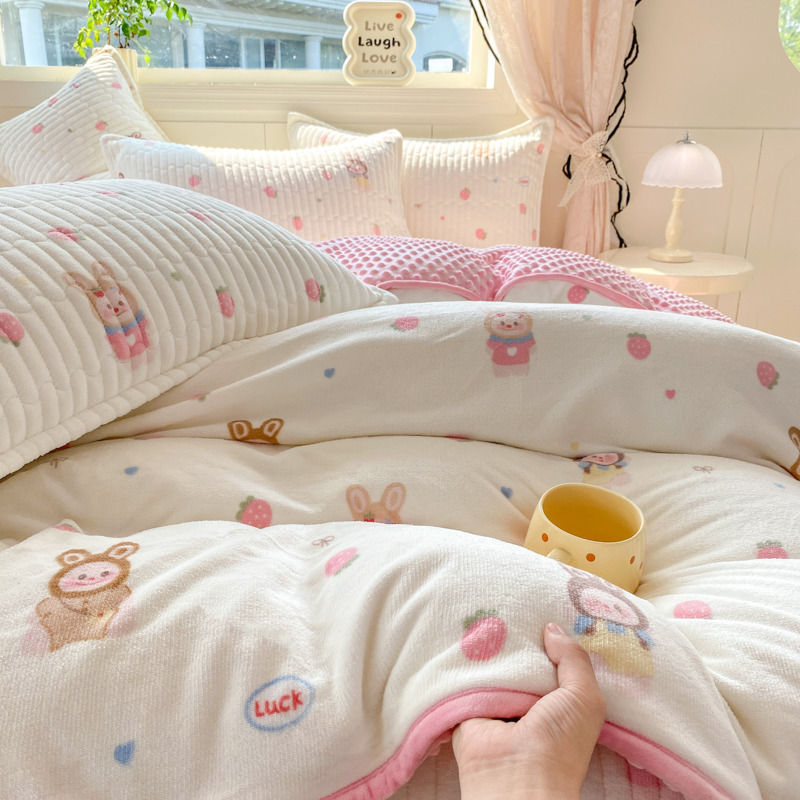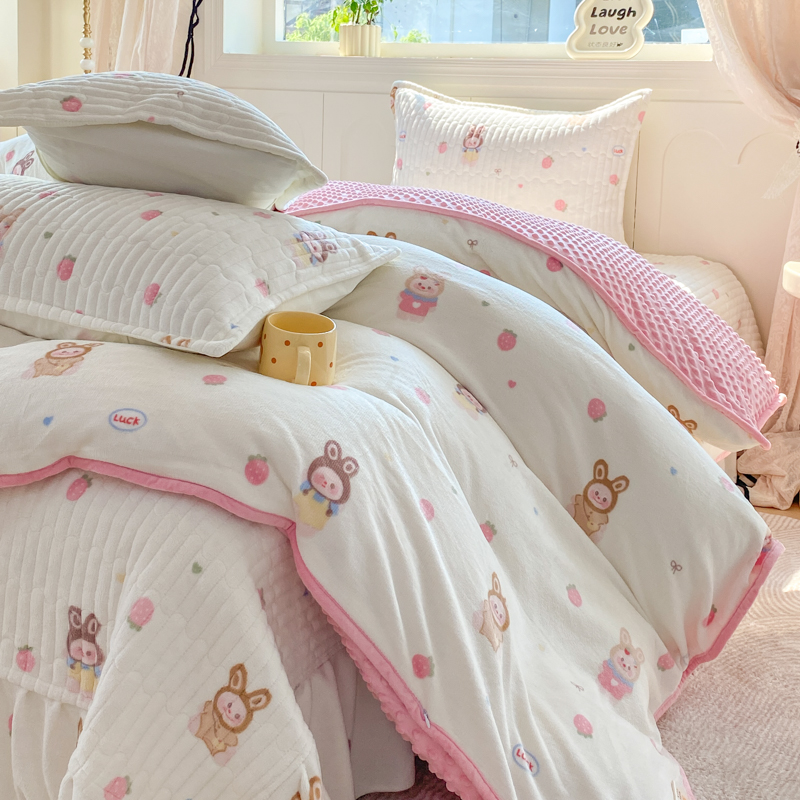 (总)尚美 2025新款毛巾绣牛奶绒床盖加棉加厚四件套,爆莓兔,背带熊猫,蛋糕猫,黑皮猫,恐龙,女孩,小粉象