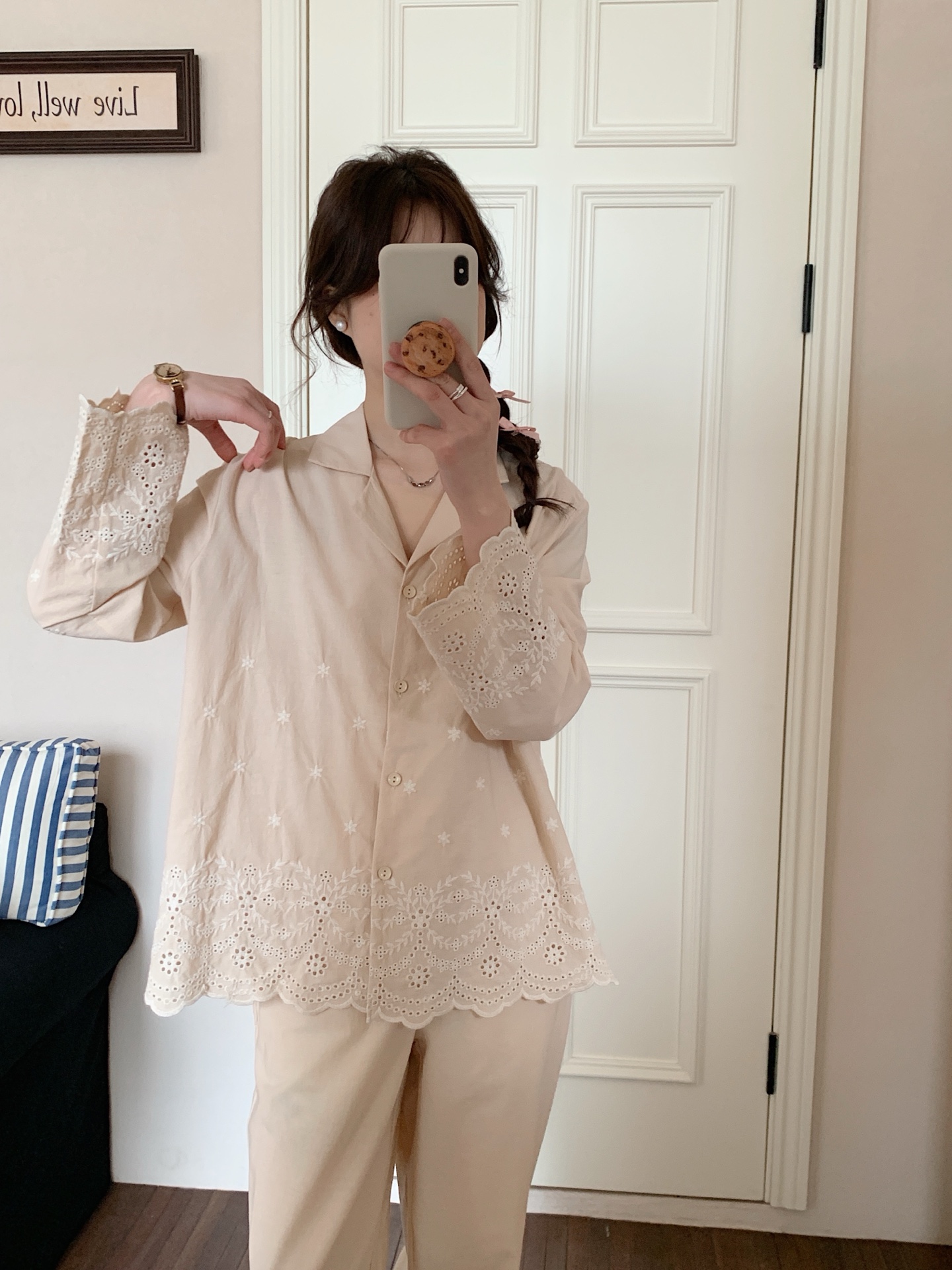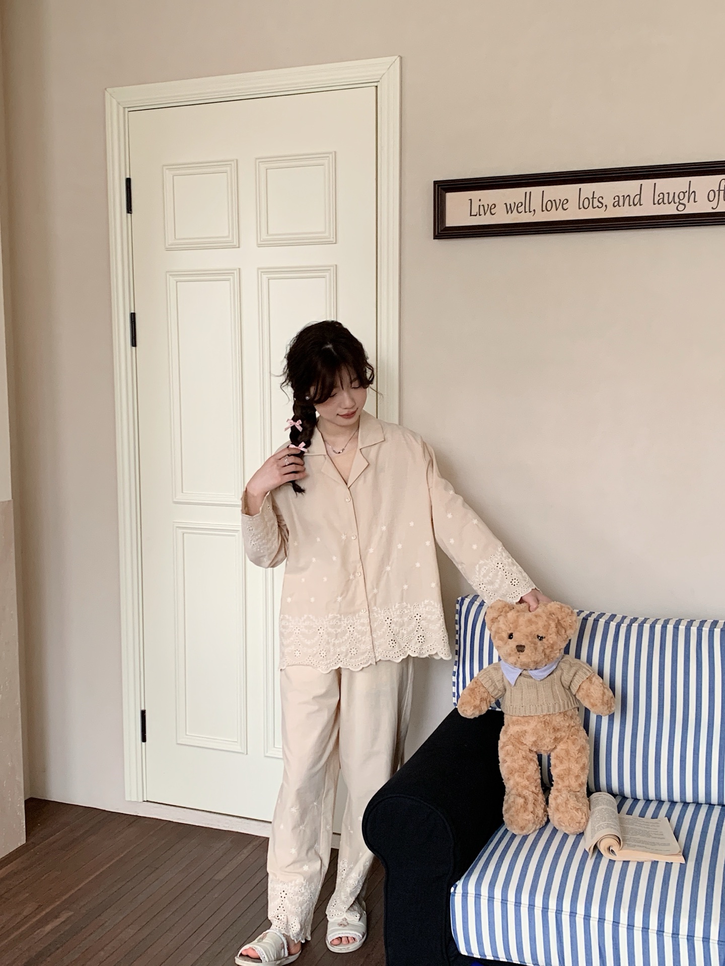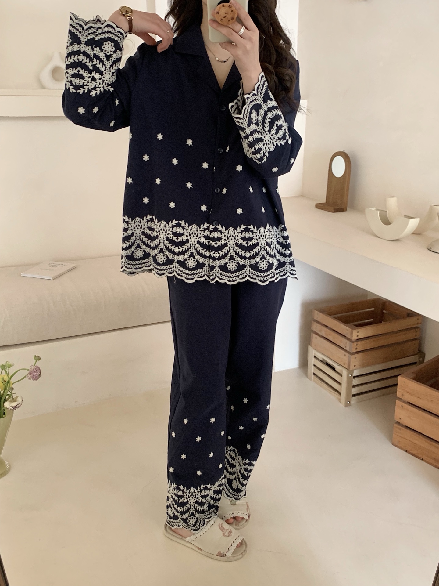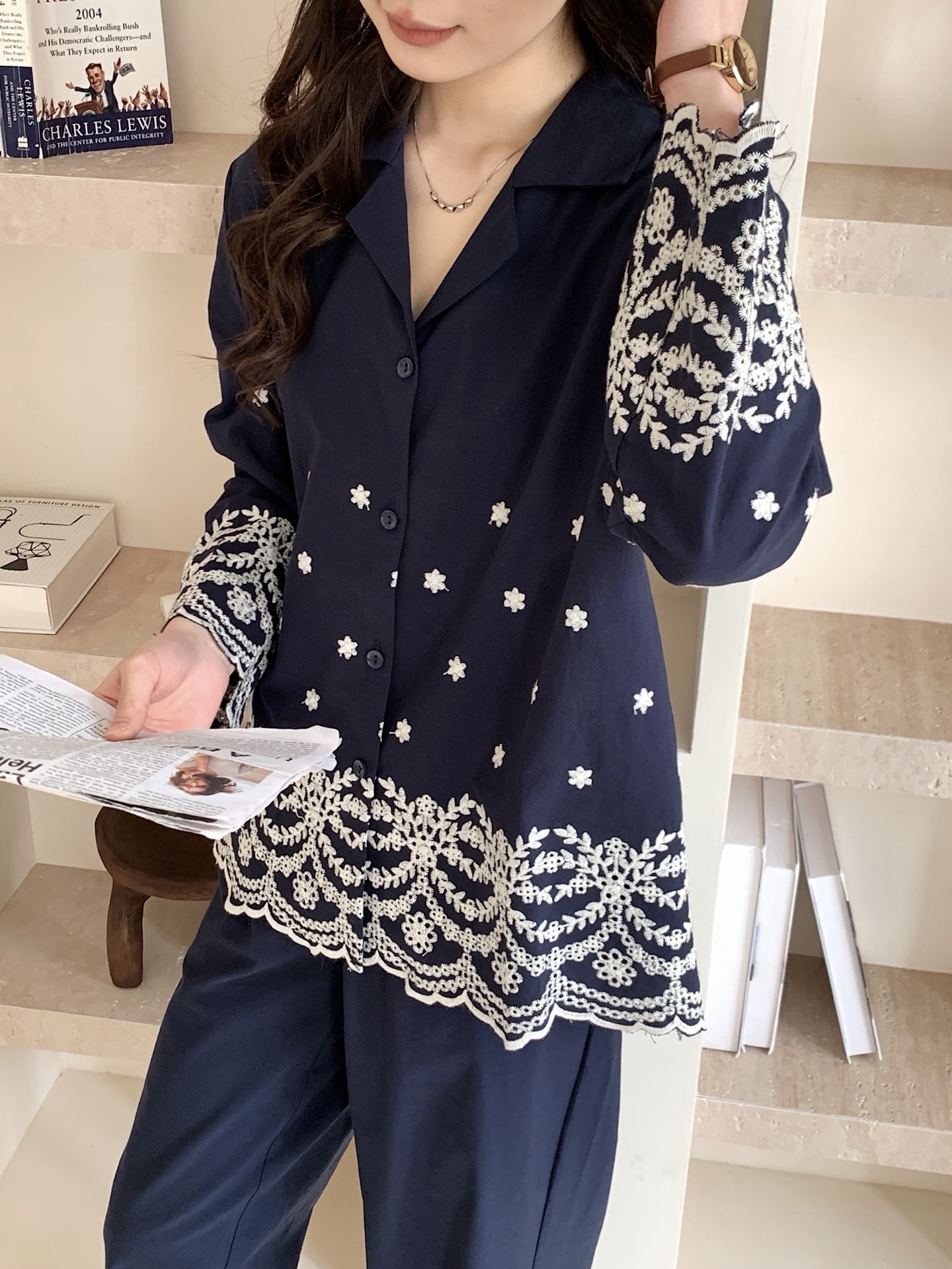 妍景家居生活馆 韩系25057-刺绣衬衫翻领套装 藏青