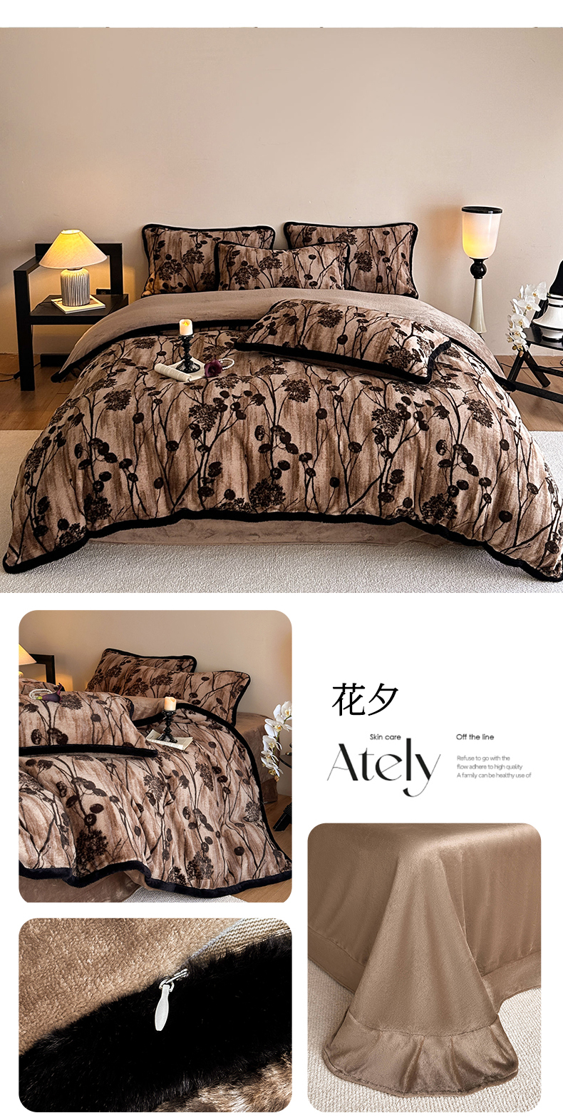 商品名称:铠畅 2025新款加厚8斤包边款美拉德仿兔毛皮草牛奶绒四件套 美拉德包边款-花夕