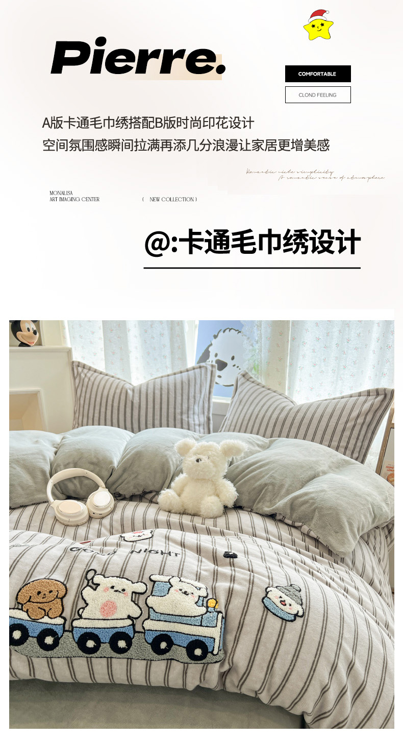 (总)倾慕家纺 2026新款全棉卡通毛巾绣系列四件套,彩虹马,格子小狗,欢乐企鹅,森林小熊,兔兔熊,小树恐龙,小兔女孩