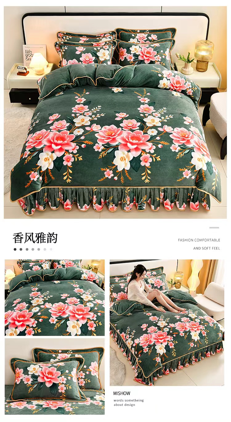 新8.5-9.5斤法莱绒四件套珊瑚牛奶金貂绒四件套床裙 香风雅韵