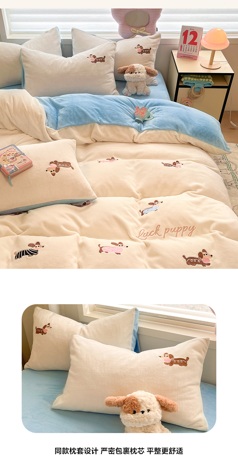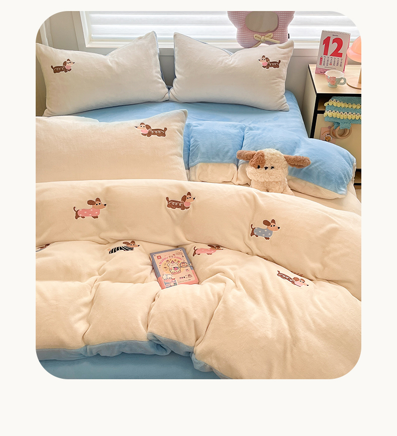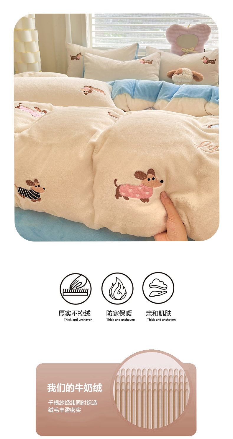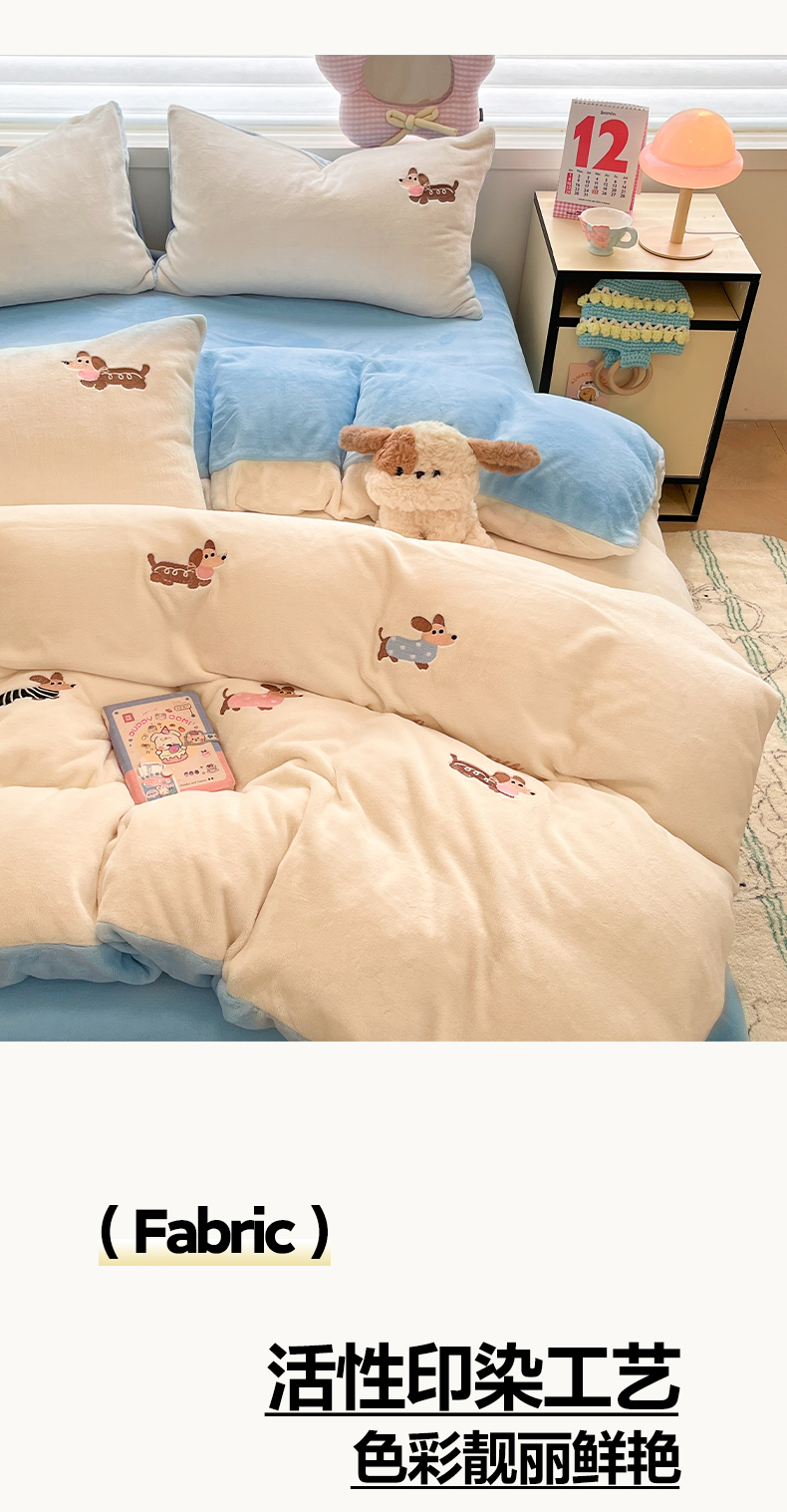 商品名称:如一 2025新款200克缸染高克重精绣牛奶绒四件套 绒-腊肠狗-白蓝