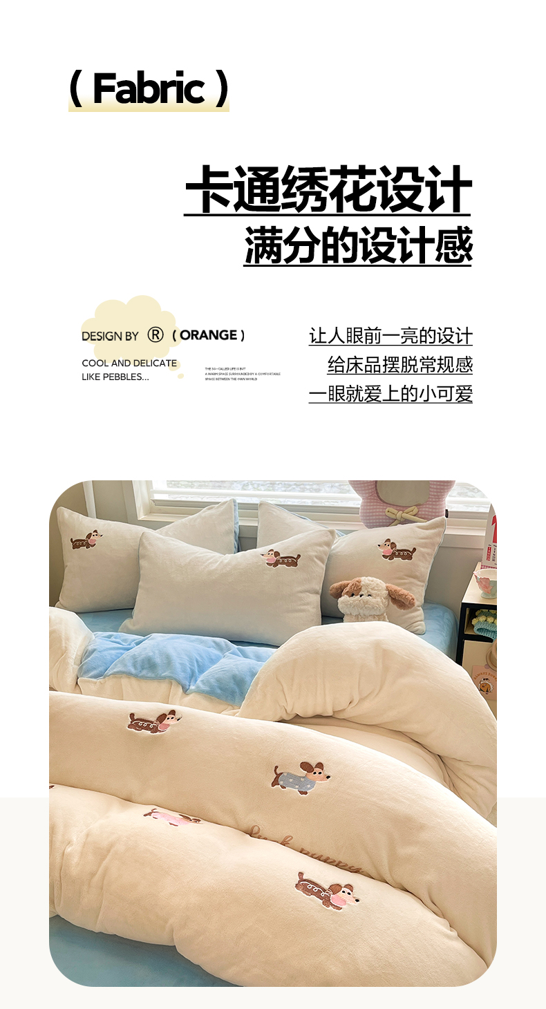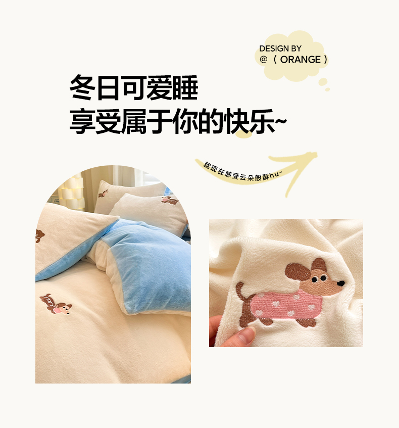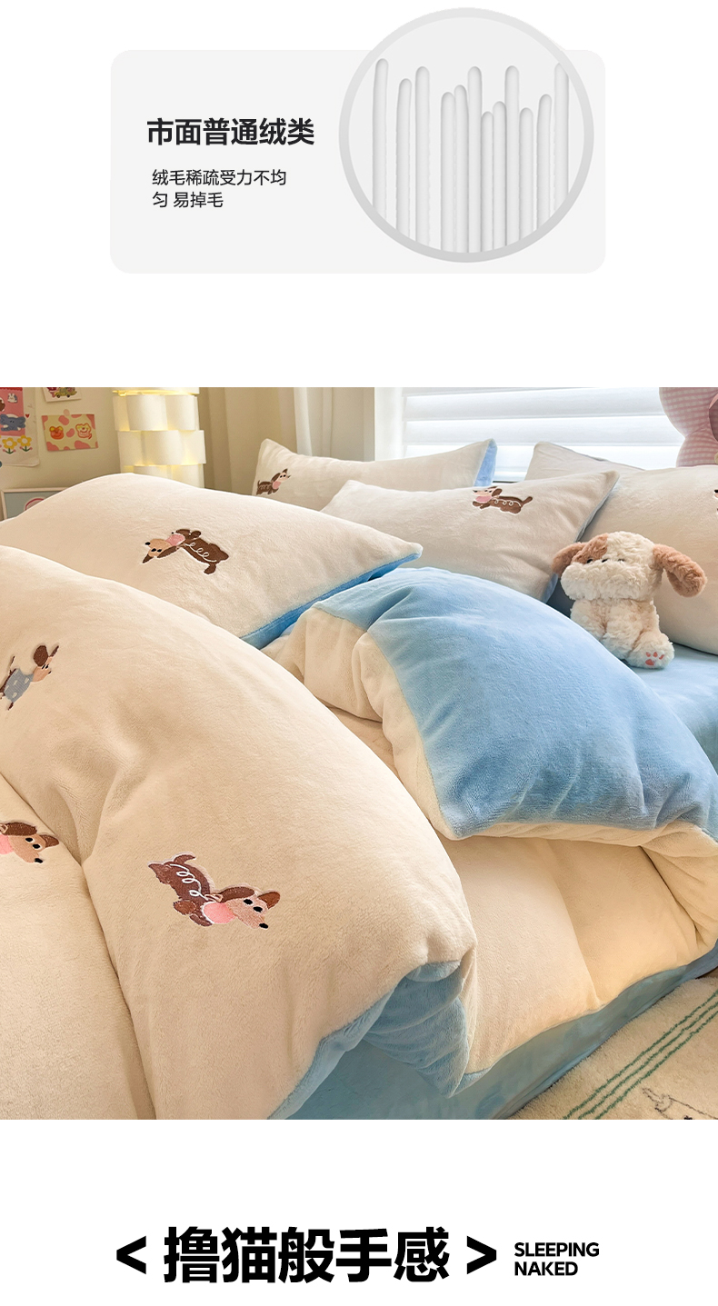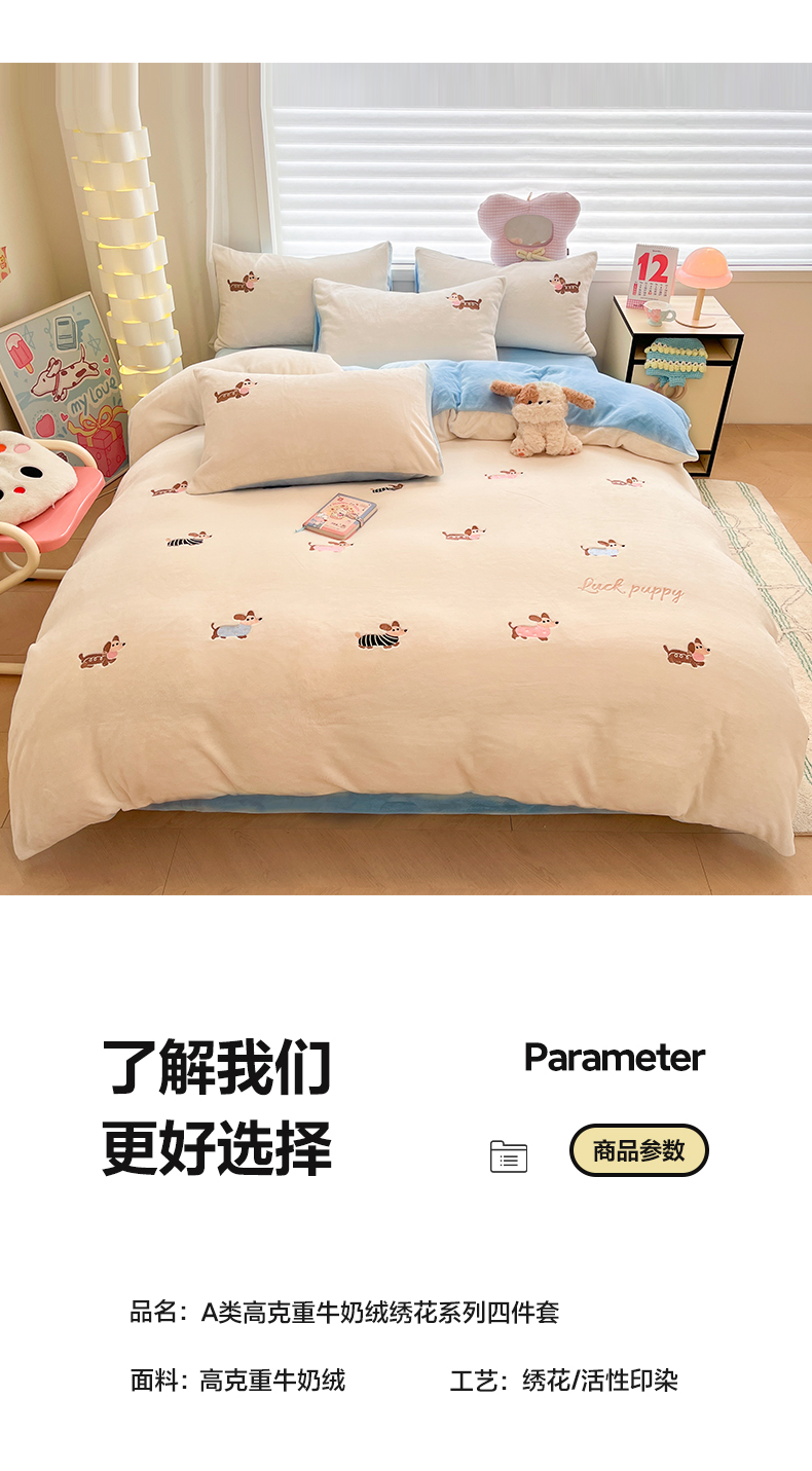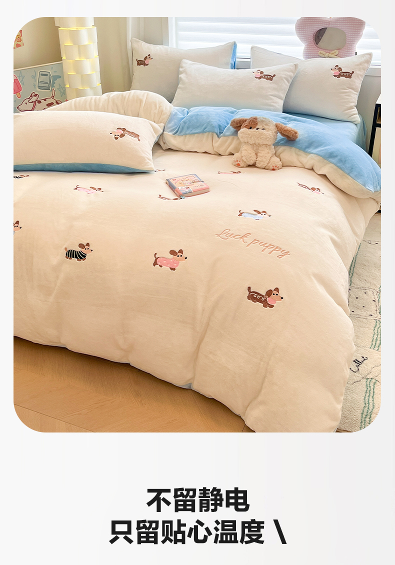 商品名称:如一 2025新款200克缸染高克重精绣牛奶绒四件套 绒-腊肠狗-白蓝