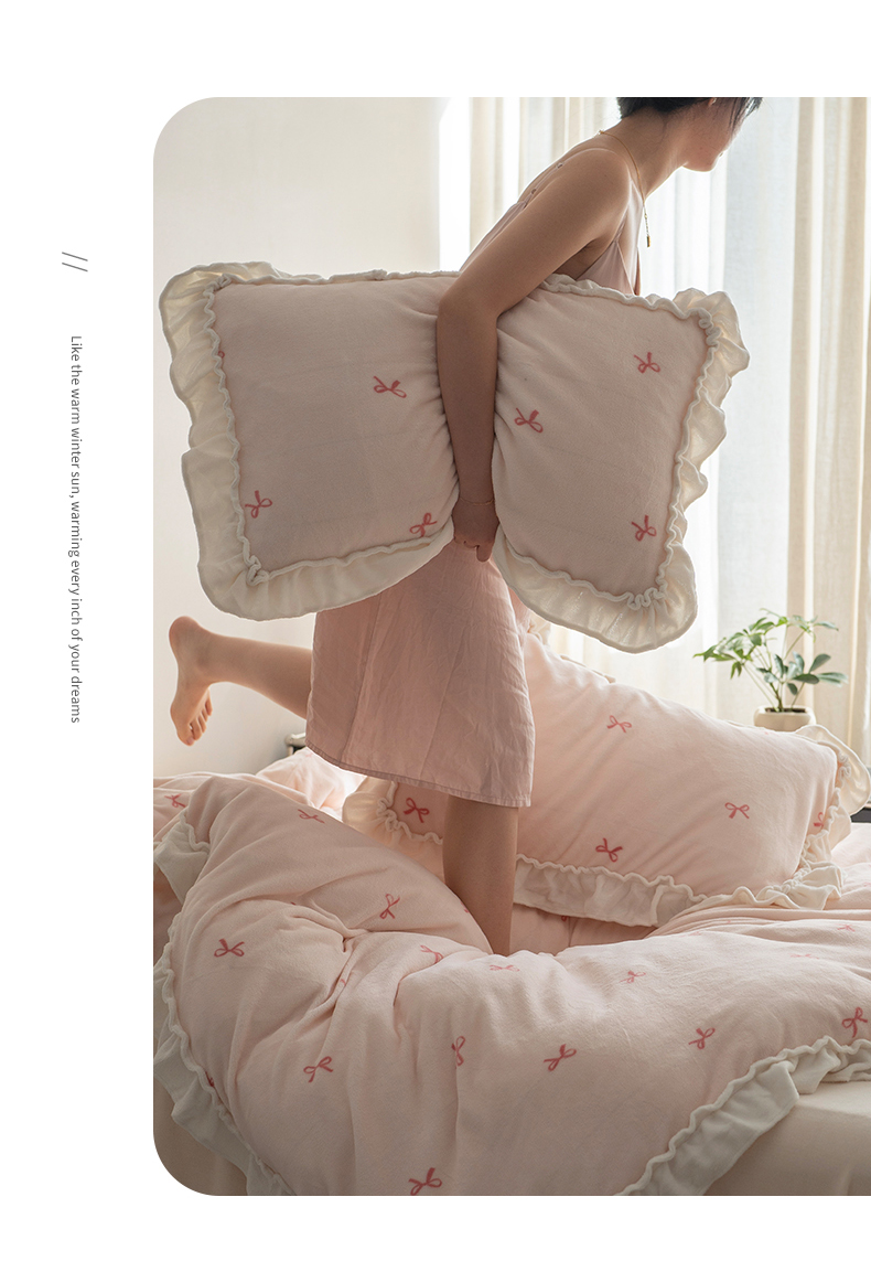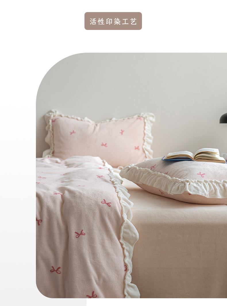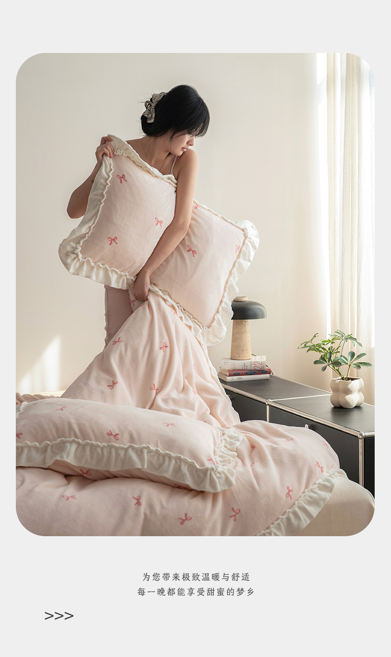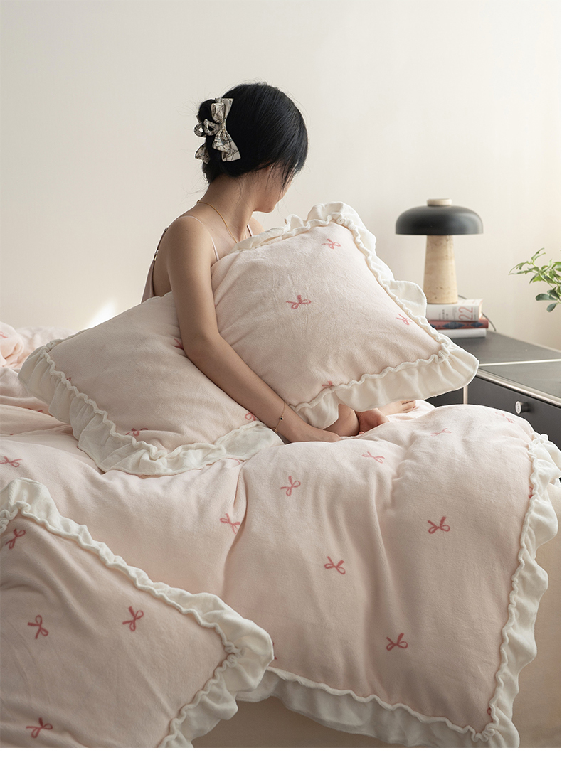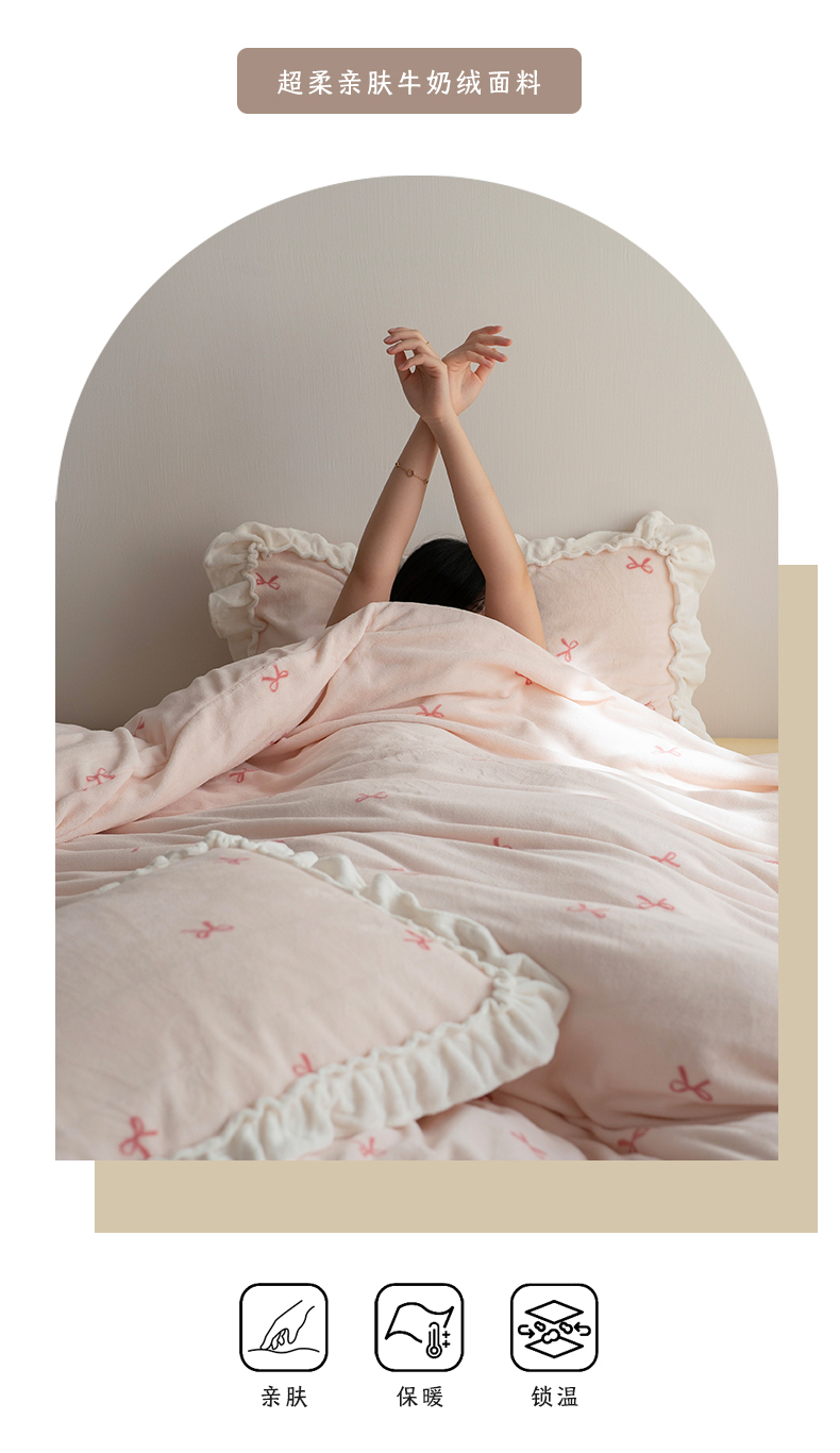 商品名称:尺素 2025年蝴蝶结花边牛奶绒四件套ins风公主花边被套冬季保暖床单双人1.8床笠 牛奶绒蝴蝶结(粉)