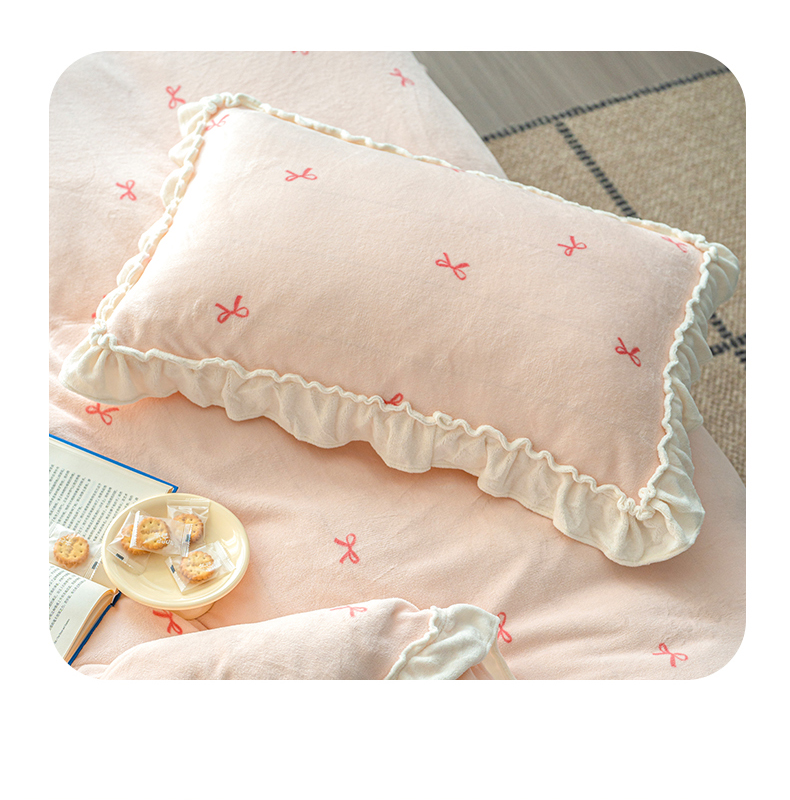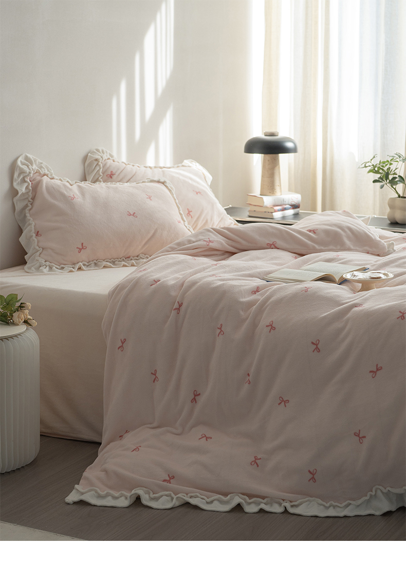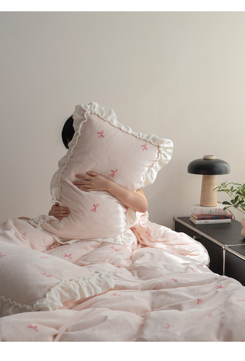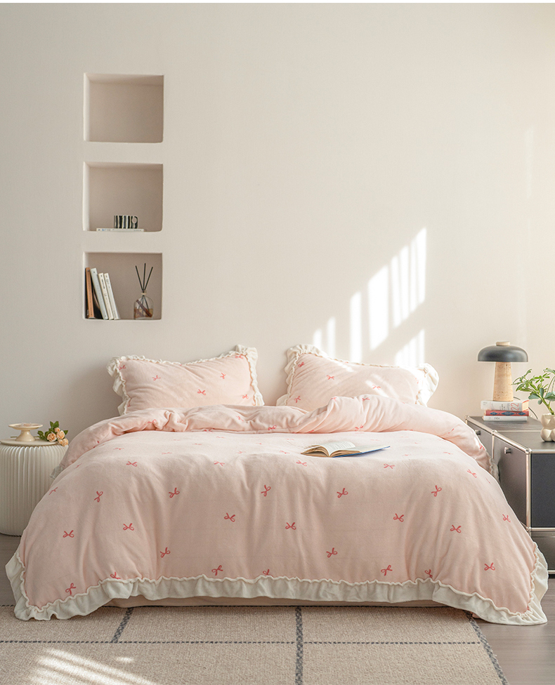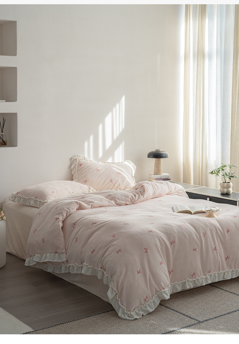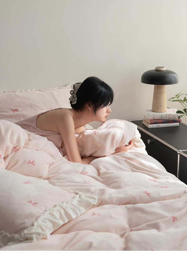 商品名称:尺素 2025年蝴蝶结花边牛奶绒四件套ins风公主花边被套冬季保暖床单双人1.8床笠 牛奶绒蝴蝶结(粉)