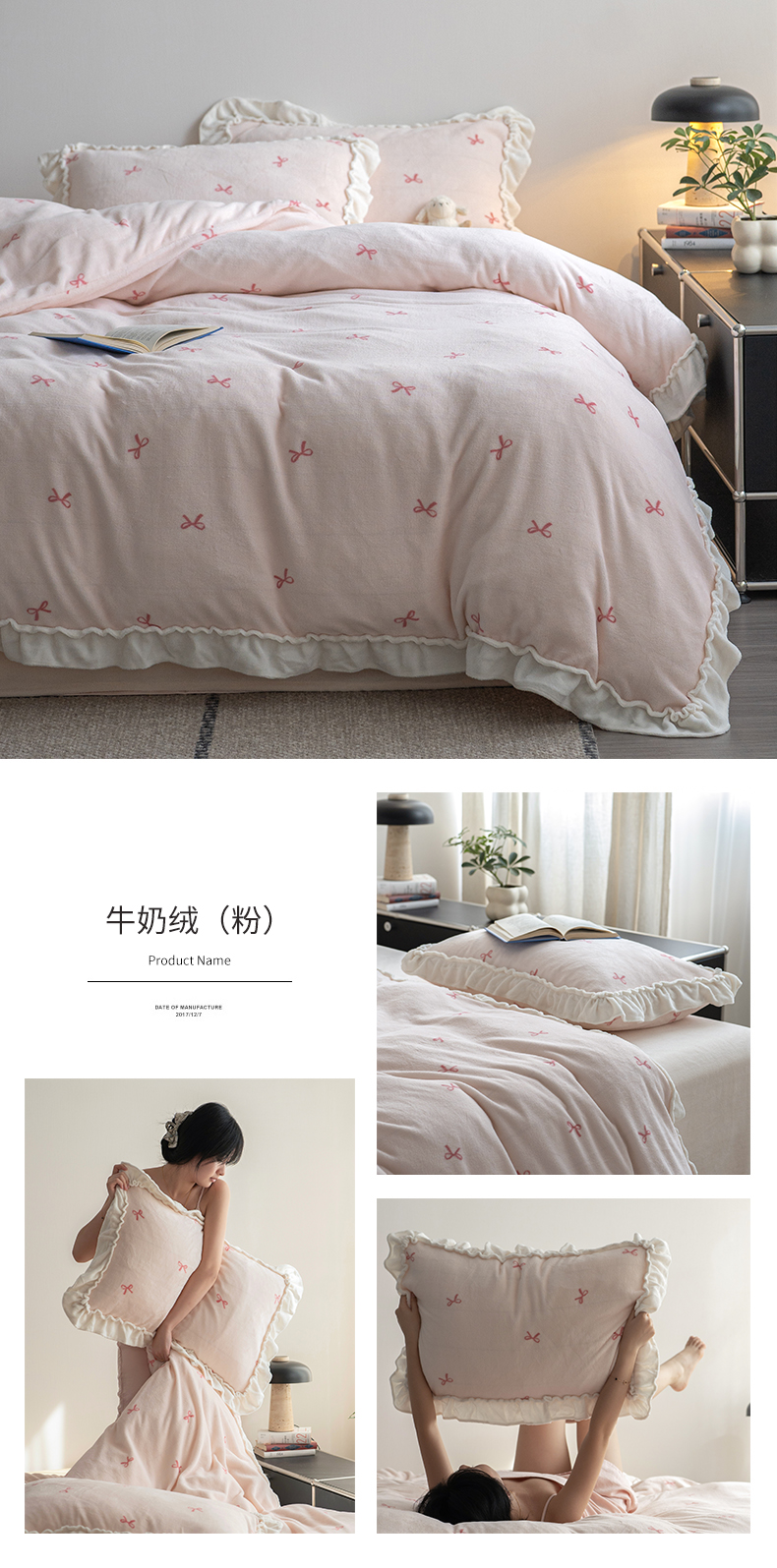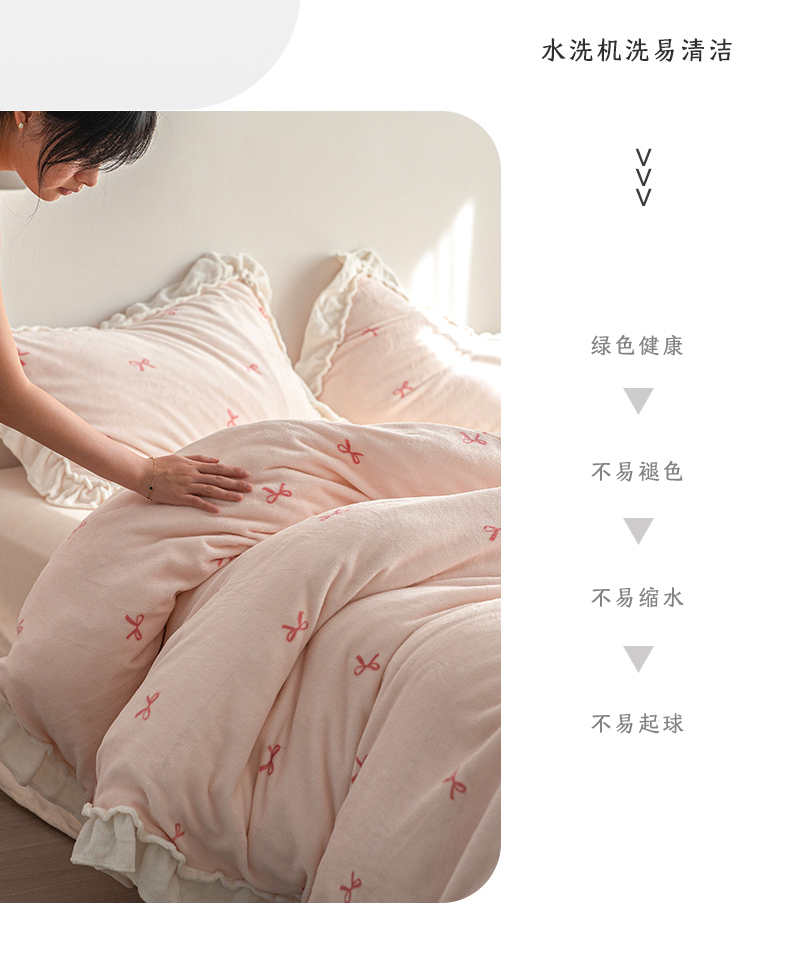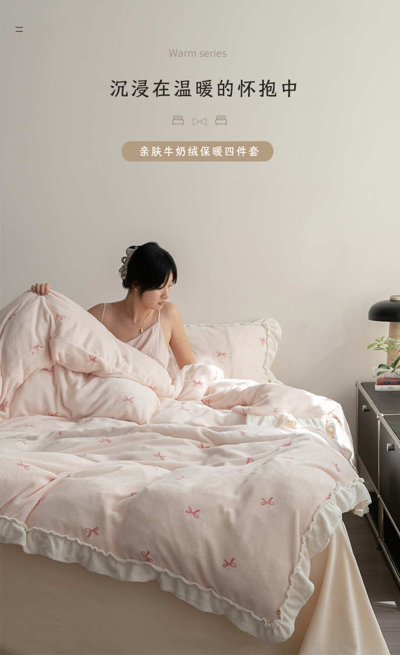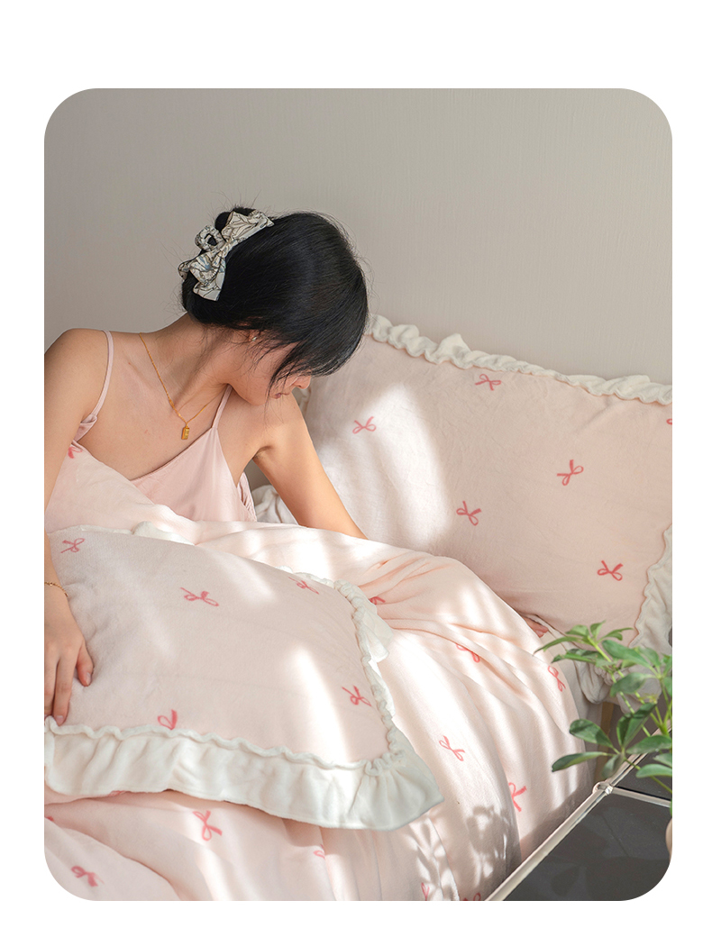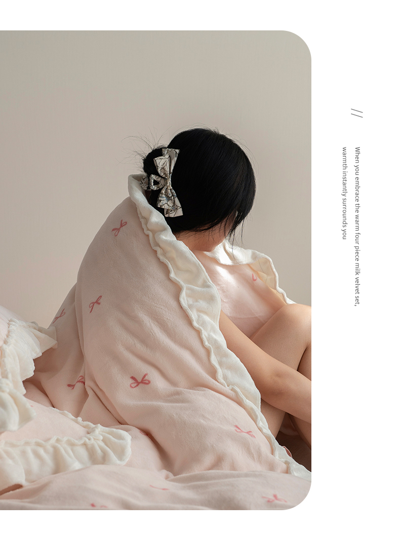 商品名称:尺素 2025年蝴蝶结花边牛奶绒四件套ins风公主花边被套冬季保暖床单双人1.8床笠 牛奶绒蝴蝶结(粉)