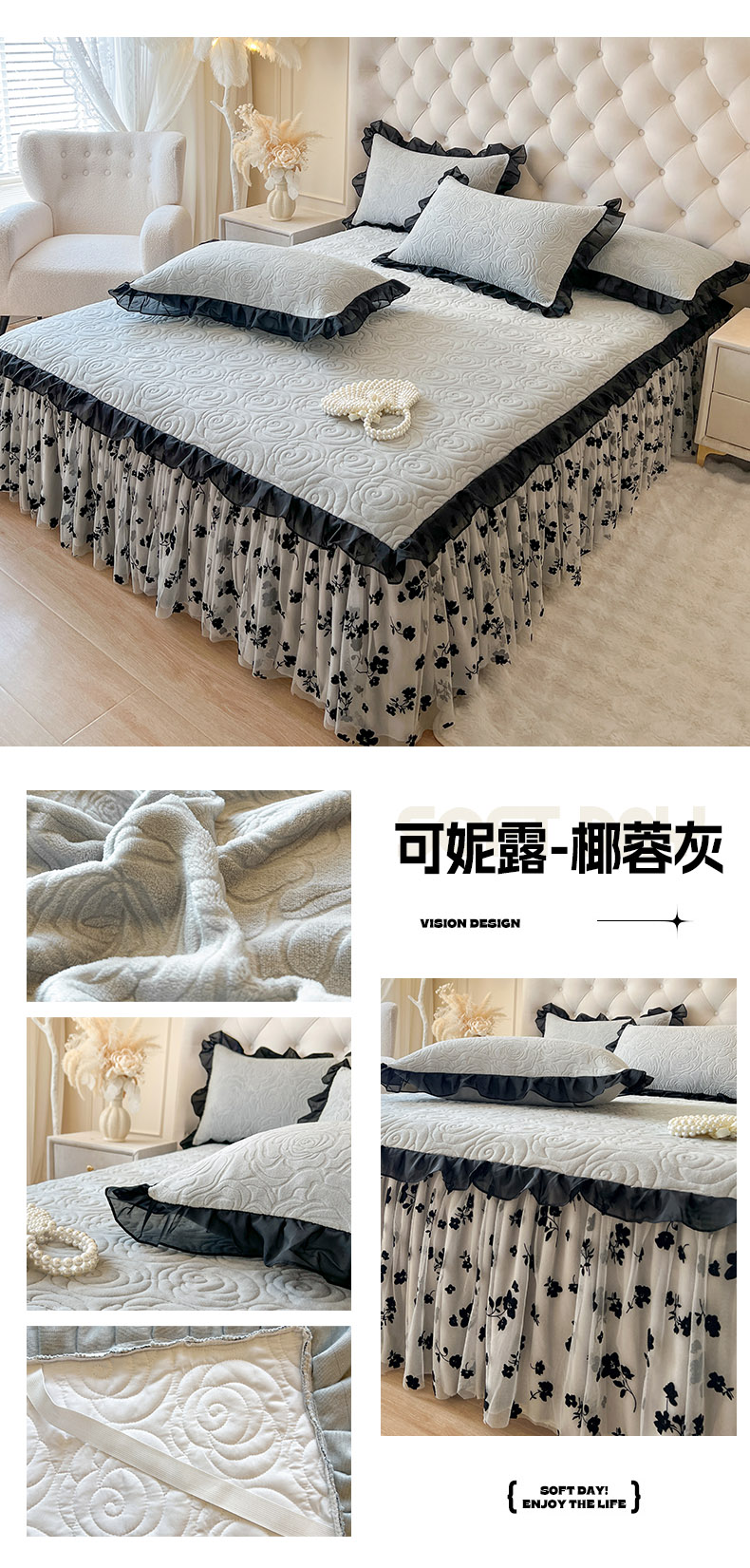 • 91家纺网 家纺一手货源 找家纺 (总)恋尚 2025新款柔软牛奶绒保暖蕾丝床裙四件套-玫瑰故事(控价305),玫瑰故事-蜜桃粉,玫瑰故事-奶茶色,玫瑰故事-椰蓉灰,玫瑰故事-香芋紫,玫瑰故事-清新粉,玫瑰故事-香草绿