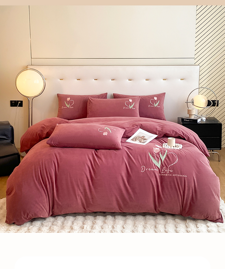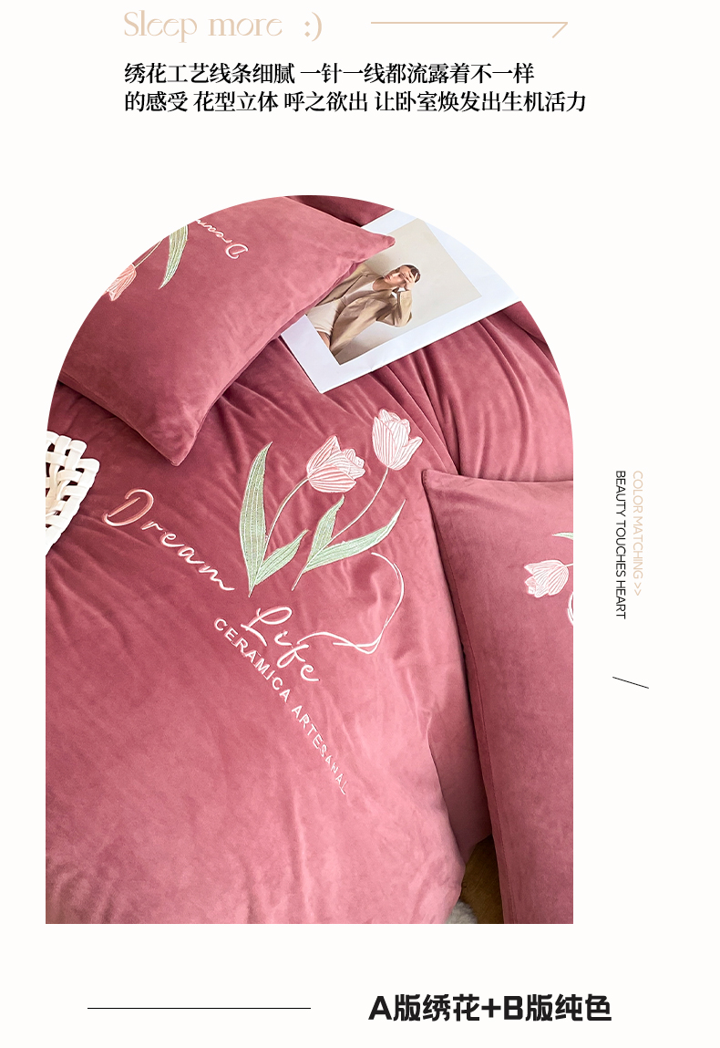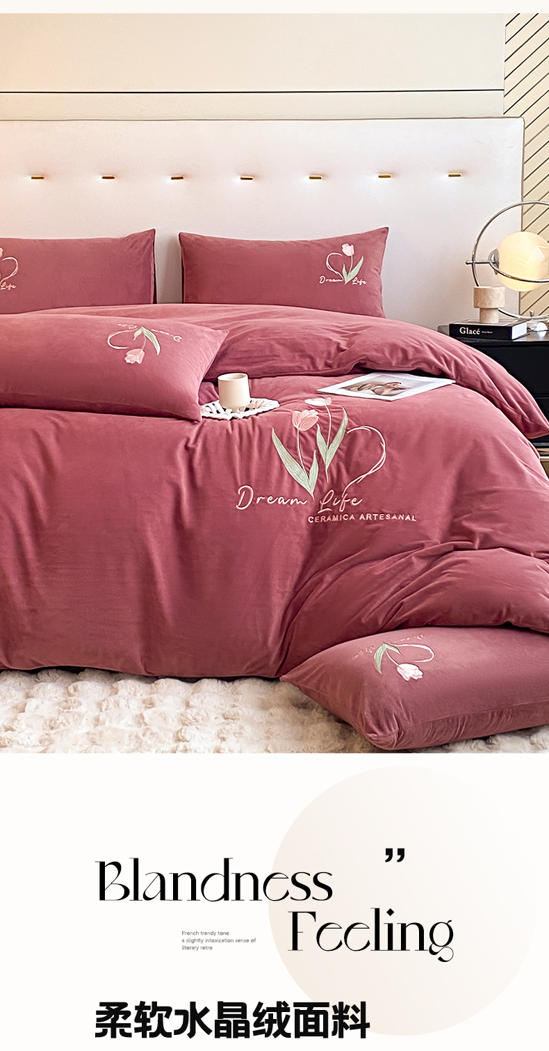 当前位置: 91家纺网 > 商品网购 > 床品套件 > 四件套 > 水晶绒四件套 > 如一 2025新款水晶绒双拼刺绣四件套-郁金香系列 郁金香-胭脂粉