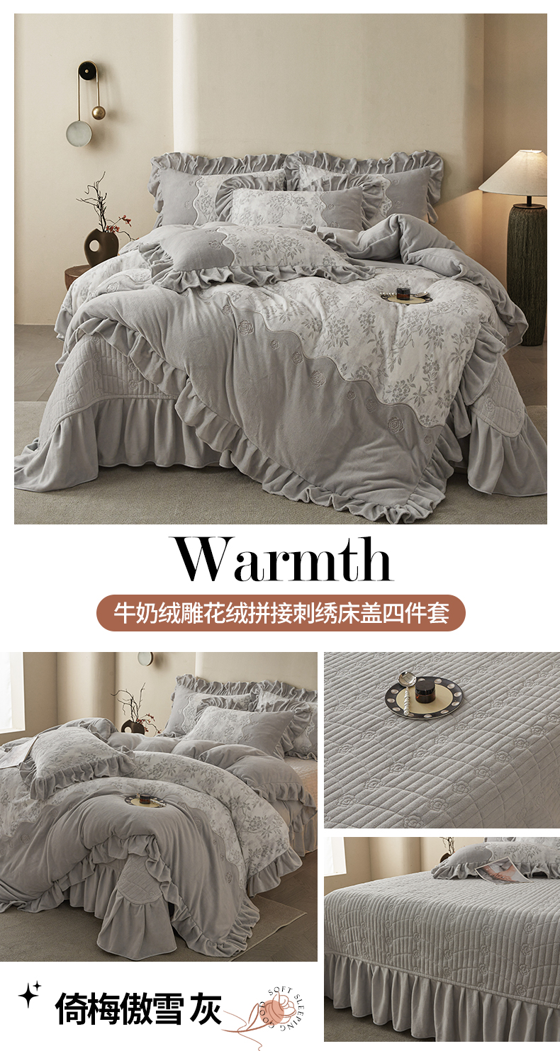 宜凡家纺 2025新款牛奶绒雕花刺绣床盖四件套 倚梅傲雪 灰