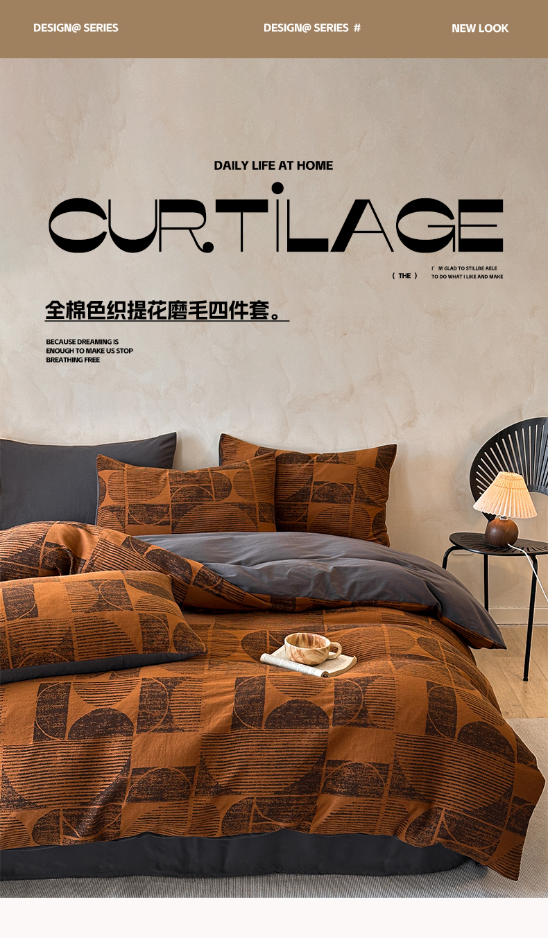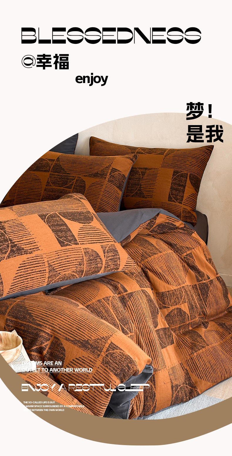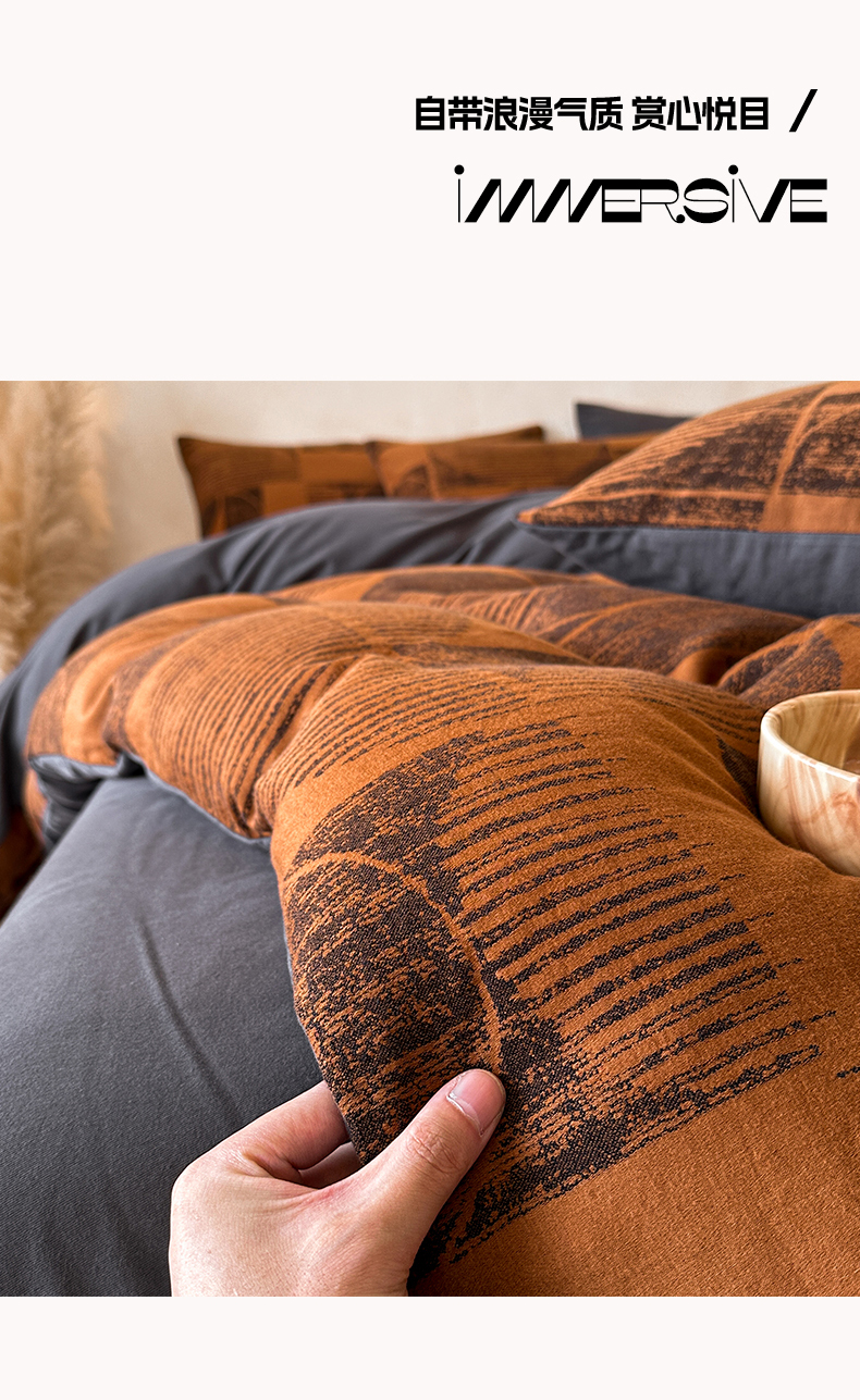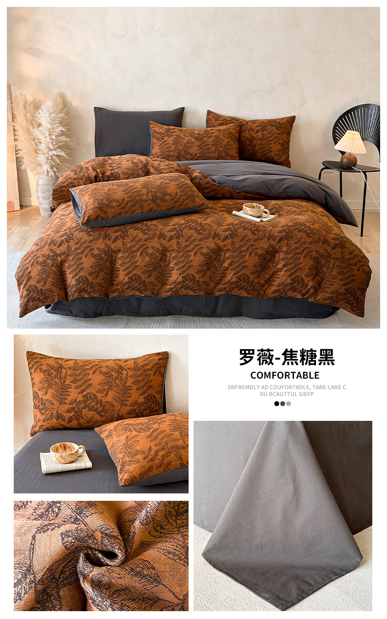 当前位置: 91家纺网 > 商品网购 > 床品套件 > 四件套 > 磨毛活性四件套 > 蓝邻家纺 2025年新款全棉色织提花磨毛四件套 梵沐-焦糖黑