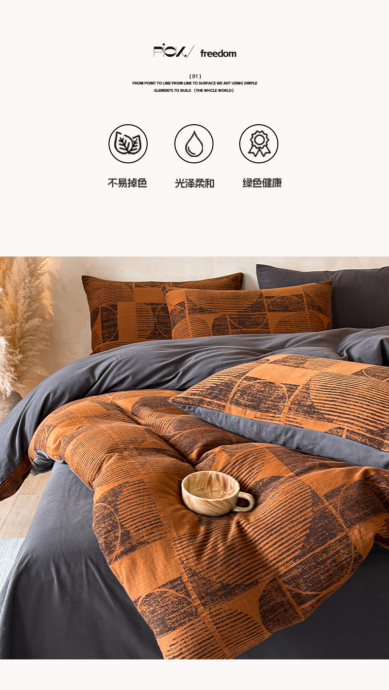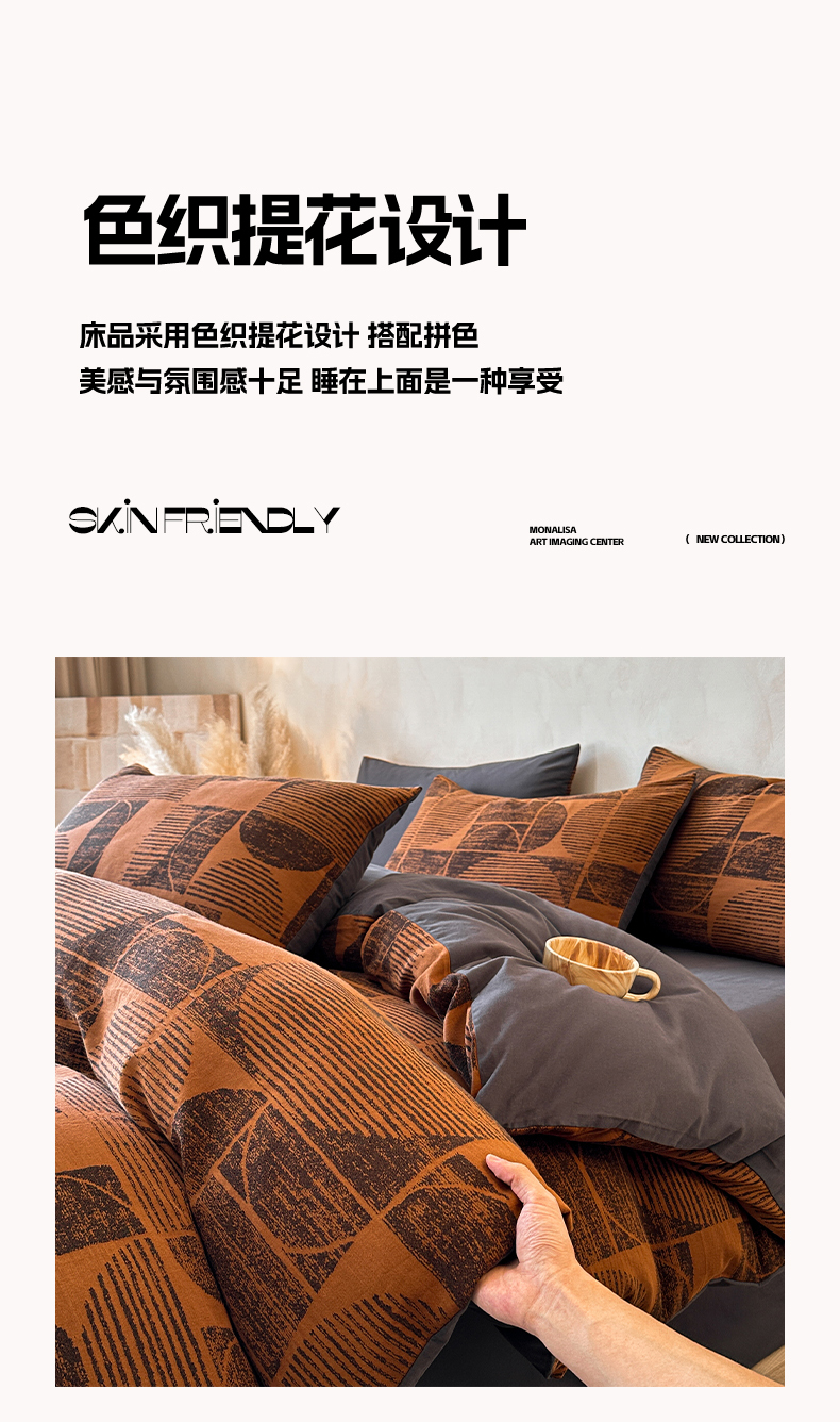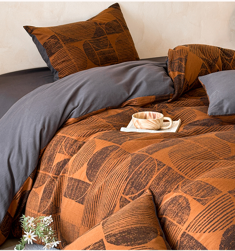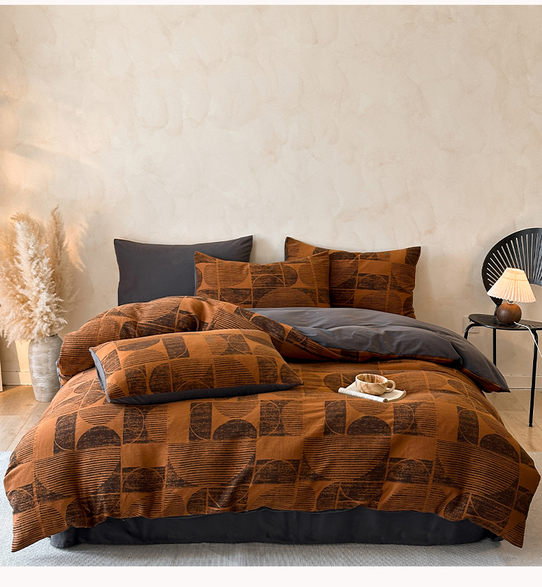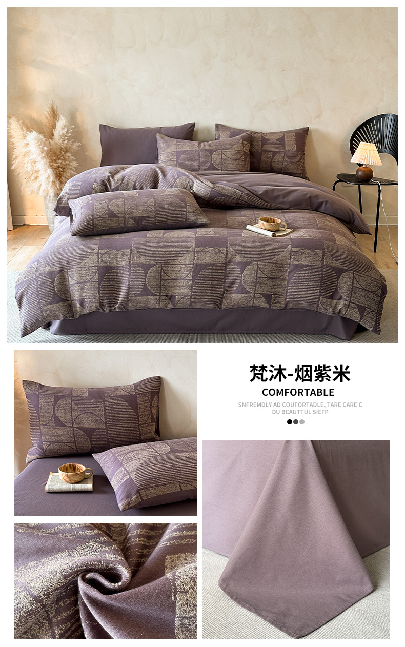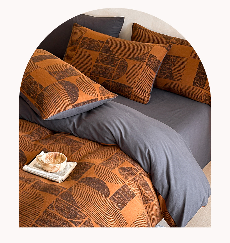当前位置: 91家纺网 > 商品网购 > 床品套件 > 四件套 > 磨毛活性四件套 > 蓝邻家纺 2025年新款全棉色织提花磨毛四件套 梵沐-焦糖黑