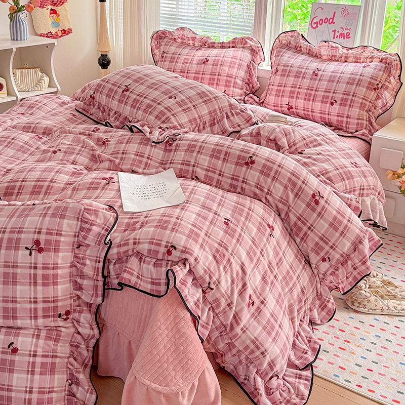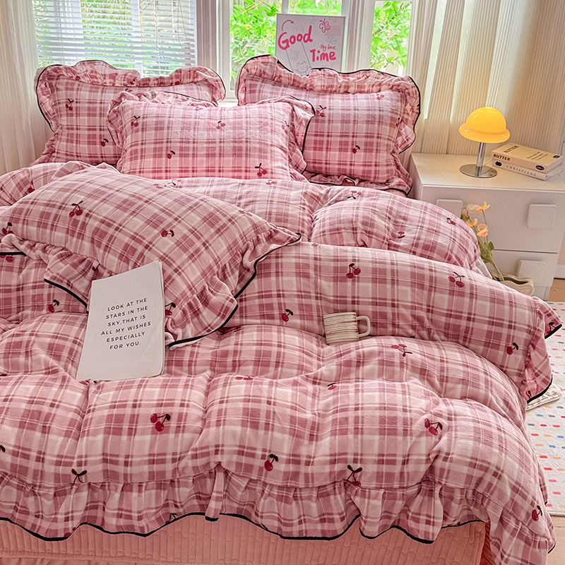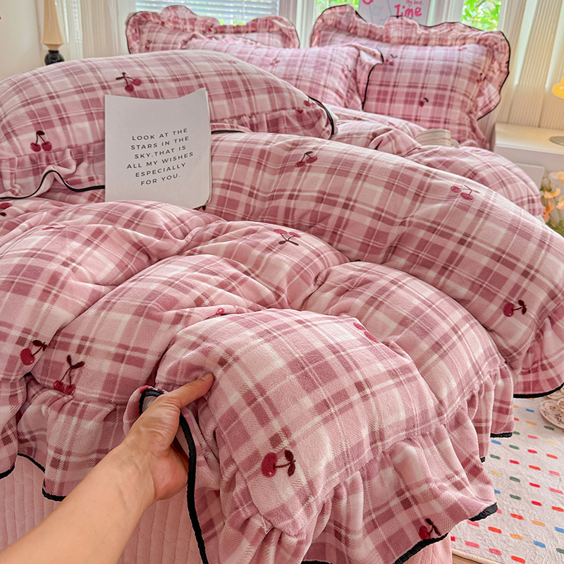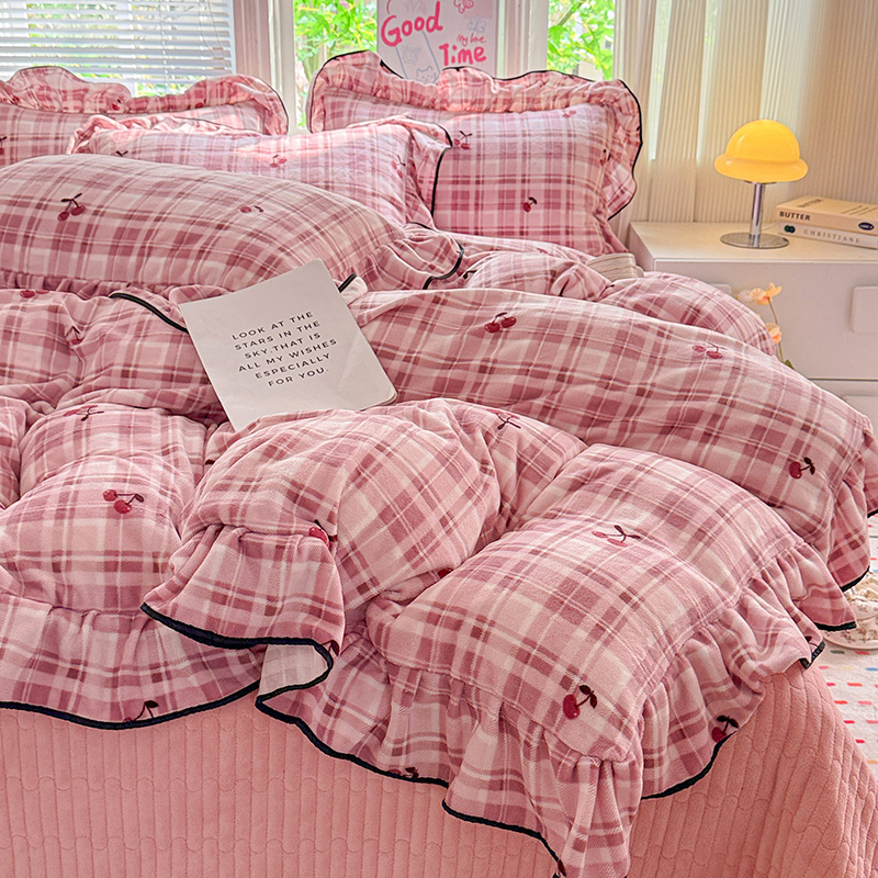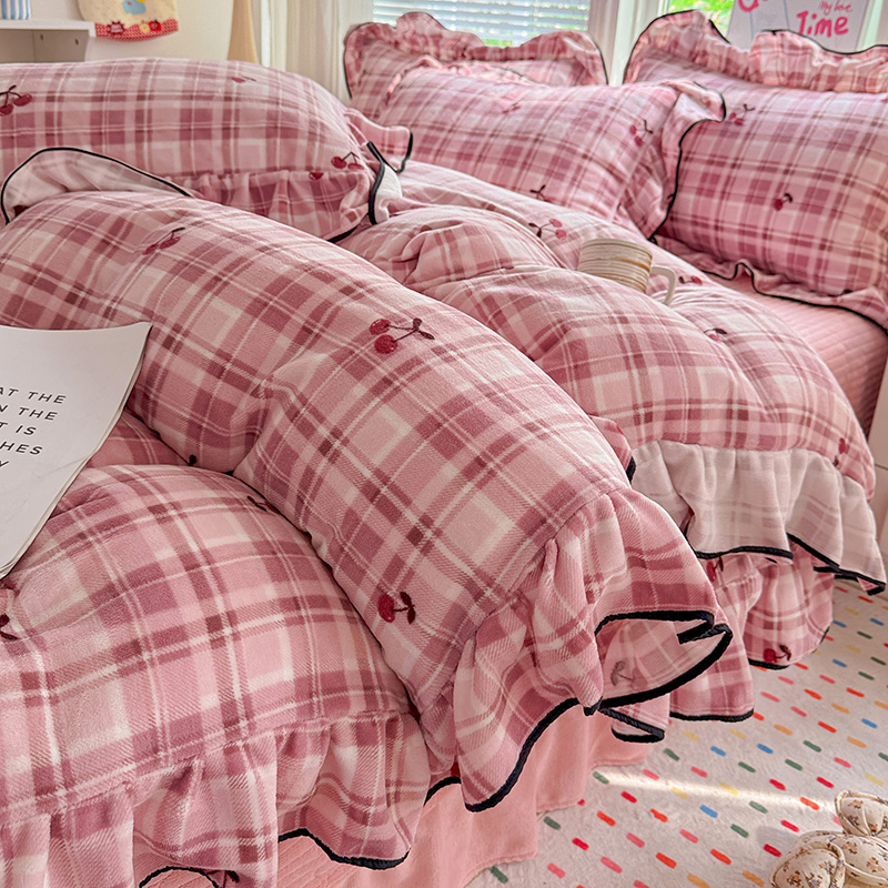 梦莱斯 2025新款加厚保暖双面牛奶绒四件套-黑色花边款 格子樱桃
